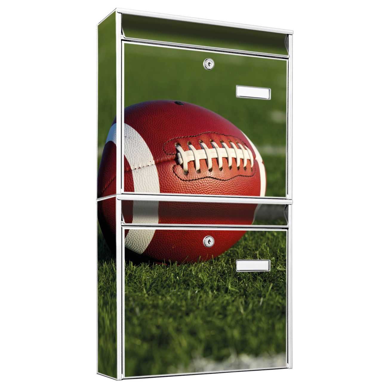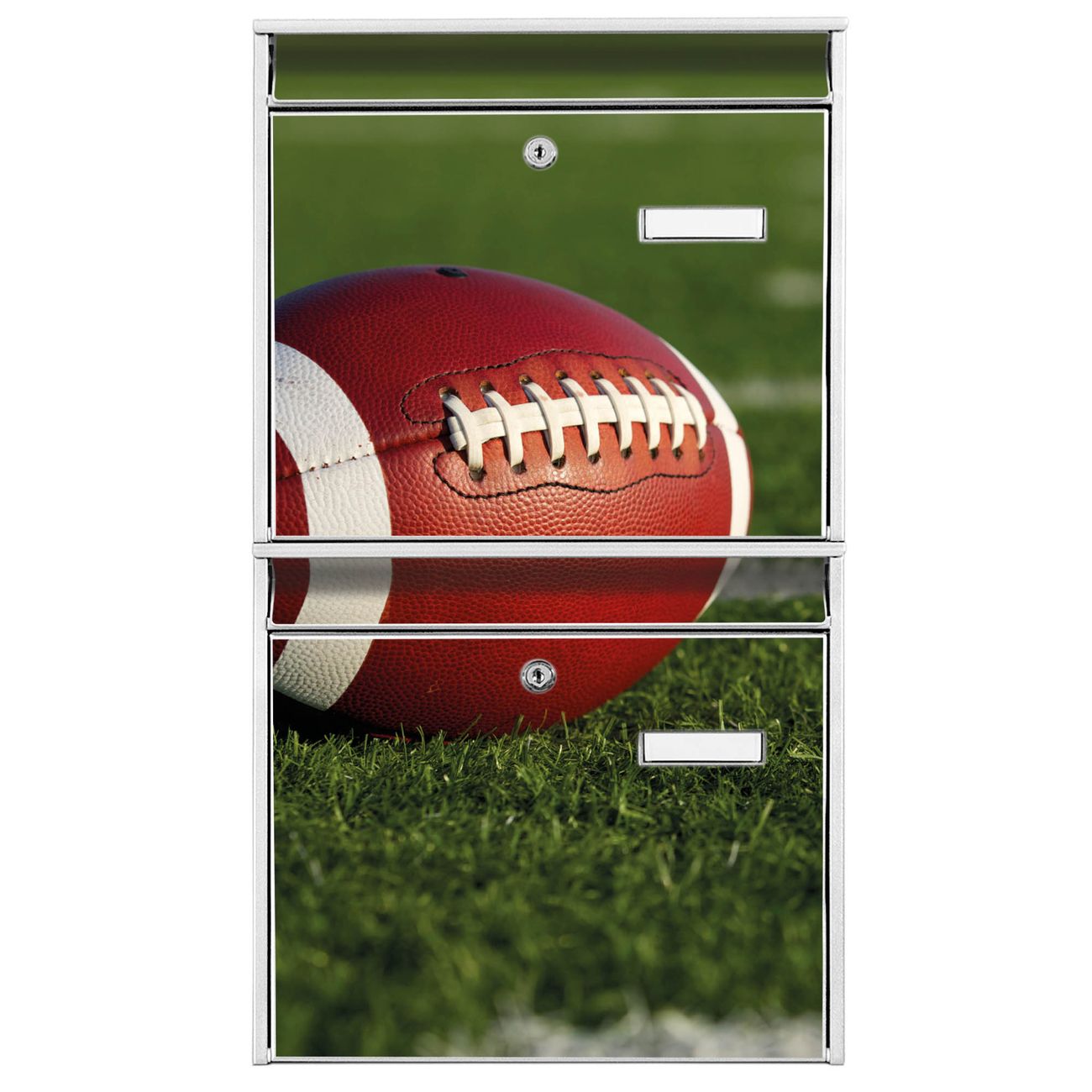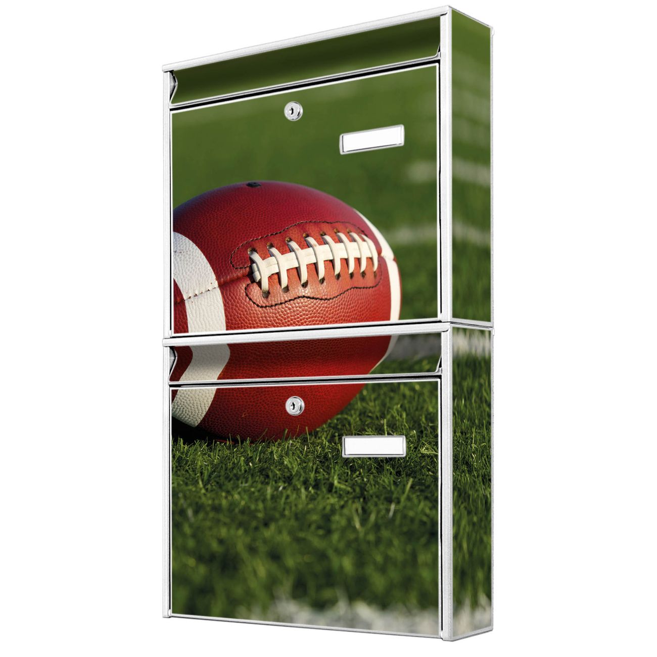 FUNKTION: Die Burg-Wächter Briefkastenanlage mit Motiv Football bietet Ihnen ausreichend Fassungsvermögen um auch A4 und C4 Sendungen zu empfangen. Das integrierte Namensschild lässt sich individuell beschriften. Wählen Sie aus den Grundfarben weiß, silber und schwarz. DESIGN: Die 2 Briefkästen haben ein ansprechendes und zeitloses Design, ohne dabei auf Funktionalität zu verzichten. Das Material ist sehr stabil, wetterfest und rostfrei. Durch das Motiv Football werden die Postkästen zu einem Blickfang. DETAILS: Die Postkästen bestehen aus verzinktem Stahl der zusätzlich mit Klarlack versiegelt wurde. Die Kästen sind gesamt 64,5cm hoch, 36,2cm breit und 10cm tief. Das Motiv besteht aus einer wetter- und UV-festen Folie, die Ihren Briefkasten zusätzlich vor Kratzern schützt. Die Postkästen werden mit Montagematerial, je einem Namensschild und je zwei Schlüsseln geliefert. NUTZEN: Das Briefkastenset eignet sich für die Wandmontage, die Größe bietet genügend Platz für Sendungen aller Art. Das zeitlose Design sowie die stabile Bauart bieten Ihnen einen treuen Begleiter für Ihre Post. BANJADO: