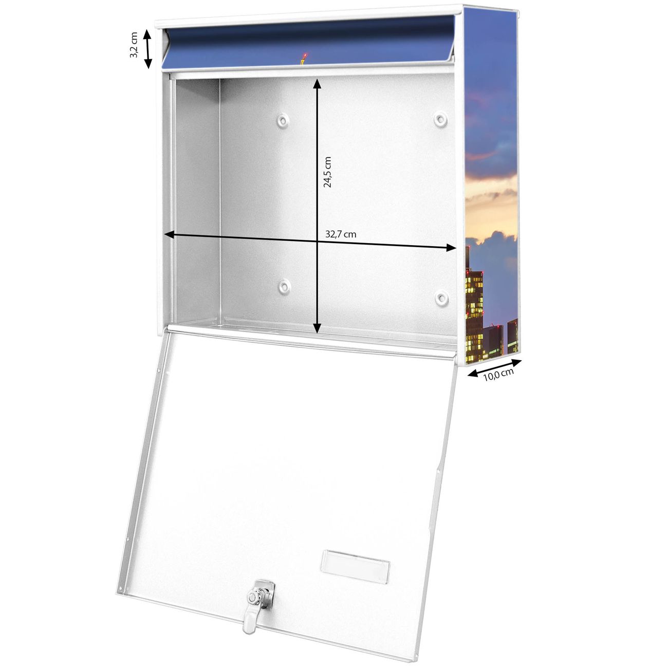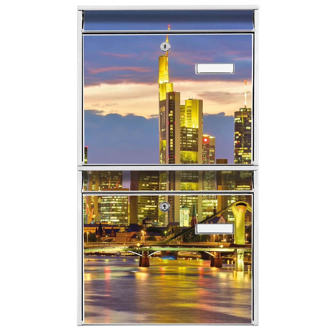 FUNKTION: Die Burg-Wächter Briefkastenanlage mit Motiv Frankfurt Main bietet Ihnen ausreichend Fassungsvermögen um auch A4 und C4 Sendungen zu empfangen. Das integrierte Namensschild lässt sich individuell beschriften. Wählen Sie aus den Grundfarben weiß, silber und schwarz. DESIGN: Die 2 Briefkästen haben ein ansprechendes und zeitloses Design, ohne dabei auf Funktionalität zu verzichten. Das Material ist sehr stabil, wetterfest und rostfrei. Durch das Motiv Frankfurt Main werden die Postkästen zu einem Blickfang. DETAILS: Die Postkästen bestehen aus verzinktem Stahl der zusätzlich mit Klarlack versiegelt wurde. Die Kästen sind gesamt 64,5cm hoch, 36,2cm breit und 10cm tief. Das Motiv besteht aus einer wetter- und UV-festen Folie, die Ihren Briefkasten zusätzlich vor Kratzern schützt. Die Postkästen werden mit Montagematerial, je einem Namensschild und je zwei Schlüsseln geliefert. NUTZEN: Das Briefkastenset eignet sich für die Wandmontage, die Größe bietet genügend Platz für Sendungen aller Art. Das zeitlose Design sowie die stabile Bauart bieten Ihnen einen treuen Begleiter für Ihre Post. BANJADO:
