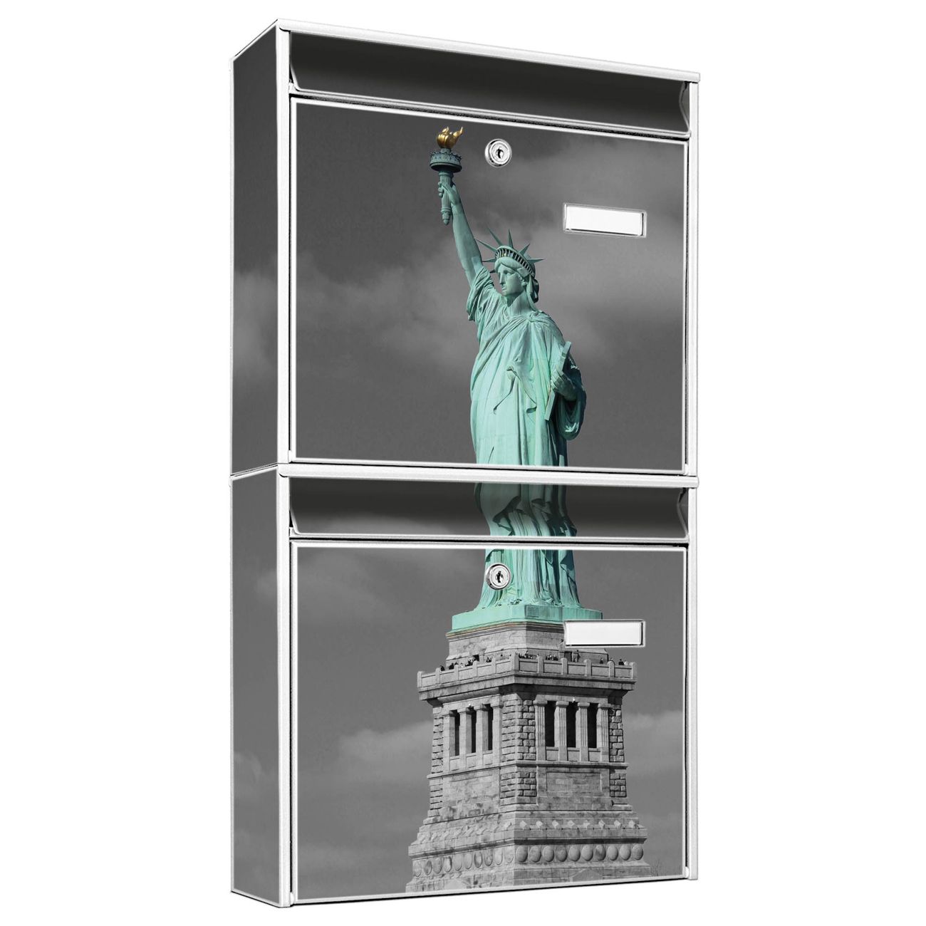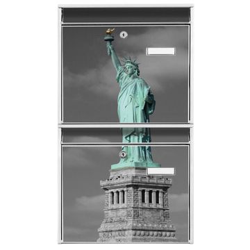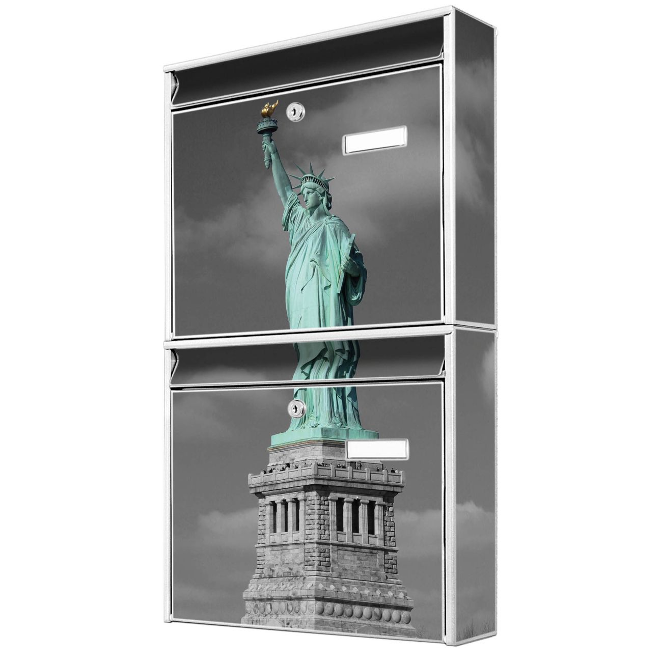 FUNKTION: Die Burg-Wächter Briefkastenanlage mit Motiv Freiheitsstatue bietet Ihnen ausreichend Fassungsvermögen um auch A4 und C4 Sendungen zu empfangen. Das integrierte Namensschild lässt sich individuell beschriften. Wählen Sie aus den Grundfarben weiß, silber und schwarz. DESIGN: Die 2 Briefkästen haben ein ansprechendes und zeitloses Design, ohne dabei auf Funktionalität zu verzichten. Das Material ist sehr stabil, wetterfest und rostfrei. Durch das Motiv Freiheitsstatue werden die Postkästen zu einem Blickfang. DETAILS: Die Postkästen bestehen aus verzinktem Stahl der zusätzlich mit Klarlack versiegelt wurde. Die Kästen sind gesamt 64,5cm hoch, 36,2cm breit und 10cm tief. Das Motiv besteht aus einer wetter- und UV-festen Folie, die Ihren Briefkasten zusätzlich vor Kratzern schützt. Die Postkästen werden mit Montagematerial, je einem Namensschild und je zwei Schlüsseln geliefert. NUTZEN: Das Briefkastenset eignet sich für die Wandmontage, die Größe bietet genügend Platz für Sendungen aller Art. Das zeitlose Design sowie die stabile Bauart bieten Ihnen einen treuen Begleiter für Ihre Post. BANJADO: