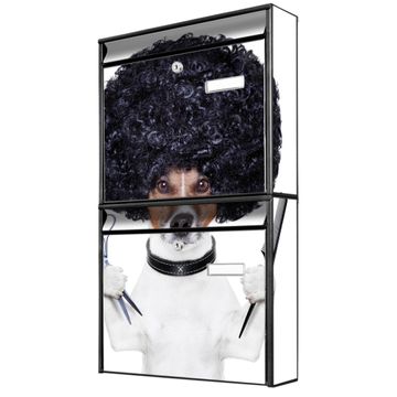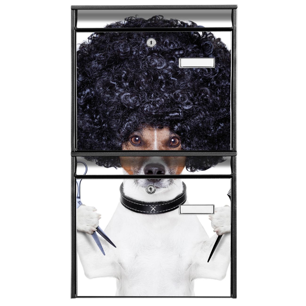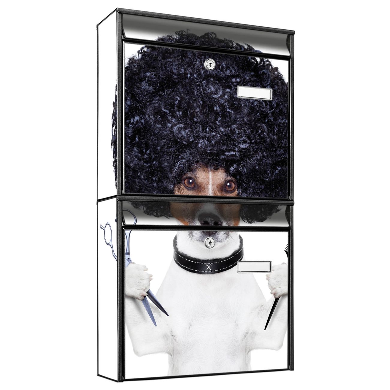 FUNKTION: Die Burg-Wächter Briefkastenanlage mit Motiv Friseur Jack Russel bietet Ihnen ausreichend Fassungsvermögen um auch A4 und C4 Sendungen zu empfangen. Das integrierte Namensschild lässt sich individuell beschriften. Wählen Sie aus den Grundfarben weiß, silber und schwarz. DESIGN: Die 2 Briefkästen haben ein ansprechendes und zeitloses Design, ohne dabei auf Funktionalität zu verzichten. Das Material ist sehr stabil, wetterfest und rostfrei. Durch das Motiv Friseur Jack Russel werden die Postkästen zu einem Blickfang. DETAILS: Die Postkästen bestehen aus verzinktem Stahl der zusätzlich mit Klarlack versiegelt wurde. Die Kästen sind gesamt 64,5cm hoch, 36,2cm breit und 10cm tief. Das Motiv besteht aus einer wetter- und UV-festen Folie, die Ihren Briefkasten zusätzlich vor Kratzern schützt. Die Postkästen werden mit Montagematerial, je einem Namensschild und je zwei Schlüsseln geliefert. NUTZEN: Das Briefkastenset eignet sich für die Wandmontage, die Größe bietet genügend Platz für Sendungen aller Art. Das zeitlose Design sowie die stabile Bauart bieten Ihnen einen treuen Begleiter für Ihre Post. BANJADO: