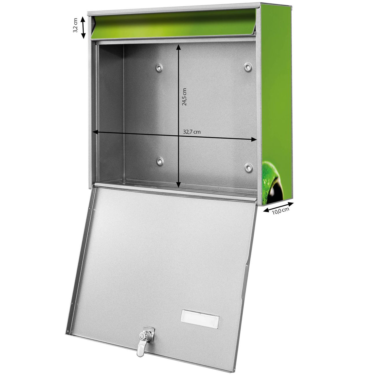 FUNKTION: Die Burg-Wächter Briefkastenanlage mit Motiv Frosch bietet Ihnen ausreichend Fassungsvermögen um auch A4 und C4 Sendungen zu empfangen. Das integrierte Namensschild lässt sich individuell beschriften. Wählen Sie aus den Grundfarben weiß, silber und schwarz. DESIGN: Die 2 Briefkästen haben ein ansprechendes und zeitloses Design, ohne dabei auf Funktionalität zu verzichten. Das Material ist sehr stabil, wetterfest und rostfrei. Durch das Motiv Frosch werden die Postkästen zu einem Blickfang. DETAILS: Die Postkästen bestehen aus verzinktem Stahl der zusätzlich mit Klarlack versiegelt wurde. Die Kästen sind gesamt 64,5cm hoch, 36,2cm breit und 10cm tief. Das Motiv besteht aus einer wetter- und UV-festen Folie, die Ihren Briefkasten zusätzlich vor Kratzern schützt. Die Postkästen werden mit Montagematerial, je einem Namensschild und je zwei Schlüsseln geliefert. NUTZEN: Das Briefkastenset eignet sich für die Wandmontage, die Größe bietet genügend Platz für Sendungen aller Art. Das zeitlose Design sowie die stabile Bauart bieten Ihnen einen treuen Begleiter für Ihre Post. BANJADO: