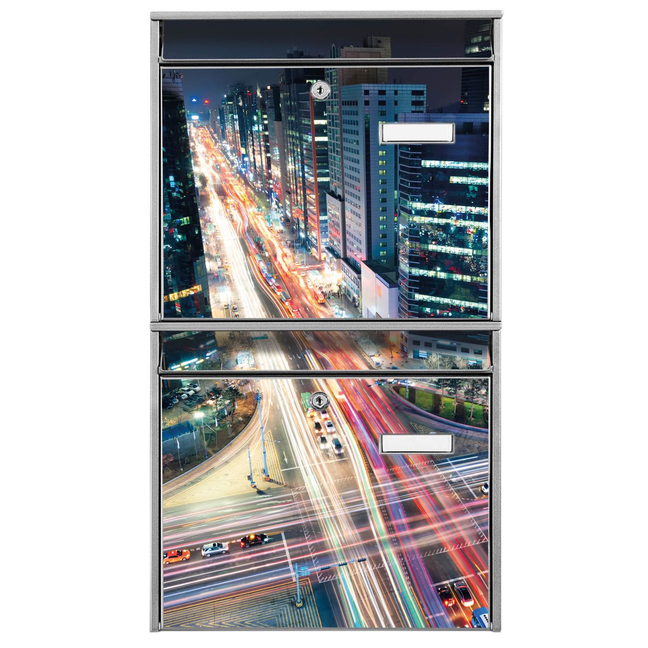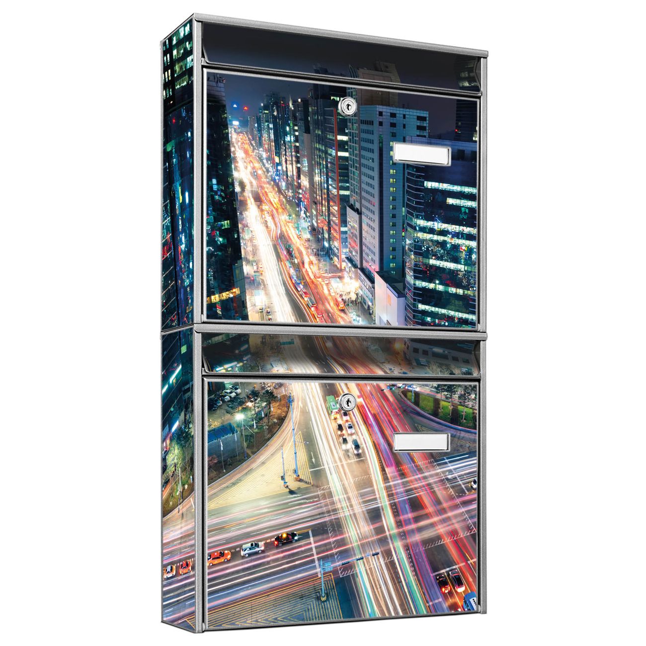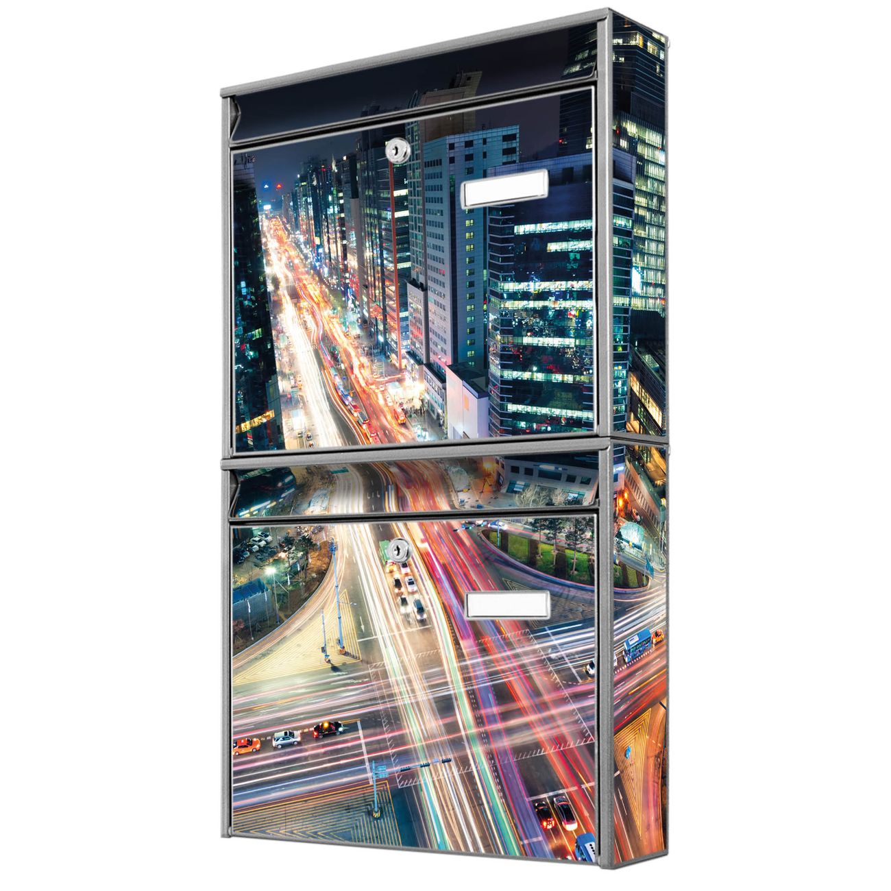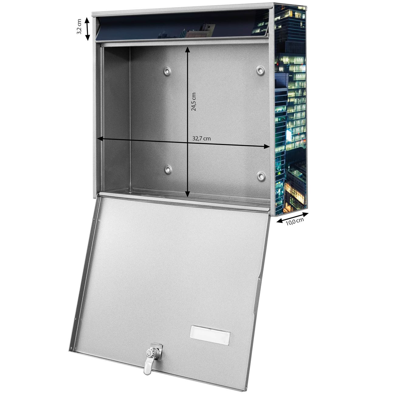 FUNKTION: Die Burg-Wächter Briefkastenanlage mit Motiv Gangnam Bei Nacht bietet Ihnen ausreichend Fassungsvermögen um auch A4 und C4 Sendungen zu empfangen. Das integrierte Namensschild lässt sich individuell beschriften. Wählen Sie aus den Grundfarben weiß, silber und schwarz. DESIGN: Die 2 Briefkästen haben ein ansprechendes und zeitloses Design, ohne dabei auf Funktionalität zu verzichten. Das Material ist sehr stabil, wetterfest und rostfrei. Durch das Motiv Gangnam Bei Nacht werden die Postkästen zu einem Blickfang. DETAILS: Die Postkästen bestehen aus verzinktem Stahl der zusätzlich mit Klarlack versiegelt wurde. Die Kästen sind gesamt 64,5cm hoch, 36,2cm breit und 10cm tief. Das Motiv besteht aus einer wetter- und UV-festen Folie, die Ihren Briefkasten zusätzlich vor Kratzern schützt. Die Postkästen werden mit Montagematerial, je einem Namensschild und je zwei Schlüsseln geliefert. NUTZEN: Das Briefkastenset eignet sich für die Wandmontage, die Größe bietet genügend Platz für Sendungen aller Art. Das zeitlose Design sowie die stabile Bauart bieten Ihnen einen treuen Begleiter für Ihre Post. BANJADO: