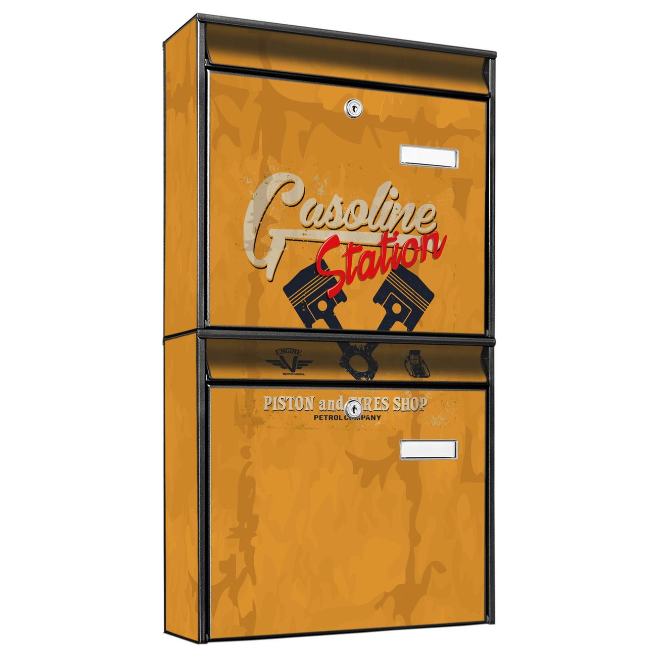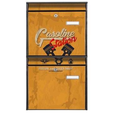 FUNKTION: Die Burg-Wächter Briefkastenanlage mit Motiv Gasoline Station bietet Ihnen ausreichend Fassungsvermögen um auch A4 und C4 Sendungen zu empfangen. Das integrierte Namensschild lässt sich individuell beschriften. Wählen Sie aus den Grundfarben weiß, silber und schwarz. DESIGN: Die 2 Briefkästen haben ein ansprechendes und zeitloses Design, ohne dabei auf Funktionalität zu verzichten. Das Material ist sehr stabil, wetterfest und rostfrei. Durch das Motiv Gasoline Station werden die Postkästen zu einem Blickfang. DETAILS: Die Postkästen bestehen aus verzinktem Stahl der zusätzlich mit Klarlack versiegelt wurde. Die Kästen sind gesamt 64,5cm hoch, 36,2cm breit und 10cm tief. Das Motiv besteht aus einer wetter- und UV-festen Folie, die Ihren Briefkasten zusätzlich vor Kratzern schützt. Die Postkästen werden mit Montagematerial, je einem Namensschild und je zwei Schlüsseln geliefert. NUTZEN: Das Briefkastenset eignet sich für die Wandmontage, die Größe bietet genügend Platz für Sendungen aller Art. Das zeitlose Design sowie die stabile Bauart bieten Ihnen einen treuen Begleiter für Ihre Post. BANJADO: