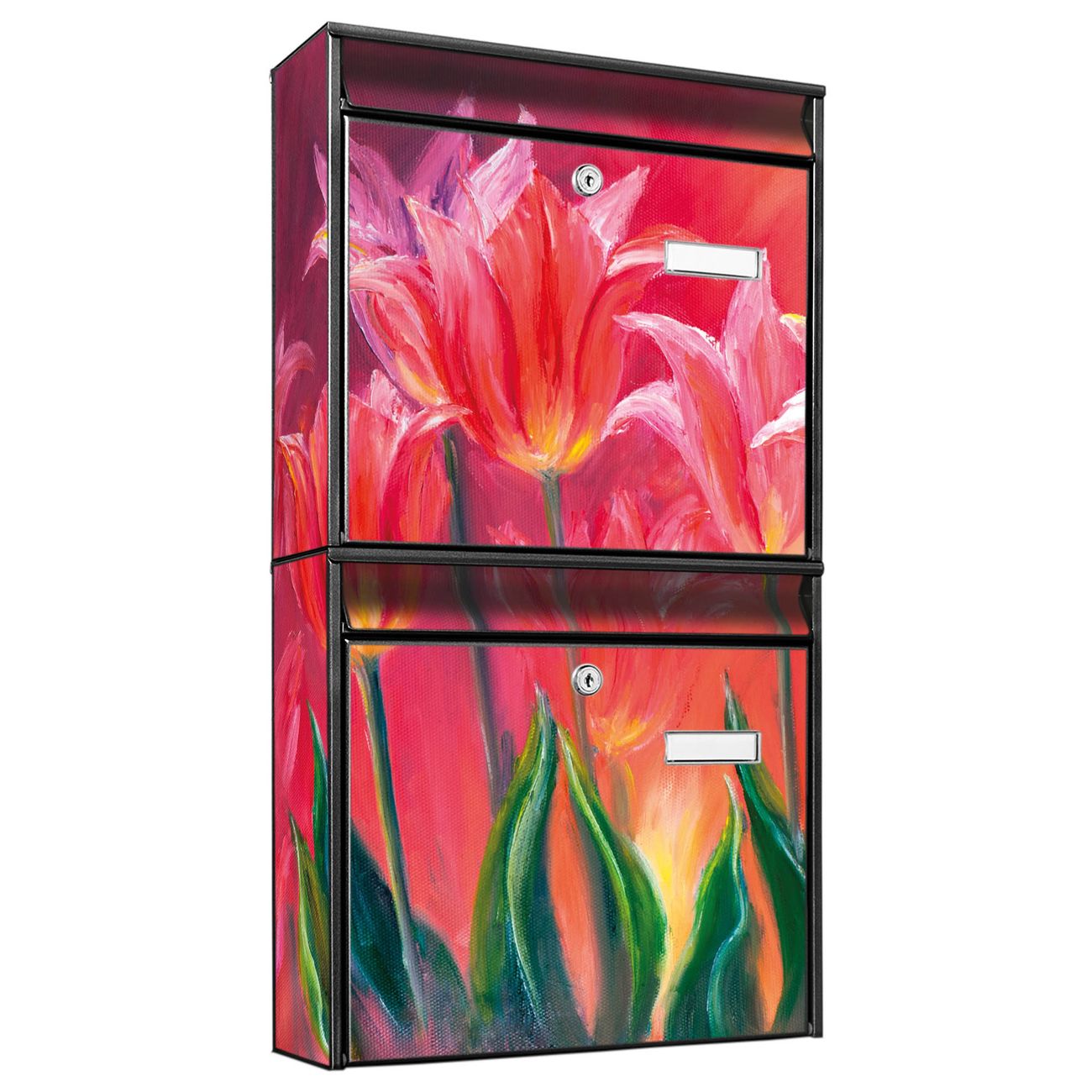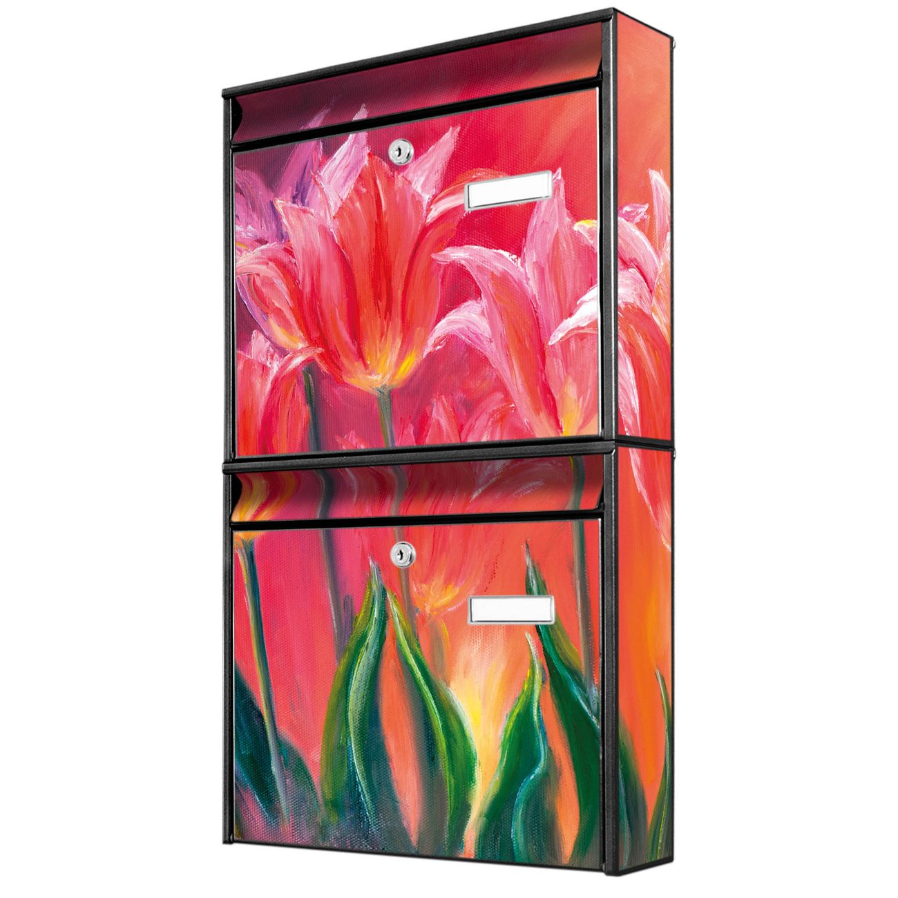 FUNKTION: Die Burg-Wächter Briefkastenanlage mit Motiv Gemalte Tulpen bietet Ihnen ausreichend Fassungsvermögen um auch A4 und C4 Sendungen zu empfangen. Das integrierte Namensschild lässt sich individuell beschriften. Wählen Sie aus den Grundfarben weiß, silber und schwarz. DESIGN: Die 2 Briefkästen haben ein ansprechendes und zeitloses Design, ohne dabei auf Funktionalität zu verzichten. Das Material ist sehr stabil, wetterfest und rostfrei. Durch das Motiv Gemalte Tulpen werden die Postkästen zu einem Blickfang. DETAILS: Die Postkästen bestehen aus verzinktem Stahl der zusätzlich mit Klarlack versiegelt wurde. Die Kästen sind gesamt 64,5cm hoch, 36,2cm breit und 10cm tief. Das Motiv besteht aus einer wetter- und UV-festen Folie, die Ihren Briefkasten zusätzlich vor Kratzern schützt. Die Postkästen werden mit Montagematerial, je einem Namensschild und je zwei Schlüsseln geliefert. NUTZEN: Das Briefkastenset eignet sich für die Wandmontage, die Größe bietet genügend Platz für Sendungen aller Art. Das zeitlose Design sowie die stabile Bauart bieten Ihnen einen treuen Begleiter für Ihre Post. BANJADO: