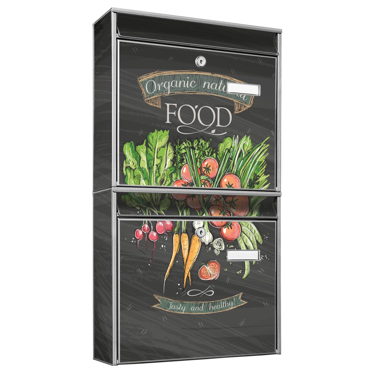 FUNKTION: Die Burg-Wächter Briefkastenanlage mit Motiv Gesund Und Lecker bietet Ihnen ausreichend Fassungsvermögen um auch A4 und C4 Sendungen zu empfangen. Das integrierte Namensschild lässt sich individuell beschriften. Wählen Sie aus den Grundfarben weiß, silber und schwarz. DESIGN: Die 2 Briefkästen haben ein ansprechendes und zeitloses Design, ohne dabei auf Funktionalität zu verzichten. Das Material ist sehr stabil, wetterfest und rostfrei. Durch das Motiv Gesund Und Lecker werden die Postkästen zu einem Blickfang. DETAILS: Die Postkästen bestehen aus verzinktem Stahl der zusätzlich mit Klarlack versiegelt wurde. Die Kästen sind gesamt 64,5cm hoch, 36,2cm breit und 10cm tief. Das Motiv besteht aus einer wetter- und UV-festen Folie, die Ihren Briefkasten zusätzlich vor Kratzern schützt. Die Postkästen werden mit Montagematerial, je einem Namensschild und je zwei Schlüsseln geliefert. NUTZEN: Das Briefkastenset eignet sich für die Wandmontage, die Größe bietet genügend Platz für Sendungen aller Art. Das zeitlose Design sowie die stabile Bauart bieten Ihnen einen treuen Begleiter für Ihre Post. BANJADO: