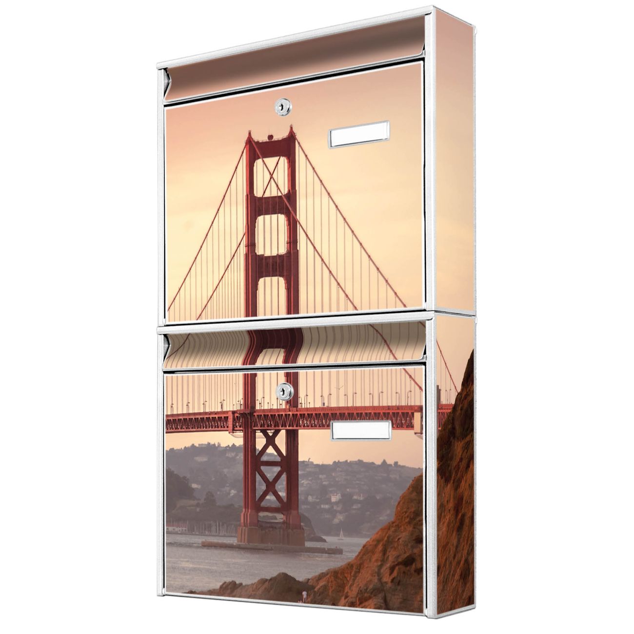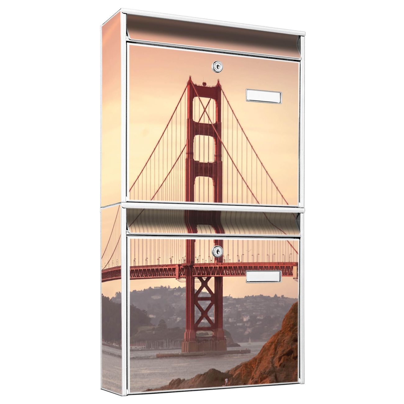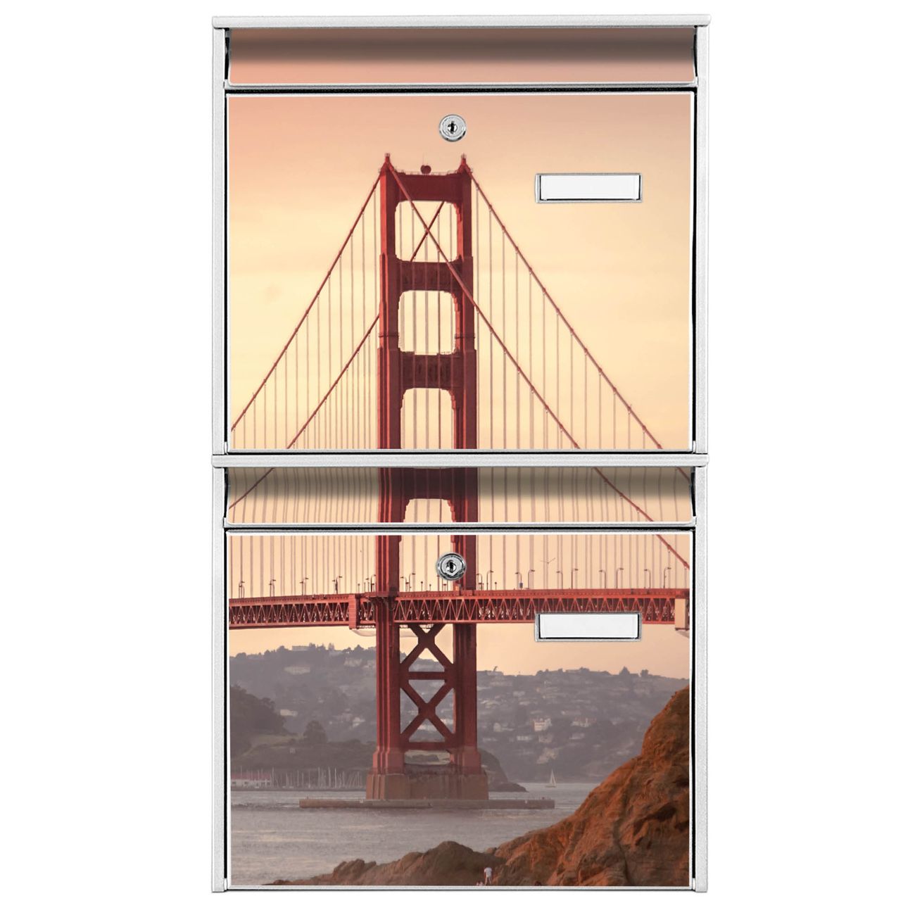 FUNKTION: Die Burg-Wächter Briefkastenanlage mit Motiv Golden Gate Bridge 2 bietet Ihnen ausreichend Fassungsvermögen um auch A4 und C4 Sendungen zu empfangen. Das integrierte Namensschild lässt sich individuell beschriften. Wählen Sie aus den Grundfarben weiß, silber und schwarz. DESIGN: Die 2 Briefkästen haben ein ansprechendes und zeitloses Design, ohne dabei auf Funktionalität zu verzichten. Das Material ist sehr stabil, wetterfest und rostfrei. Durch das Motiv Golden Gate Bridge 2 werden die Postkästen zu einem Blickfang. DETAILS: Die Postkästen bestehen aus verzinktem Stahl der zusätzlich mit Klarlack versiegelt wurde. Die Kästen sind gesamt 64,5cm hoch, 36,2cm breit und 10cm tief. Das Motiv besteht aus einer wetter- und UV-festen Folie, die Ihren Briefkasten zusätzlich vor Kratzern schützt. Die Postkästen werden mit Montagematerial, je einem Namensschild und je zwei Schlüsseln geliefert. NUTZEN: Das Briefkastenset eignet sich für die Wandmontage, die Größe bietet genügend Platz für Sendungen aller Art. Das zeitlose Design sowie die stabile Bauart bieten Ihnen einen treuen Begleiter für Ihre Post. BANJADO: