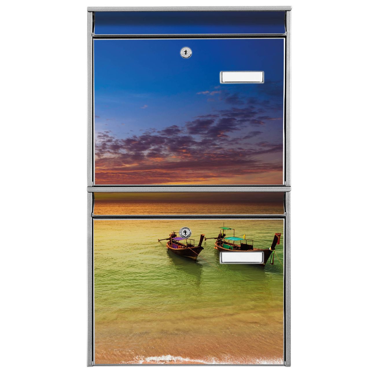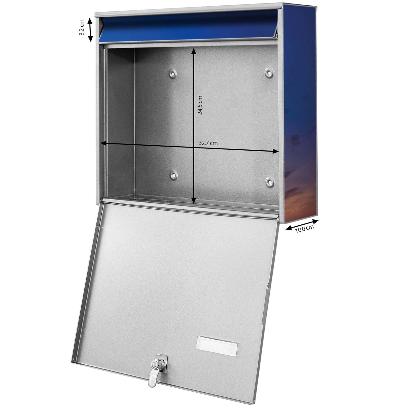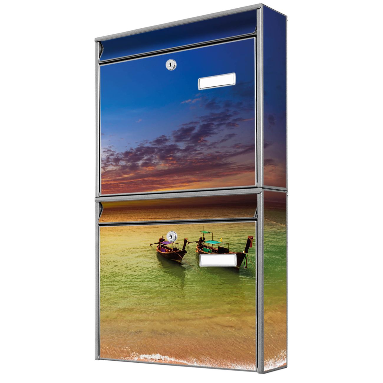 FUNKTION: Die Burg-Wächter Briefkastenanlage mit Motiv Golf Von Thailand bietet Ihnen ausreichend Fassungsvermögen um auch A4 und C4 Sendungen zu empfangen. Das integrierte Namensschild lässt sich individuell beschriften. Wählen Sie aus den Grundfarben weiß, silber und schwarz. DESIGN: Die 2 Briefkästen haben ein ansprechendes und zeitloses Design, ohne dabei auf Funktionalität zu verzichten. Das Material ist sehr stabil, wetterfest und rostfrei. Durch das Motiv Golf Von Thailand werden die Postkästen zu einem Blickfang. DETAILS: Die Postkästen bestehen aus verzinktem Stahl der zusätzlich mit Klarlack versiegelt wurde. Die Kästen sind gesamt 64,5cm hoch, 36,2cm breit und 10cm tief. Das Motiv besteht aus einer wetter- und UV-festen Folie, die Ihren Briefkasten zusätzlich vor Kratzern schützt. Die Postkästen werden mit Montagematerial, je einem Namensschild und je zwei Schlüsseln geliefert. NUTZEN: Das Briefkastenset eignet sich für die Wandmontage, die Größe bietet genügend Platz für Sendungen aller Art. Das zeitlose Design sowie die stabile Bauart bieten Ihnen einen treuen Begleiter für Ihre Post. BANJADO:
