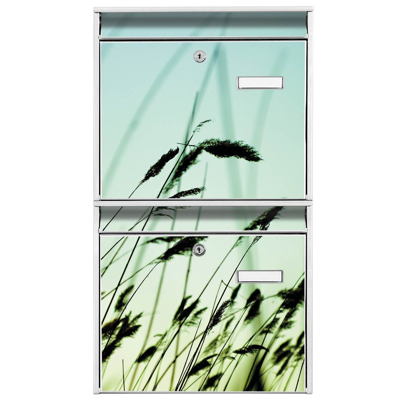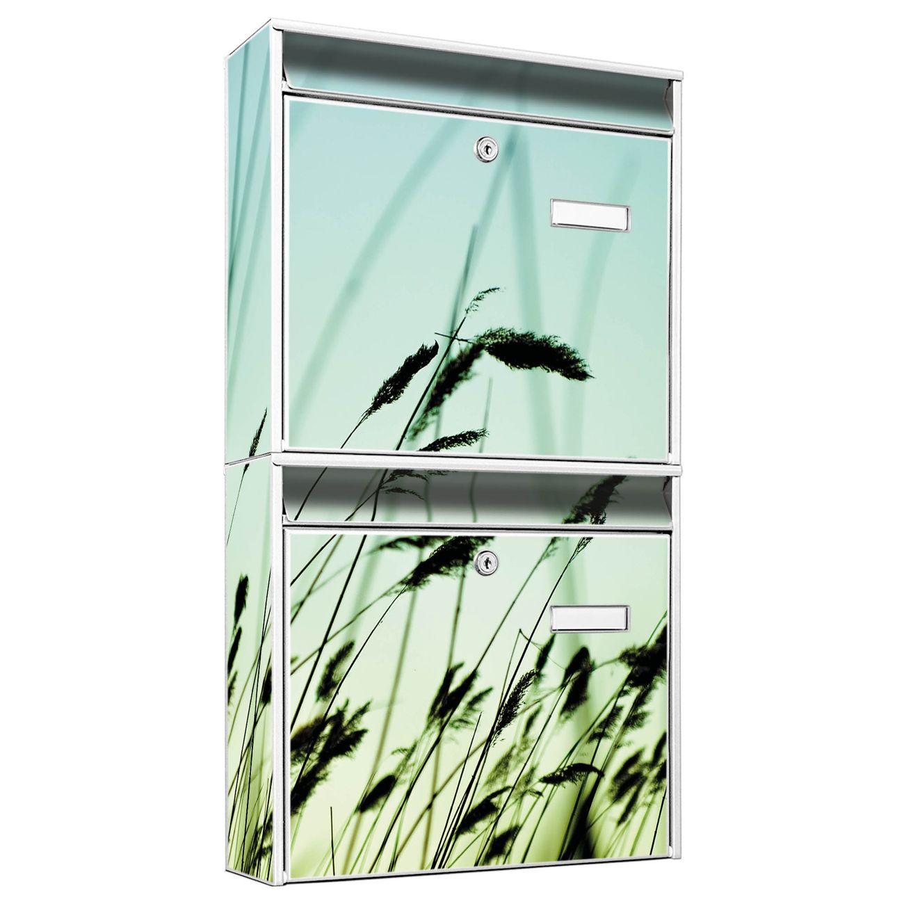 FUNKTION: Die Burg-Wächter Briefkastenanlage mit Motiv Gräser bietet Ihnen ausreichend Fassungsvermögen um auch A4 und C4 Sendungen zu empfangen. Das integrierte Namensschild lässt sich individuell beschriften. Wählen Sie aus den Grundfarben weiß, silber und schwarz. DESIGN: Die 2 Briefkästen haben ein ansprechendes und zeitloses Design, ohne dabei auf Funktionalität zu verzichten. Das Material ist sehr stabil, wetterfest und rostfrei. Durch das Motiv Gräser werden die Postkästen zu einem Blickfang. DETAILS: Die Postkästen bestehen aus verzinktem Stahl der zusätzlich mit Klarlack versiegelt wurde. Die Kästen sind gesamt 64,5cm hoch, 36,2cm breit und 10cm tief. Das Motiv besteht aus einer wetter- und UV-festen Folie, die Ihren Briefkasten zusätzlich vor Kratzern schützt. Die Postkästen werden mit Montagematerial, je einem Namensschild und je zwei Schlüsseln geliefert. NUTZEN: Das Briefkastenset eignet sich für die Wandmontage, die Größe bietet genügend Platz für Sendungen aller Art. Das zeitlose Design sowie die stabile Bauart bieten Ihnen einen treuen Begleiter für Ihre Post. BANJADO: