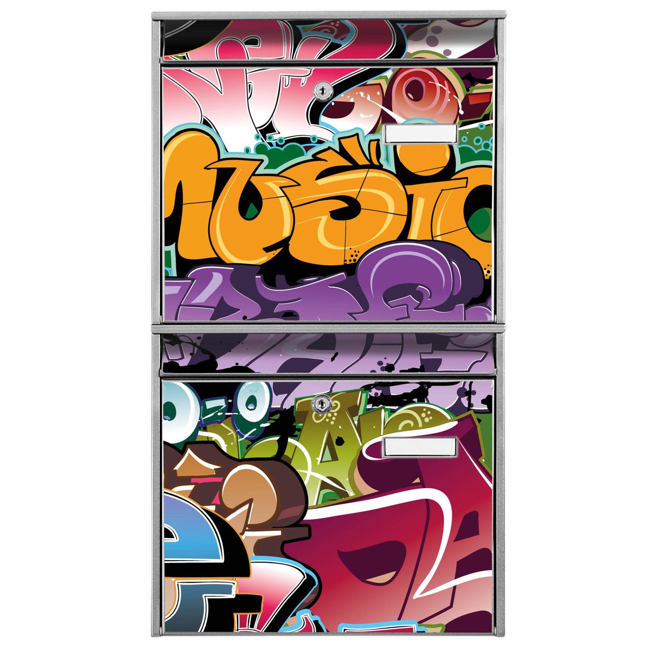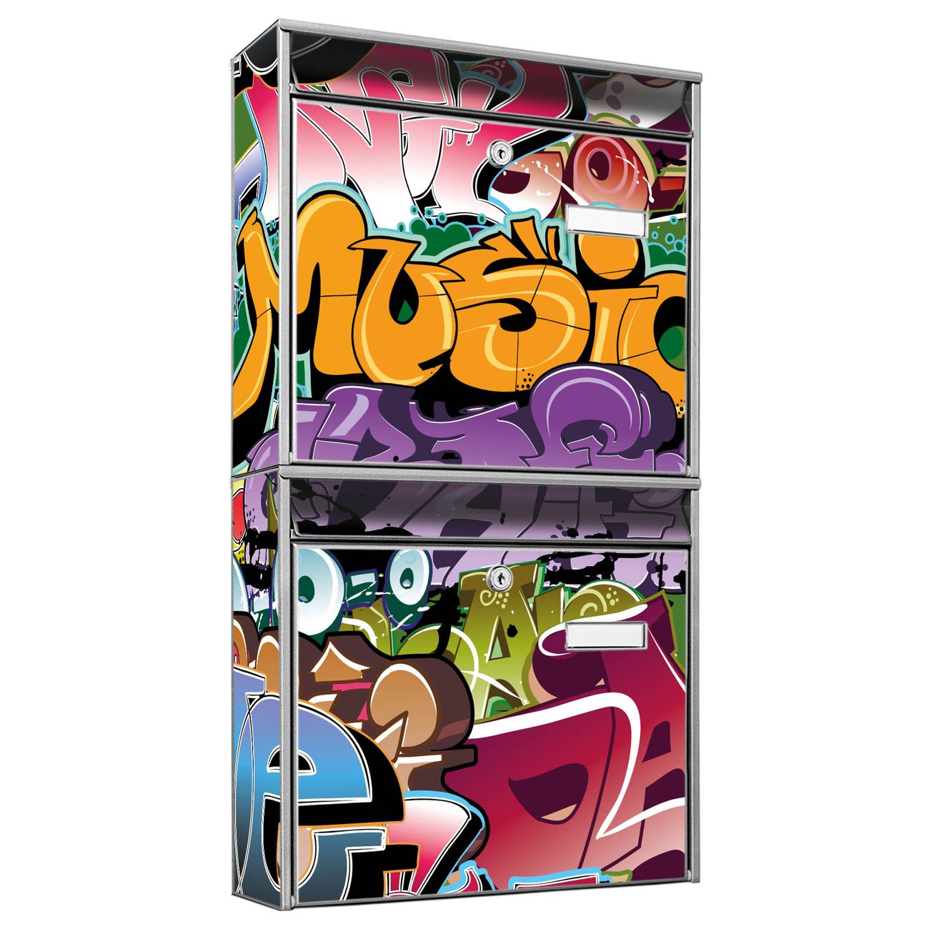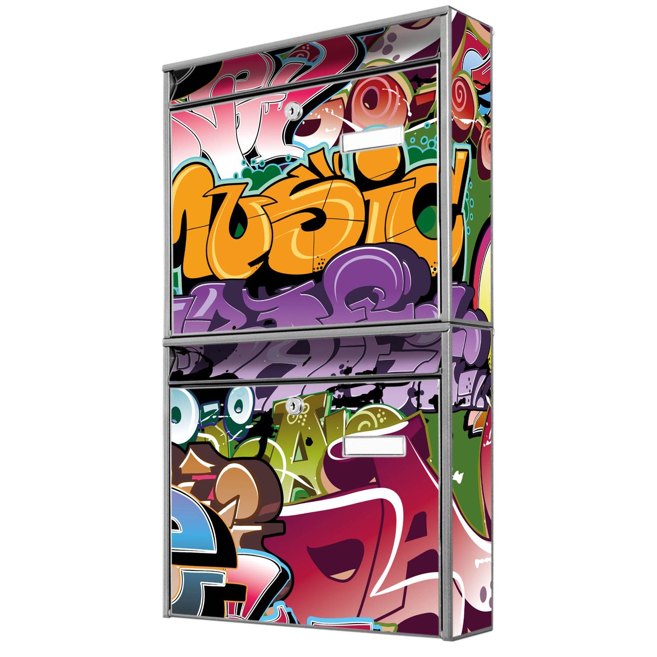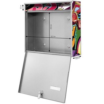 FUNKTION: Die Burg-Wächter Briefkastenanlage mit Motiv Graffiti bietet Ihnen ausreichend Fassungsvermögen um auch A4 und C4 Sendungen zu empfangen. Das integrierte Namensschild lässt sich individuell beschriften. Wählen Sie aus den Grundfarben weiß, silber und schwarz. DESIGN: Die 2 Briefkästen haben ein ansprechendes und zeitloses Design, ohne dabei auf Funktionalität zu verzichten. Das Material ist sehr stabil, wetterfest und rostfrei. Durch das Motiv Graffiti werden die Postkästen zu einem Blickfang. DETAILS: Die Postkästen bestehen aus verzinktem Stahl der zusätzlich mit Klarlack versiegelt wurde. Die Kästen sind gesamt 64,5cm hoch, 36,2cm breit und 10cm tief. Das Motiv besteht aus einer wetter- und UV-festen Folie, die Ihren Briefkasten zusätzlich vor Kratzern schützt. Die Postkästen werden mit Montagematerial, je einem Namensschild und je zwei Schlüsseln geliefert. NUTZEN: Das Briefkastenset eignet sich für die Wandmontage, die Größe bietet genügend Platz für Sendungen aller Art. Das zeitlose Design sowie die stabile Bauart bieten Ihnen einen treuen Begleiter für Ihre Post. BANJADO: