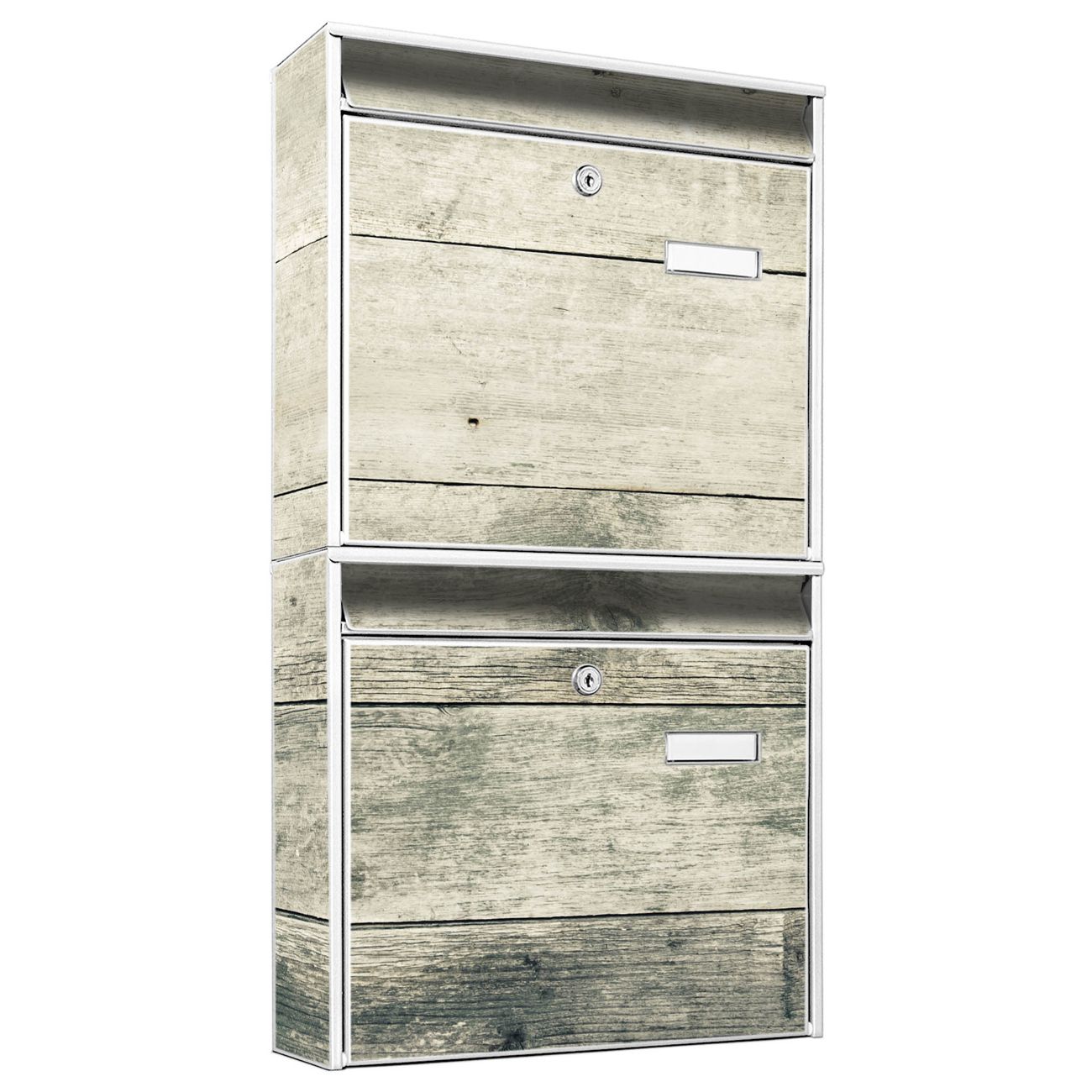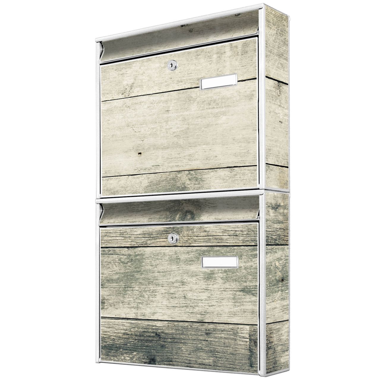 FUNKTION: Die Burg-Wächter Briefkastenanlage mit Motiv Graue Planken bietet Ihnen ausreichend Fassungsvermögen um auch A4 und C4 Sendungen zu empfangen. Das integrierte Namensschild lässt sich individuell beschriften. Wählen Sie aus den Grundfarben weiß, silber und schwarz. DESIGN: Die 2 Briefkästen haben ein ansprechendes und zeitloses Design, ohne dabei auf Funktionalität zu verzichten. Das Material ist sehr stabil, wetterfest und rostfrei. Durch das Motiv Graue Planken werden die Postkästen zu einem Blickfang. DETAILS: Die Postkästen bestehen aus verzinktem Stahl der zusätzlich mit Klarlack versiegelt wurde. Die Kästen sind gesamt 64,5cm hoch, 36,2cm breit und 10cm tief. Das Motiv besteht aus einer wetter- und UV-festen Folie, die Ihren Briefkasten zusätzlich vor Kratzern schützt. Die Postkästen werden mit Montagematerial, je einem Namensschild und je zwei Schlüsseln geliefert. NUTZEN: Das Briefkastenset eignet sich für die Wandmontage, die Größe bietet genügend Platz für Sendungen aller Art. Das zeitlose Design sowie die stabile Bauart bieten Ihnen einen treuen Begleiter für Ihre Post. BANJADO: