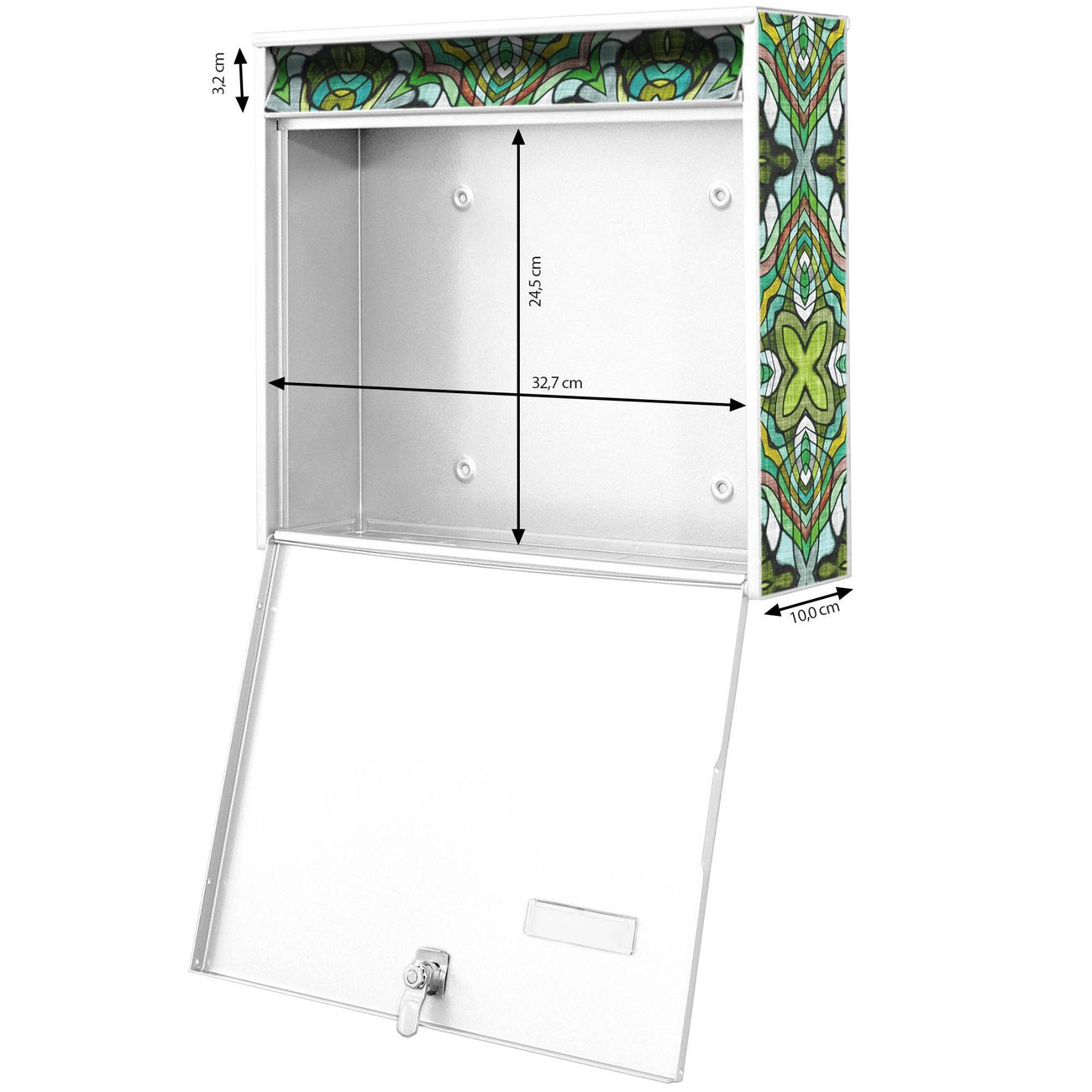 FUNKTION: Die Burg-Wächter Briefkastenanlage mit Motiv Grünes Muster bietet Ihnen ausreichend Fassungsvermögen um auch A4 und C4 Sendungen zu empfangen. Das integrierte Namensschild lässt sich individuell beschriften. Wählen Sie aus den Grundfarben weiß, silber und schwarz. DESIGN: Die 2 Briefkästen haben ein ansprechendes und zeitloses Design, ohne dabei auf Funktionalität zu verzichten. Das Material ist sehr stabil, wetterfest und rostfrei. Durch das Motiv Grünes Muster werden die Postkästen zu einem Blickfang. DETAILS: Die Postkästen bestehen aus verzinktem Stahl der zusätzlich mit Klarlack versiegelt wurde. Die Kästen sind gesamt 64,5cm hoch, 36,2cm breit und 10cm tief. Das Motiv besteht aus einer wetter- und UV-festen Folie, die Ihren Briefkasten zusätzlich vor Kratzern schützt. Die Postkästen werden mit Montagematerial, je einem Namensschild und je zwei Schlüsseln geliefert. NUTZEN: Das Briefkastenset eignet sich für die Wandmontage, die Größe bietet genügend Platz für Sendungen aller Art. Das zeitlose Design sowie die stabile Bauart bieten Ihnen einen treuen Begleiter für Ihre Post. BANJADO: