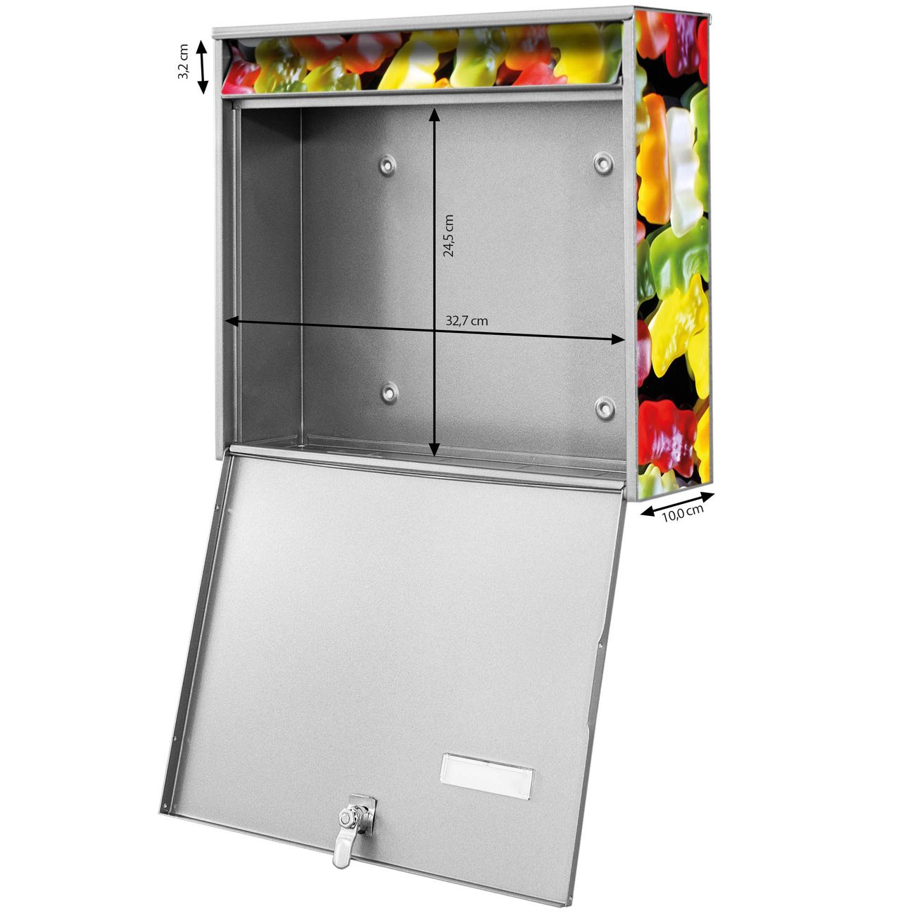 FUNKTION: Die Burg-Wächter Briefkastenanlage mit Motiv Gummibaerchen bietet Ihnen ausreichend Fassungsvermögen um auch A4 und C4 Sendungen zu empfangen. Das integrierte Namensschild lässt sich individuell beschriften. Wählen Sie aus den Grundfarben weiß, silber und schwarz. DESIGN: Die 2 Briefkästen haben ein ansprechendes und zeitloses Design, ohne dabei auf Funktionalität zu verzichten. Das Material ist sehr stabil, wetterfest und rostfrei. Durch das Motiv Gummibaerchen werden die Postkästen zu einem Blickfang. DETAILS: Die Postkästen bestehen aus verzinktem Stahl der zusätzlich mit Klarlack versiegelt wurde. Die Kästen sind gesamt 64,5cm hoch, 36,2cm breit und 10cm tief. Das Motiv besteht aus einer wetter- und UV-festen Folie, die Ihren Briefkasten zusätzlich vor Kratzern schützt. Die Postkästen werden mit Montagematerial, je einem Namensschild und je zwei Schlüsseln geliefert. NUTZEN: Das Briefkastenset eignet sich für die Wandmontage, die Größe bietet genügend Platz für Sendungen aller Art. Das zeitlose Design sowie die stabile Bauart bieten Ihnen einen treuen Begleiter für Ihre Post. BANJADO: