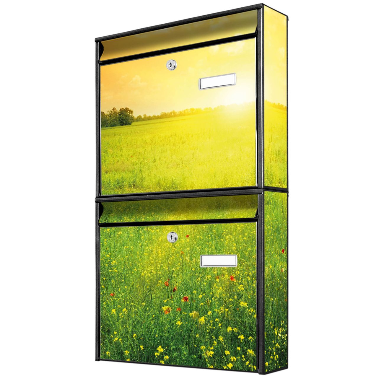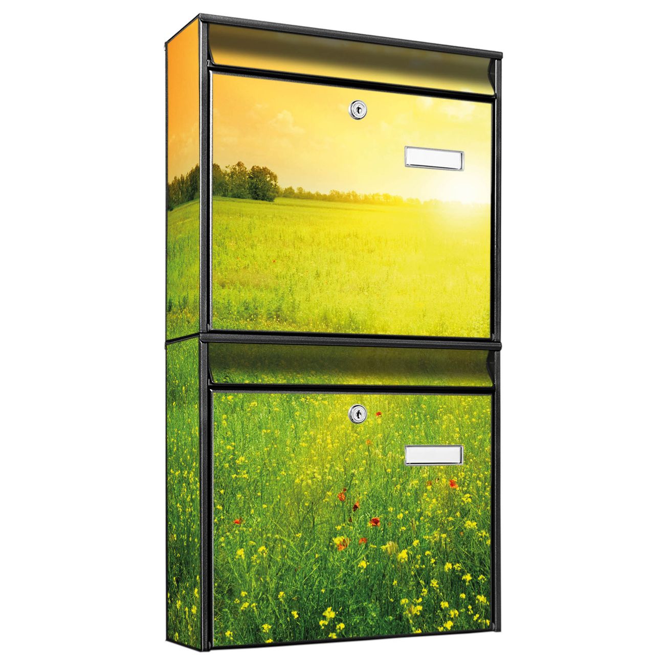 FUNKTION: Die Burg-Wächter Briefkastenanlage mit Motiv Guten Morgen 2 bietet Ihnen ausreichend Fassungsvermögen um auch A4 und C4 Sendungen zu empfangen. Das integrierte Namensschild lässt sich individuell beschriften. Wählen Sie aus den Grundfarben weiß, silber und schwarz. DESIGN: Die 2 Briefkästen haben ein ansprechendes und zeitloses Design, ohne dabei auf Funktionalität zu verzichten. Das Material ist sehr stabil, wetterfest und rostfrei. Durch das Motiv Guten Morgen 2 werden die Postkästen zu einem Blickfang. DETAILS: Die Postkästen bestehen aus verzinktem Stahl der zusätzlich mit Klarlack versiegelt wurde. Die Kästen sind gesamt 64,5cm hoch, 36,2cm breit und 10cm tief. Das Motiv besteht aus einer wetter- und UV-festen Folie, die Ihren Briefkasten zusätzlich vor Kratzern schützt. Die Postkästen werden mit Montagematerial, je einem Namensschild und je zwei Schlüsseln geliefert. NUTZEN: Das Briefkastenset eignet sich für die Wandmontage, die Größe bietet genügend Platz für Sendungen aller Art. Das zeitlose Design sowie die stabile Bauart bieten Ihnen einen treuen Begleiter für Ihre Post. BANJADO: