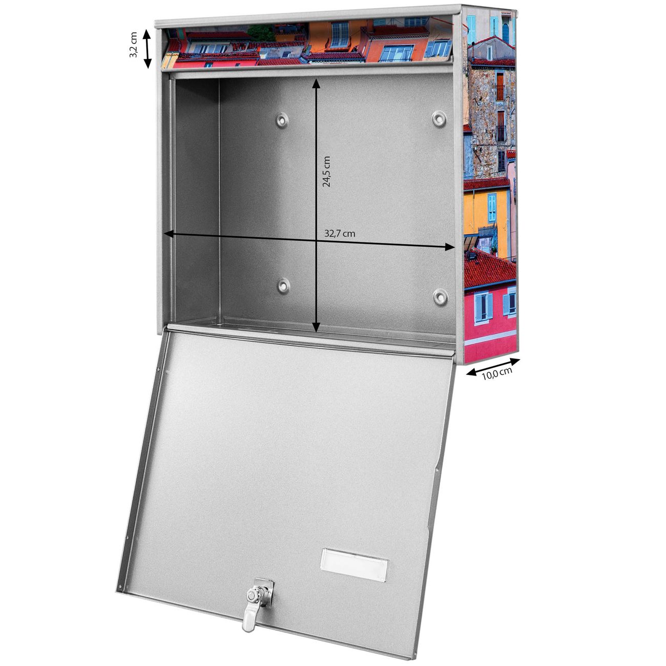 FUNKTION: Die Burg-Wächter Briefkastenanlage mit Motiv Häuserberg bietet Ihnen ausreichend Fassungsvermögen um auch A4 und C4 Sendungen zu empfangen. Das integrierte Namensschild lässt sich individuell beschriften. Wählen Sie aus den Grundfarben weiß, silber und schwarz. DESIGN: Die 2 Briefkästen haben ein ansprechendes und zeitloses Design, ohne dabei auf Funktionalität zu verzichten. Das Material ist sehr stabil, wetterfest und rostfrei. Durch das Motiv Häuserberg werden die Postkästen zu einem Blickfang. DETAILS: Die Postkästen bestehen aus verzinktem Stahl der zusätzlich mit Klarlack versiegelt wurde. Die Kästen sind gesamt 64,5cm hoch, 36,2cm breit und 10cm tief. Das Motiv besteht aus einer wetter- und UV-festen Folie, die Ihren Briefkasten zusätzlich vor Kratzern schützt. Die Postkästen werden mit Montagematerial, je einem Namensschild und je zwei Schlüsseln geliefert. NUTZEN: Das Briefkastenset eignet sich für die Wandmontage, die Größe bietet genügend Platz für Sendungen aller Art. Das zeitlose Design sowie die stabile Bauart bieten Ihnen einen treuen Begleiter für Ihre Post. BANJADO: