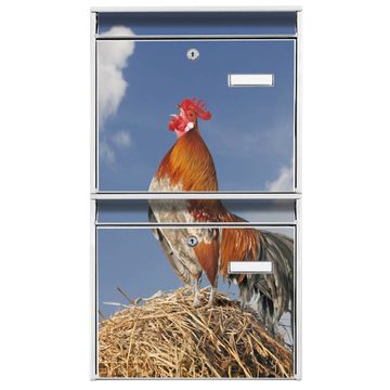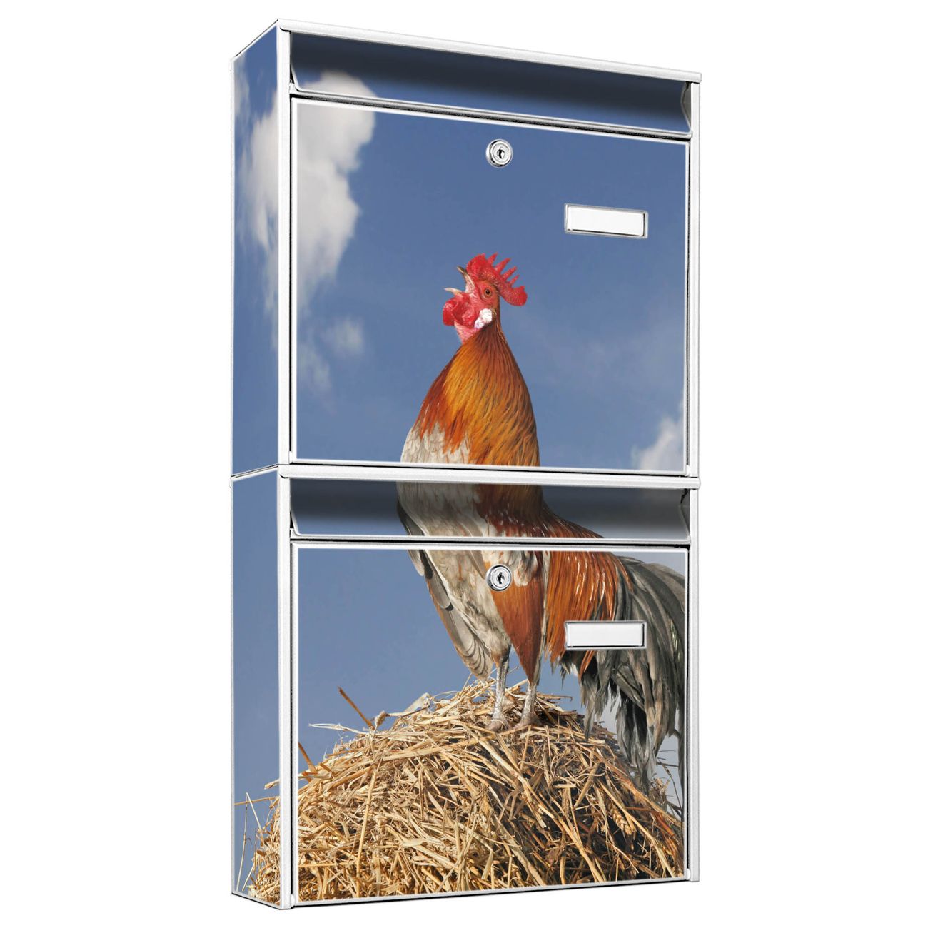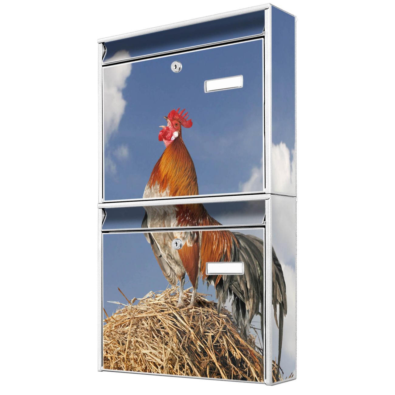 FUNKTION: Die Burg-Wächter Briefkastenanlage mit Motiv Hahn bietet Ihnen ausreichend Fassungsvermögen um auch A4 und C4 Sendungen zu empfangen. Das integrierte Namensschild lässt sich individuell beschriften. Wählen Sie aus den Grundfarben weiß, silber und schwarz. DESIGN: Die 2 Briefkästen haben ein ansprechendes und zeitloses Design, ohne dabei auf Funktionalität zu verzichten. Das Material ist sehr stabil, wetterfest und rostfrei. Durch das Motiv Hahn werden die Postkästen zu einem Blickfang. DETAILS: Die Postkästen bestehen aus verzinktem Stahl der zusätzlich mit Klarlack versiegelt wurde. Die Kästen sind gesamt 64,5cm hoch, 36,2cm breit und 10cm tief. Das Motiv besteht aus einer wetter- und UV-festen Folie, die Ihren Briefkasten zusätzlich vor Kratzern schützt. Die Postkästen werden mit Montagematerial, je einem Namensschild und je zwei Schlüsseln geliefert. NUTZEN: Das Briefkastenset eignet sich für die Wandmontage, die Größe bietet genügend Platz für Sendungen aller Art. Das zeitlose Design sowie die stabile Bauart bieten Ihnen einen treuen Begleiter für Ihre Post. BANJADO: