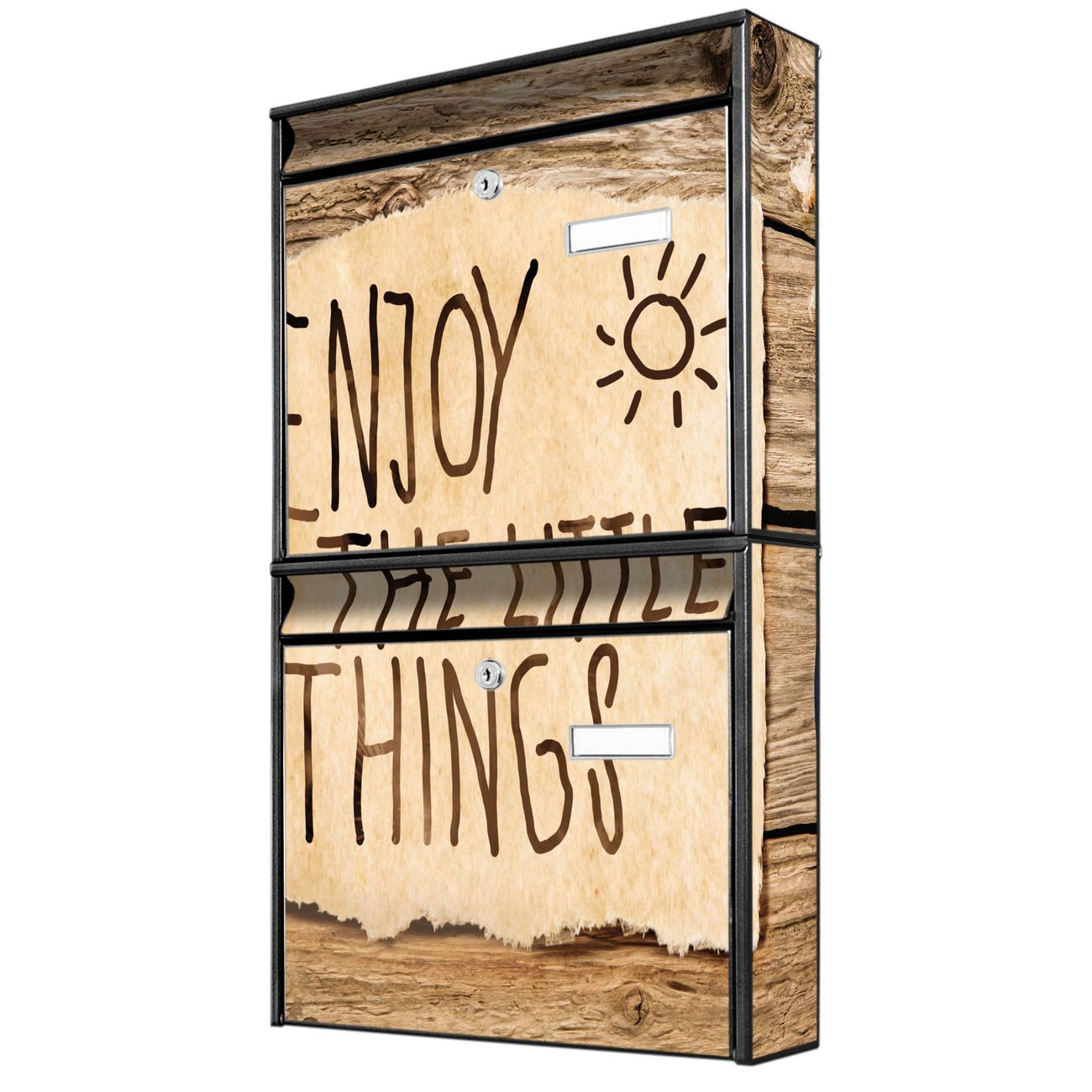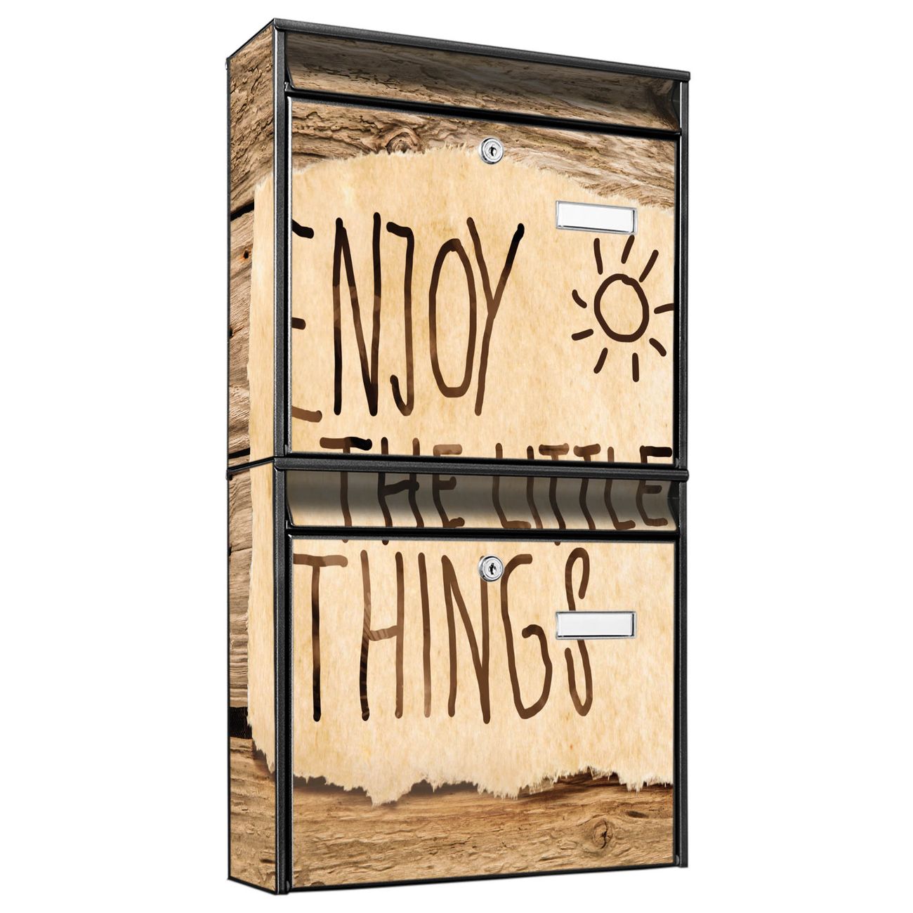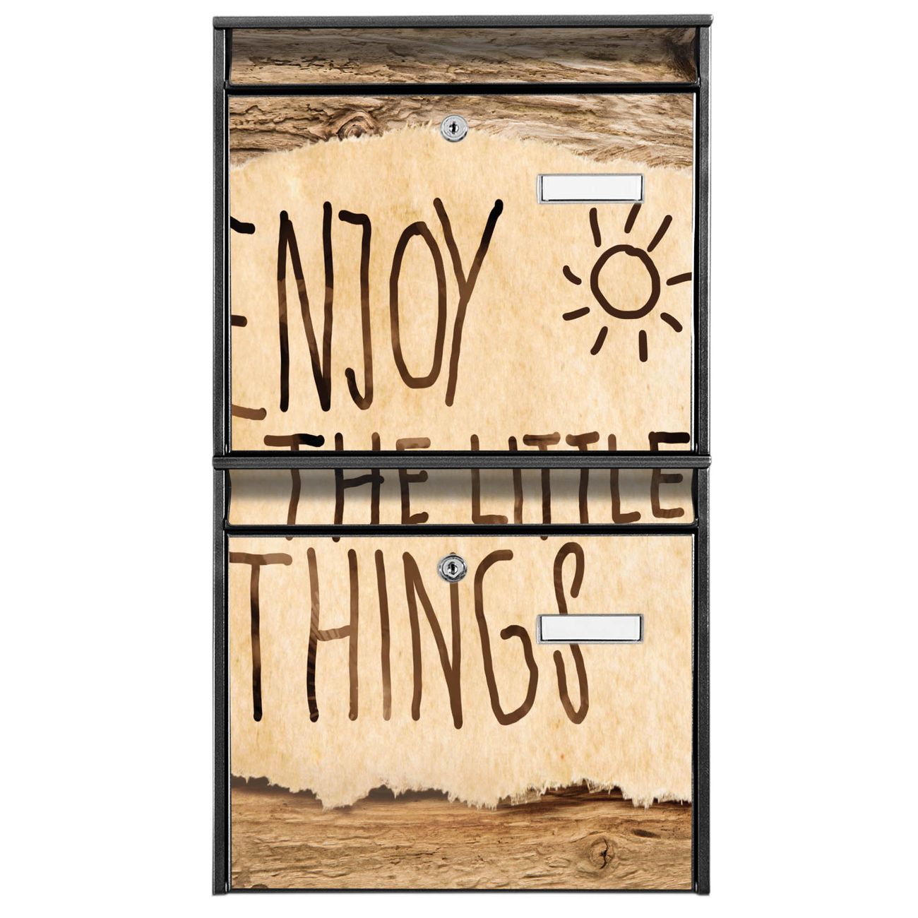 FUNKTION: Die Burg-Wächter Briefkastenanlage mit Motiv Happy Day bietet Ihnen ausreichend Fassungsvermögen um auch A4 und C4 Sendungen zu empfangen. Das integrierte Namensschild lässt sich individuell beschriften. Wählen Sie aus den Grundfarben weiß, silber und schwarz. DESIGN: Die 2 Briefkästen haben ein ansprechendes und zeitloses Design, ohne dabei auf Funktionalität zu verzichten. Das Material ist sehr stabil, wetterfest und rostfrei. Durch das Motiv Happy Day werden die Postkästen zu einem Blickfang. DETAILS: Die Postkästen bestehen aus verzinktem Stahl der zusätzlich mit Klarlack versiegelt wurde. Die Kästen sind gesamt 64,5cm hoch, 36,2cm breit und 10cm tief. Das Motiv besteht aus einer wetter- und UV-festen Folie, die Ihren Briefkasten zusätzlich vor Kratzern schützt. Die Postkästen werden mit Montagematerial, je einem Namensschild und je zwei Schlüsseln geliefert. NUTZEN: Das Briefkastenset eignet sich für die Wandmontage, die Größe bietet genügend Platz für Sendungen aller Art. Das zeitlose Design sowie die stabile Bauart bieten Ihnen einen treuen Begleiter für Ihre Post. BANJADO: