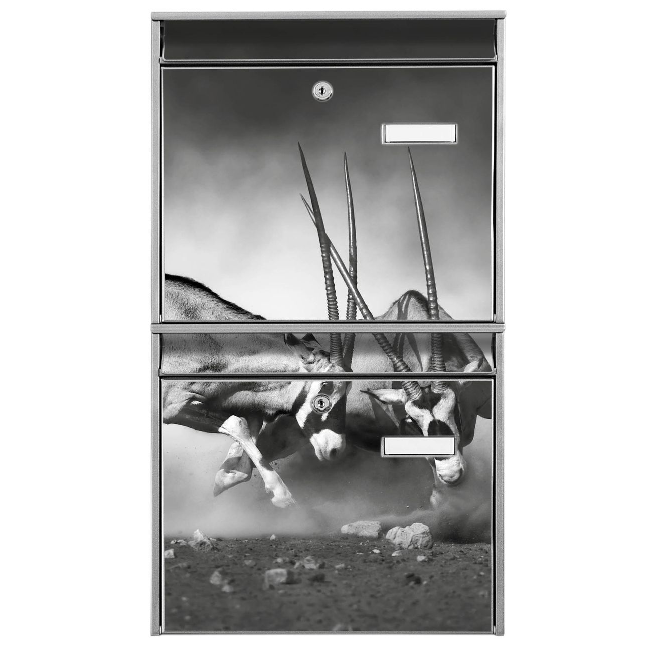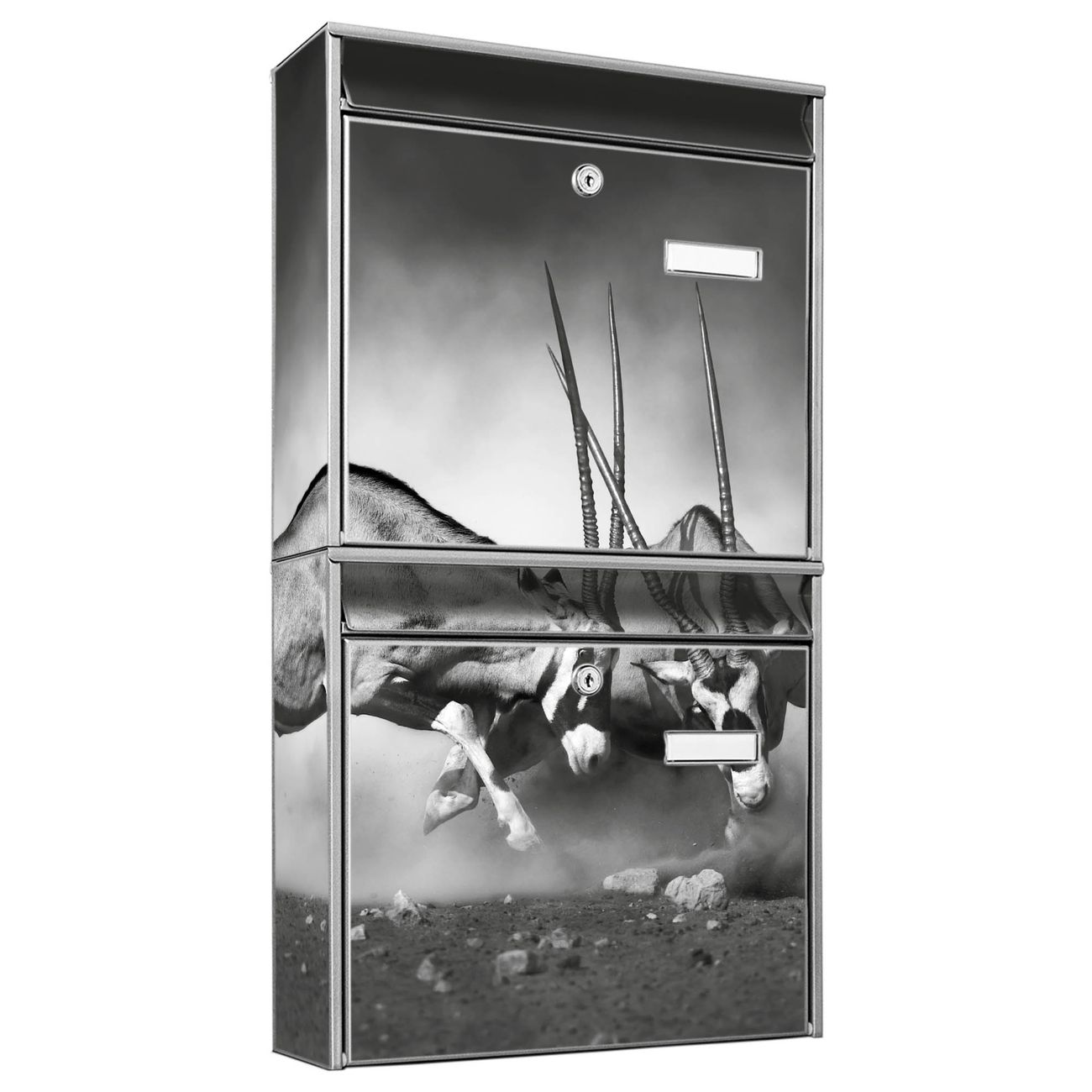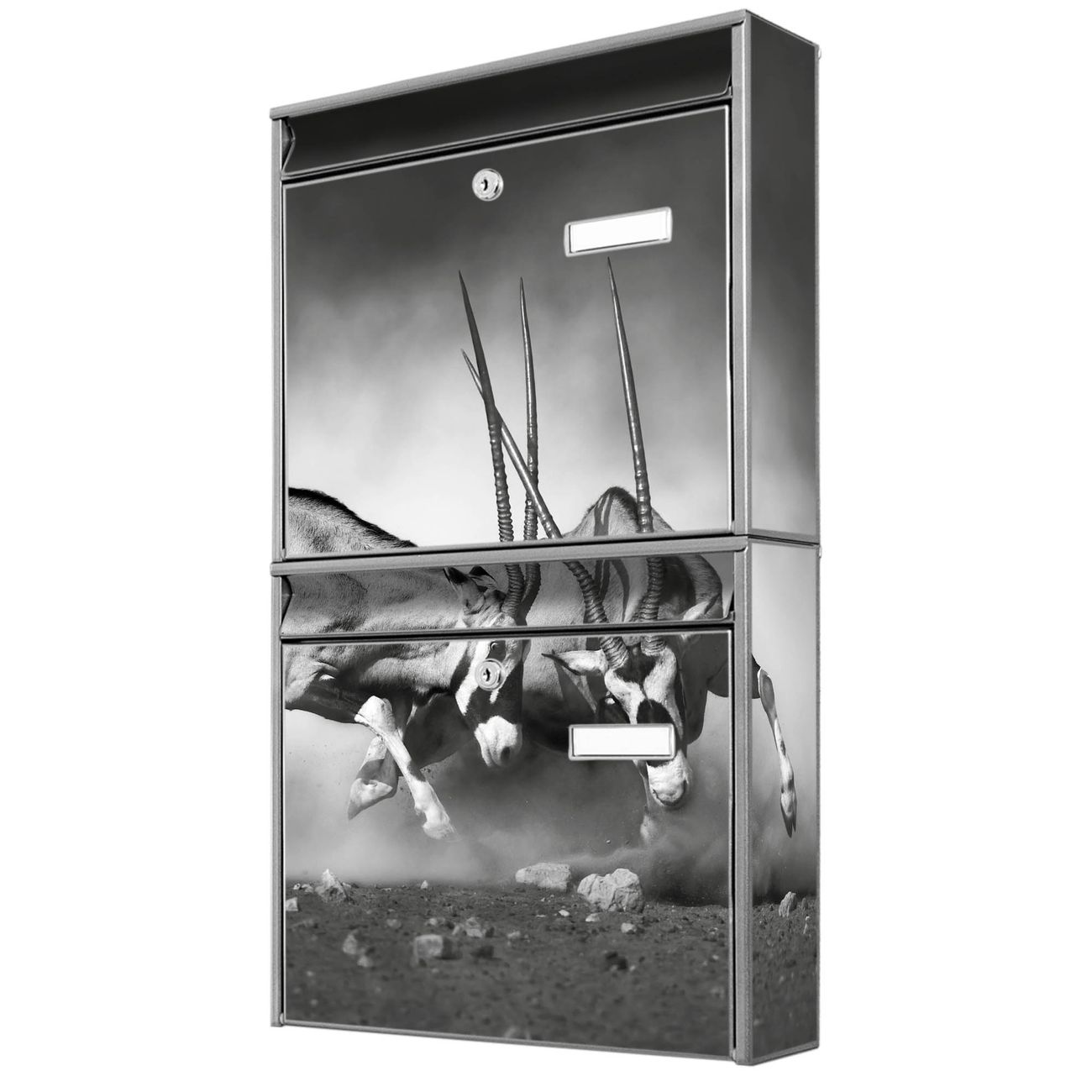 FUNKTION: Die Burg-Wächter Briefkastenanlage mit Motiv Head Crash bietet Ihnen ausreichend Fassungsvermögen um auch A4 und C4 Sendungen zu empfangen. Das integrierte Namensschild lässt sich individuell beschriften. Wählen Sie aus den Grundfarben weiß, silber und schwarz. DESIGN: Die 2 Briefkästen haben ein ansprechendes und zeitloses Design, ohne dabei auf Funktionalität zu verzichten. Das Material ist sehr stabil, wetterfest und rostfrei. Durch das Motiv Head Crash werden die Postkästen zu einem Blickfang. DETAILS: Die Postkästen bestehen aus verzinktem Stahl der zusätzlich mit Klarlack versiegelt wurde. Die Kästen sind gesamt 64,5cm hoch, 36,2cm breit und 10cm tief. Das Motiv besteht aus einer wetter- und UV-festen Folie, die Ihren Briefkasten zusätzlich vor Kratzern schützt. Die Postkästen werden mit Montagematerial, je einem Namensschild und je zwei Schlüsseln geliefert. NUTZEN: Das Briefkastenset eignet sich für die Wandmontage, die Größe bietet genügend Platz für Sendungen aller Art. Das zeitlose Design sowie die stabile Bauart bieten Ihnen einen treuen Begleiter für Ihre Post. BANJADO: