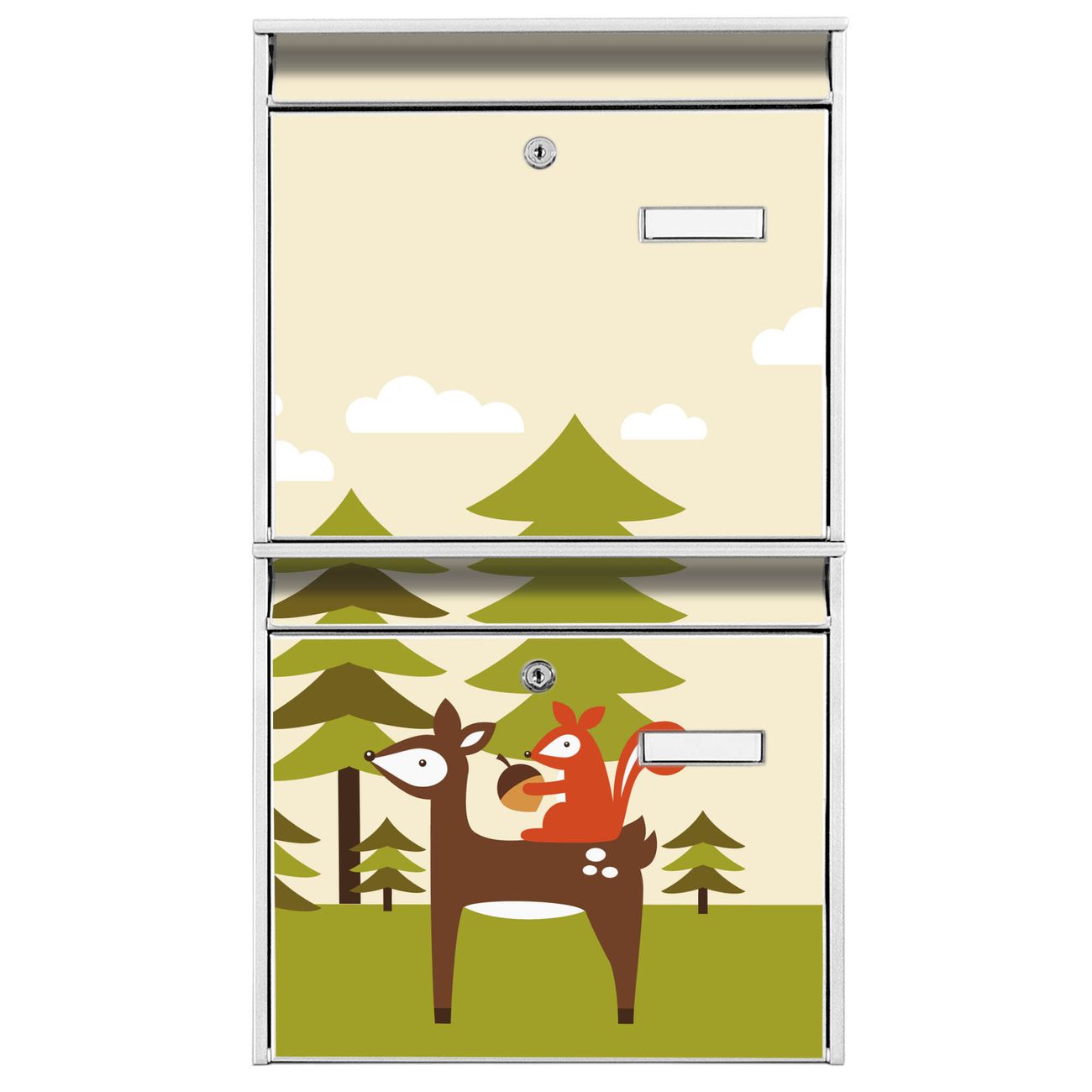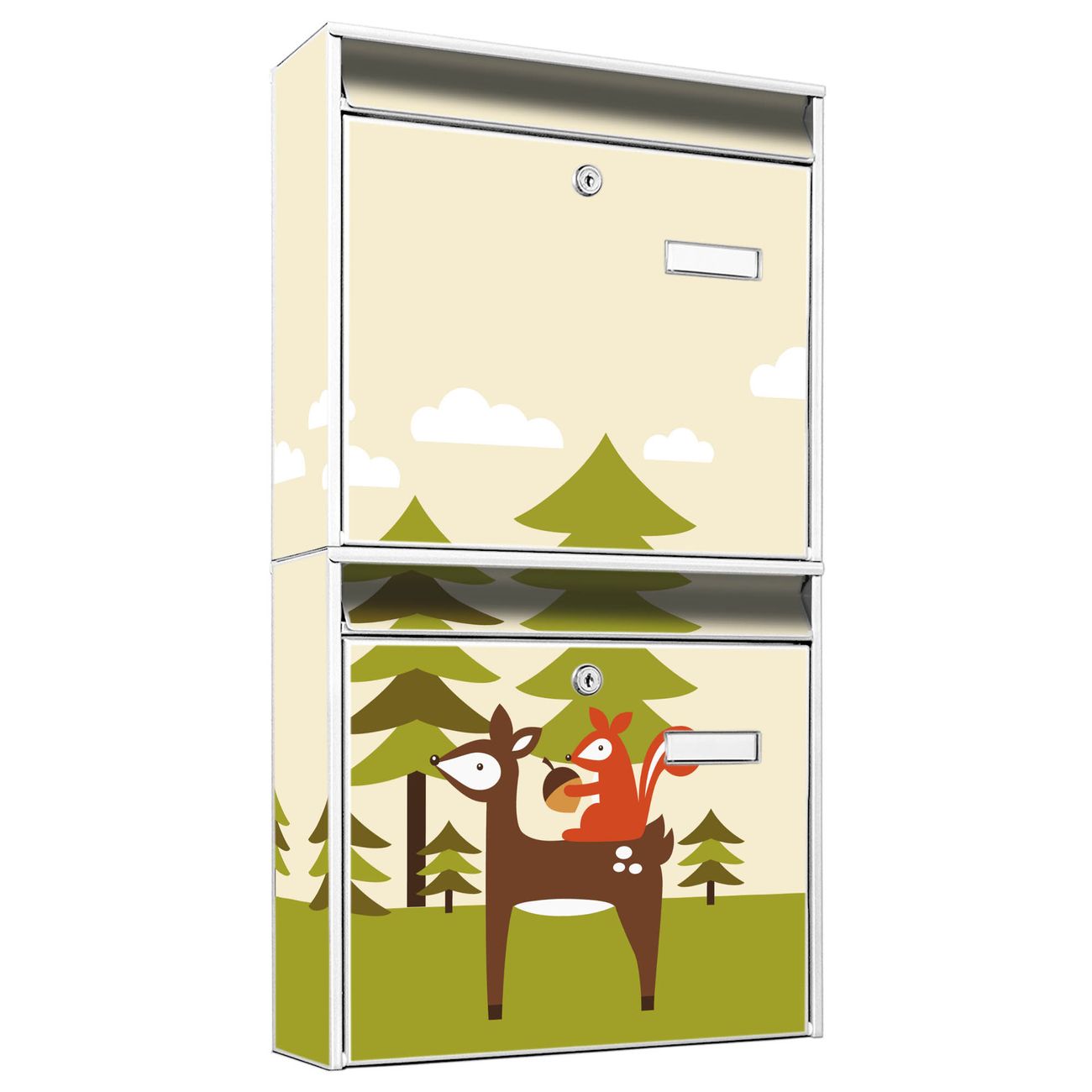 FUNKTION: Die Burg-Wächter Briefkastenanlage mit Motiv Heimweg bietet Ihnen ausreichend Fassungsvermögen um auch A4 und C4 Sendungen zu empfangen. Das integrierte Namensschild lässt sich individuell beschriften. Wählen Sie aus den Grundfarben weiß, silber und schwarz. DESIGN: Die 2 Briefkästen haben ein ansprechendes und zeitloses Design, ohne dabei auf Funktionalität zu verzichten. Das Material ist sehr stabil, wetterfest und rostfrei. Durch das Motiv Heimweg werden die Postkästen zu einem Blickfang. DETAILS: Die Postkästen bestehen aus verzinktem Stahl der zusätzlich mit Klarlack versiegelt wurde. Die Kästen sind gesamt 64,5cm hoch, 36,2cm breit und 10cm tief. Das Motiv besteht aus einer wetter- und UV-festen Folie, die Ihren Briefkasten zusätzlich vor Kratzern schützt. Die Postkästen werden mit Montagematerial, je einem Namensschild und je zwei Schlüsseln geliefert. NUTZEN: Das Briefkastenset eignet sich für die Wandmontage, die Größe bietet genügend Platz für Sendungen aller Art. Das zeitlose Design sowie die stabile Bauart bieten Ihnen einen treuen Begleiter für Ihre Post. BANJADO: