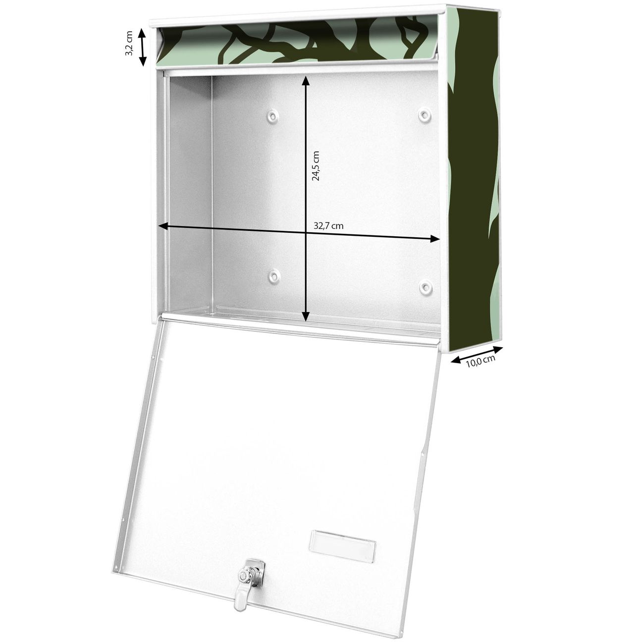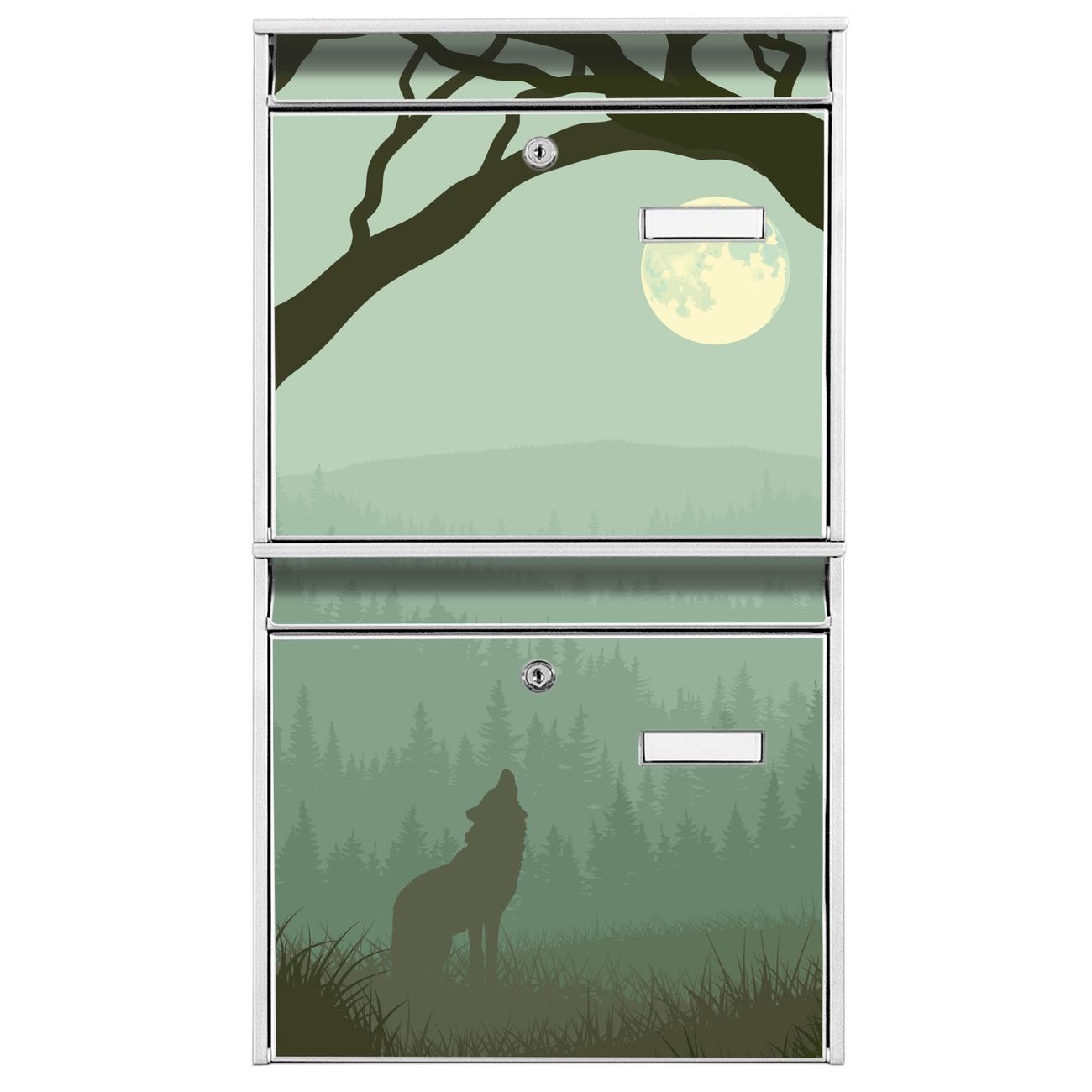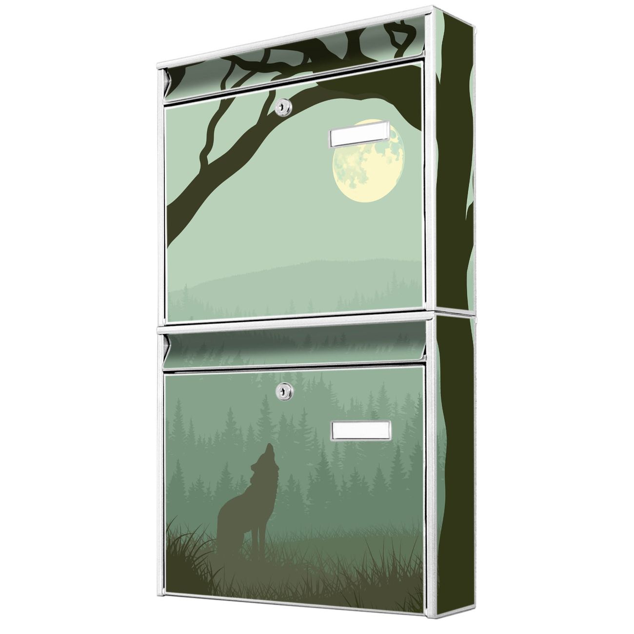 FUNKTION: Die Burg-Wächter Briefkastenanlage mit Motiv Heulender Wolf bietet Ihnen ausreichend Fassungsvermögen um auch A4 und C4 Sendungen zu empfangen. Das integrierte Namensschild lässt sich individuell beschriften. Wählen Sie aus den Grundfarben weiß, silber und schwarz. DESIGN: Die 2 Briefkästen haben ein ansprechendes und zeitloses Design, ohne dabei auf Funktionalität zu verzichten. Das Material ist sehr stabil, wetterfest und rostfrei. Durch das Motiv Heulender Wolf werden die Postkästen zu einem Blickfang. DETAILS: Die Postkästen bestehen aus verzinktem Stahl der zusätzlich mit Klarlack versiegelt wurde. Die Kästen sind gesamt 64,5cm hoch, 36,2cm breit und 10cm tief. Das Motiv besteht aus einer wetter- und UV-festen Folie, die Ihren Briefkasten zusätzlich vor Kratzern schützt. Die Postkästen werden mit Montagematerial, je einem Namensschild und je zwei Schlüsseln geliefert. NUTZEN: Das Briefkastenset eignet sich für die Wandmontage, die Größe bietet genügend Platz für Sendungen aller Art. Das zeitlose Design sowie die stabile Bauart bieten Ihnen einen treuen Begleiter für Ihre Post. BANJADO: