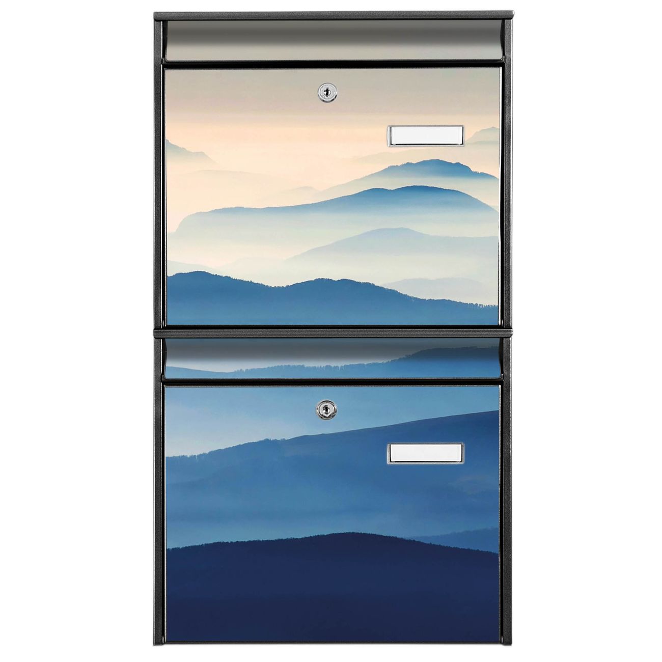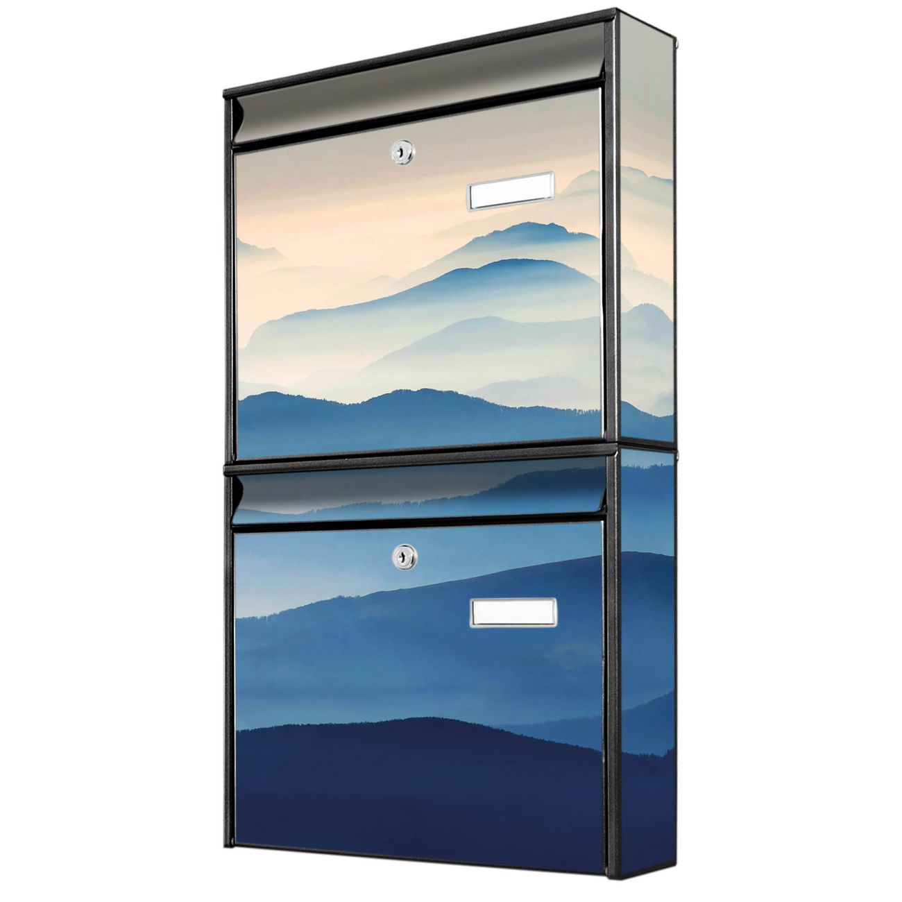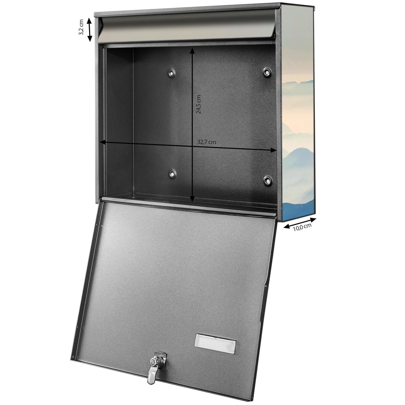 FUNKTION: Die Burg-Wächter Briefkastenanlage mit Motiv Hinter den Bergen bietet Ihnen ausreichend Fassungsvermögen um auch A4 und C4 Sendungen zu empfangen. Das integrierte Namensschild lässt sich individuell beschriften. Wählen Sie aus den Grundfarben weiß, silber und schwarz. DESIGN: Die 2 Briefkästen haben ein ansprechendes und zeitloses Design, ohne dabei auf Funktionalität zu verzichten. Das Material ist sehr stabil, wetterfest und rostfrei. Durch das Motiv Hinter den Bergen werden die Postkästen zu einem Blickfang. DETAILS: Die Postkästen bestehen aus verzinktem Stahl der zusätzlich mit Klarlack versiegelt wurde. Die Kästen sind gesamt 64,5cm hoch, 36,2cm breit und 10cm tief. Das Motiv besteht aus einer wetter- und UV-festen Folie, die Ihren Briefkasten zusätzlich vor Kratzern schützt. Die Postkästen werden mit Montagematerial, je einem Namensschild und je zwei Schlüsseln geliefert. NUTZEN: Das Briefkastenset eignet sich für die Wandmontage, die Größe bietet genügend Platz für Sendungen aller Art. Das zeitlose Design sowie die stabile Bauart bieten Ihnen einen treuen Begleiter für Ihre Post. BANJADO: