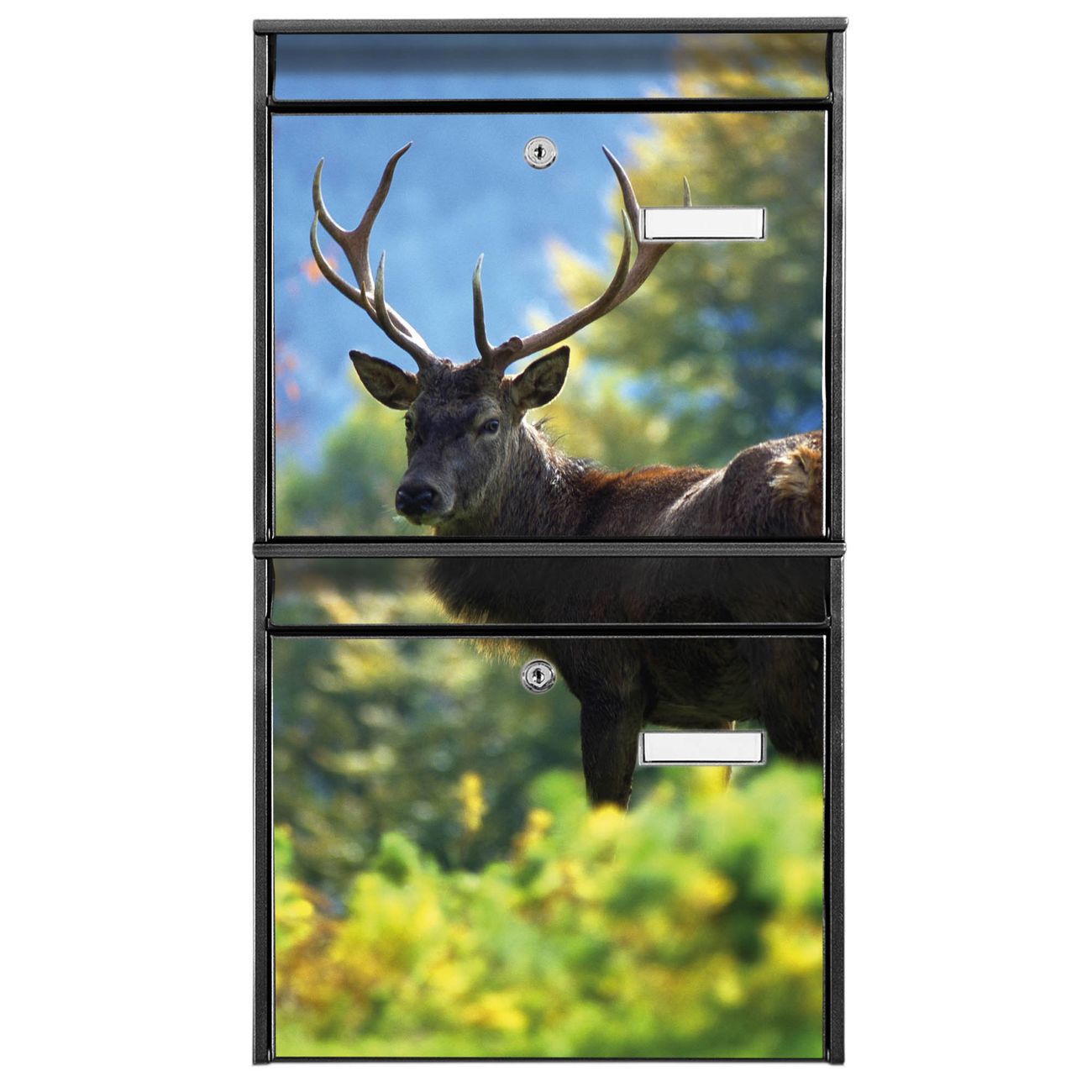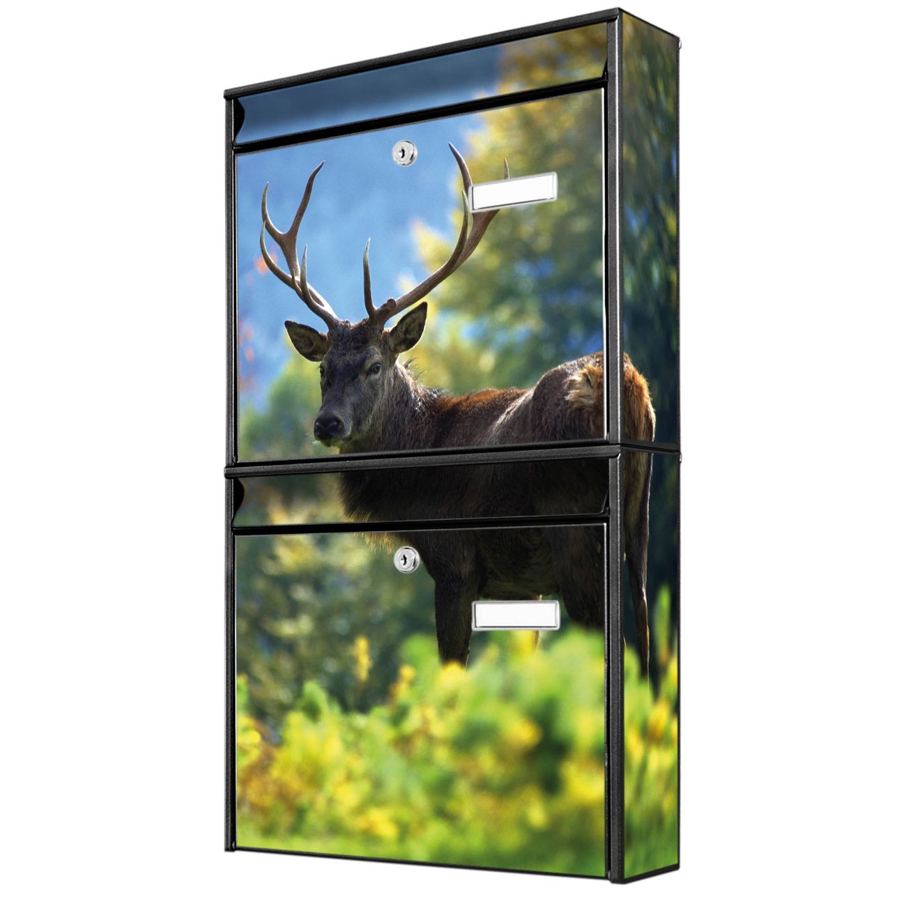 FUNKTION: Die Burg-Wächter Briefkastenanlage mit Motiv Hirsch bietet Ihnen ausreichend Fassungsvermögen um auch A4 und C4 Sendungen zu empfangen. Das integrierte Namensschild lässt sich individuell beschriften. Wählen Sie aus den Grundfarben weiß, silber und schwarz. DESIGN: Die 2 Briefkästen haben ein ansprechendes und zeitloses Design, ohne dabei auf Funktionalität zu verzichten. Das Material ist sehr stabil, wetterfest und rostfrei. Durch das Motiv Hirsch werden die Postkästen zu einem Blickfang. DETAILS: Die Postkästen bestehen aus verzinktem Stahl der zusätzlich mit Klarlack versiegelt wurde. Die Kästen sind gesamt 64,5cm hoch, 36,2cm breit und 10cm tief. Das Motiv besteht aus einer wetter- und UV-festen Folie, die Ihren Briefkasten zusätzlich vor Kratzern schützt. Die Postkästen werden mit Montagematerial, je einem Namensschild und je zwei Schlüsseln geliefert. NUTZEN: Das Briefkastenset eignet sich für die Wandmontage, die Größe bietet genügend Platz für Sendungen aller Art. Das zeitlose Design sowie die stabile Bauart bieten Ihnen einen treuen Begleiter für Ihre Post. BANJADO: