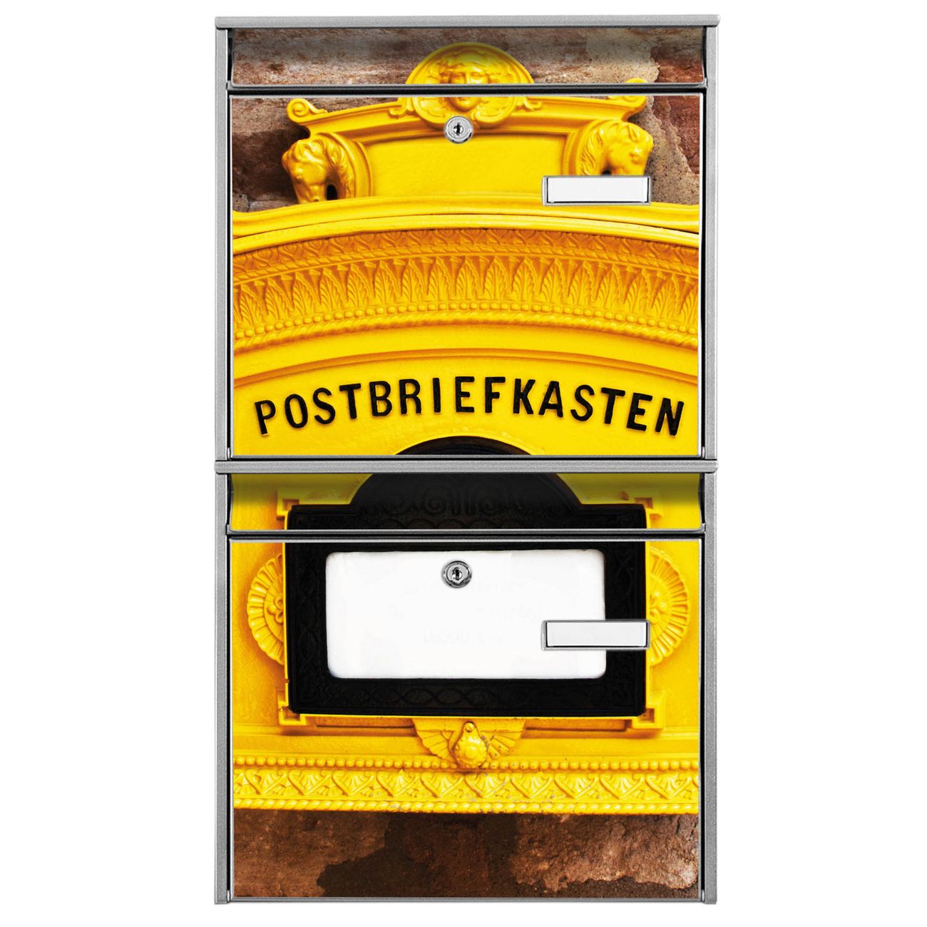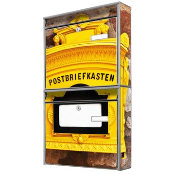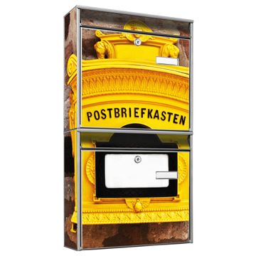 FUNKTION: Die Burg-Wächter Briefkastenanlage mit Motiv Historischer Postkasten bietet Ihnen ausreichend Fassungsvermögen um auch A4 und C4 Sendungen zu empfangen. Das integrierte Namensschild lässt sich individuell beschriften. Wählen Sie aus den Grundfarben weiß, silber und schwarz. DESIGN: Die 2 Briefkästen haben ein ansprechendes und zeitloses Design, ohne dabei auf Funktionalität zu verzichten. Das Material ist sehr stabil, wetterfest und rostfrei. Durch das Motiv Historischer Postkasten werden die Postkästen zu einem Blickfang. DETAILS: Die Postkästen bestehen aus verzinktem Stahl der zusätzlich mit Klarlack versiegelt wurde. Die Kästen sind gesamt 64,5cm hoch, 36,2cm breit und 10cm tief. Das Motiv besteht aus einer wetter- und UV-festen Folie, die Ihren Briefkasten zusätzlich vor Kratzern schützt. Die Postkästen werden mit Montagematerial, je einem Namensschild und je zwei Schlüsseln geliefert. NUTZEN: Das Briefkastenset eignet sich für die Wandmontage, die Größe bietet genügend Platz für Sendungen aller Art. Das zeitlose Design sowie die stabile Bauart bieten Ihnen einen treuen Begleiter für Ihre Post. BANJADO: