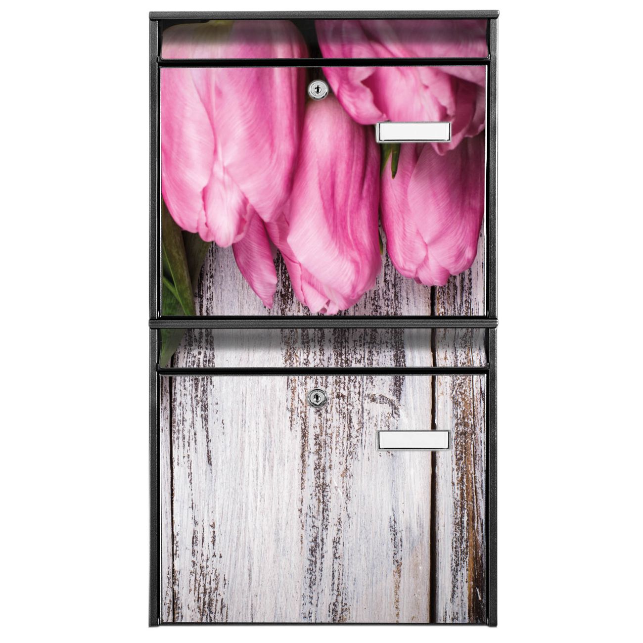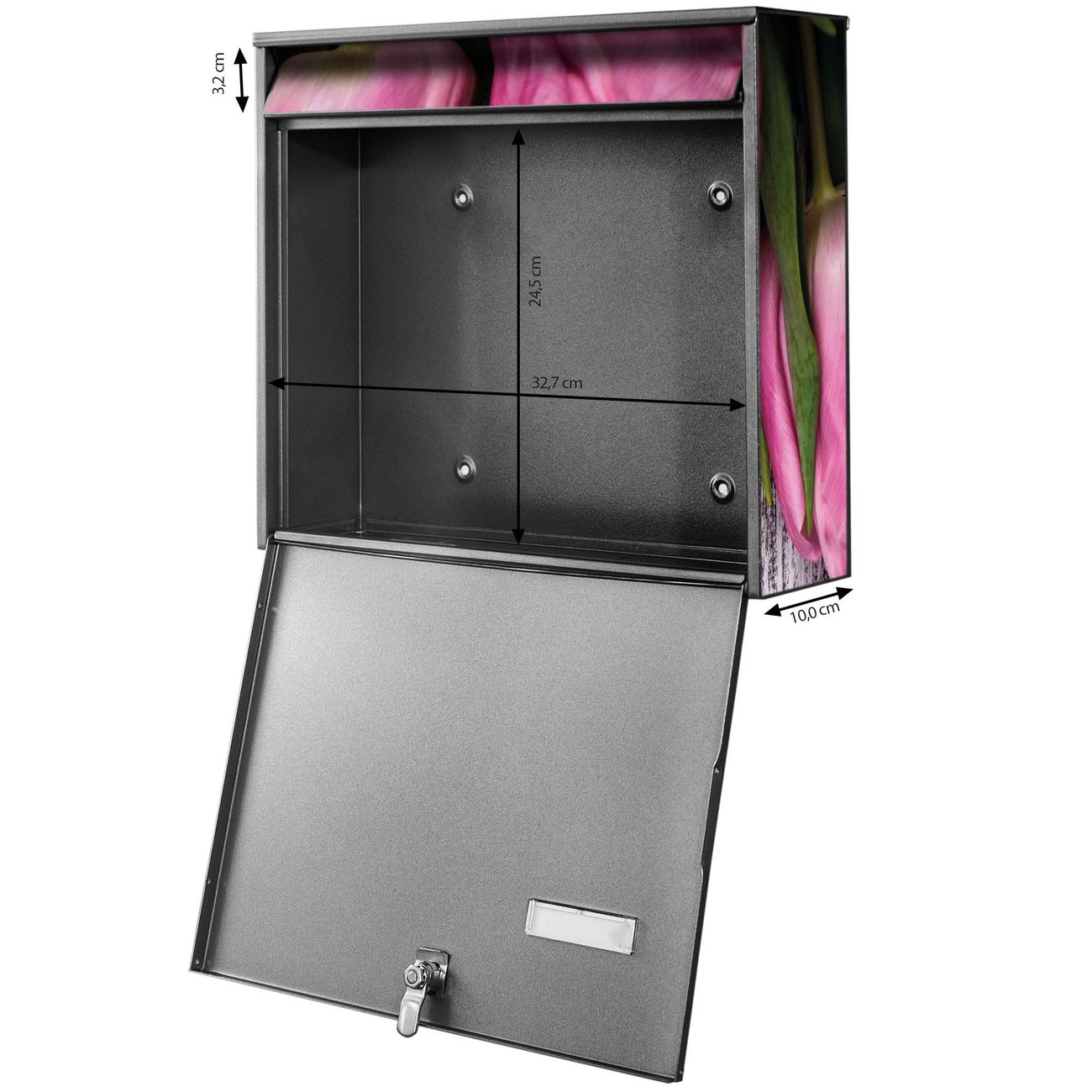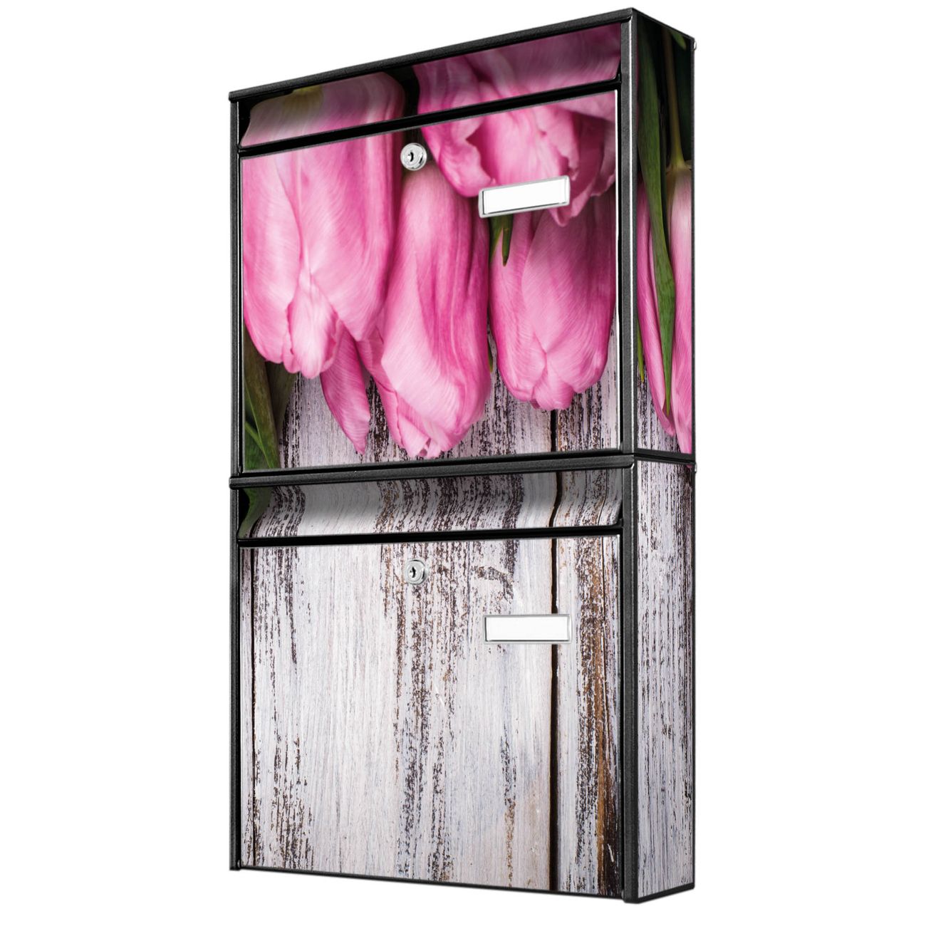 FUNKTION: Die Burg-Wächter Briefkastenanlage mit Motiv Holz und Tulpen bietet Ihnen ausreichend Fassungsvermögen um auch A4 und C4 Sendungen zu empfangen. Das integrierte Namensschild lässt sich individuell beschriften. Wählen Sie aus den Grundfarben weiß, silber und schwarz. DESIGN: Die 2 Briefkästen haben ein ansprechendes und zeitloses Design, ohne dabei auf Funktionalität zu verzichten. Das Material ist sehr stabil, wetterfest und rostfrei. Durch das Motiv Holz und Tulpen werden die Postkästen zu einem Blickfang. DETAILS: Die Postkästen bestehen aus verzinktem Stahl der zusätzlich mit Klarlack versiegelt wurde. Die Kästen sind gesamt 64,5cm hoch, 36,2cm breit und 10cm tief. Das Motiv besteht aus einer wetter- und UV-festen Folie, die Ihren Briefkasten zusätzlich vor Kratzern schützt. Die Postkästen werden mit Montagematerial, je einem Namensschild und je zwei Schlüsseln geliefert. NUTZEN: Das Briefkastenset eignet sich für die Wandmontage, die Größe bietet genügend Platz für Sendungen aller Art. Das zeitlose Design sowie die stabile Bauart bieten Ihnen einen treuen Begleiter für Ihre Post. BANJADO: