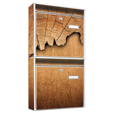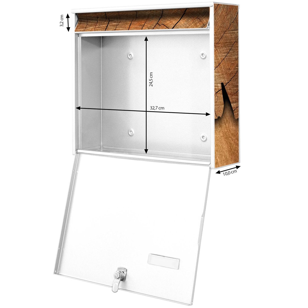 FUNKTION: Die Burg-Wächter Briefkastenanlage mit Motiv Holz bietet Ihnen ausreichend Fassungsvermögen um auch A4 und C4 Sendungen zu empfangen. Das integrierte Namensschild lässt sich individuell beschriften. Wählen Sie aus den Grundfarben weiß, silber und schwarz. DESIGN: Die 2 Briefkästen haben ein ansprechendes und zeitloses Design, ohne dabei auf Funktionalität zu verzichten. Das Material ist sehr stabil, wetterfest und rostfrei. Durch das Motiv Holz werden die Postkästen zu einem Blickfang. DETAILS: Die Postkästen bestehen aus verzinktem Stahl der zusätzlich mit Klarlack versiegelt wurde. Die Kästen sind gesamt 64,5cm hoch, 36,2cm breit und 10cm tief. Das Motiv besteht aus einer wetter- und UV-festen Folie, die Ihren Briefkasten zusätzlich vor Kratzern schützt. Die Postkästen werden mit Montagematerial, je einem Namensschild und je zwei Schlüsseln geliefert. NUTZEN: Das Briefkastenset eignet sich für die Wandmontage, die Größe bietet genügend Platz für Sendungen aller Art. Das zeitlose Design sowie die stabile Bauart bieten Ihnen einen treuen Begleiter für Ihre Post. BANJADO:
