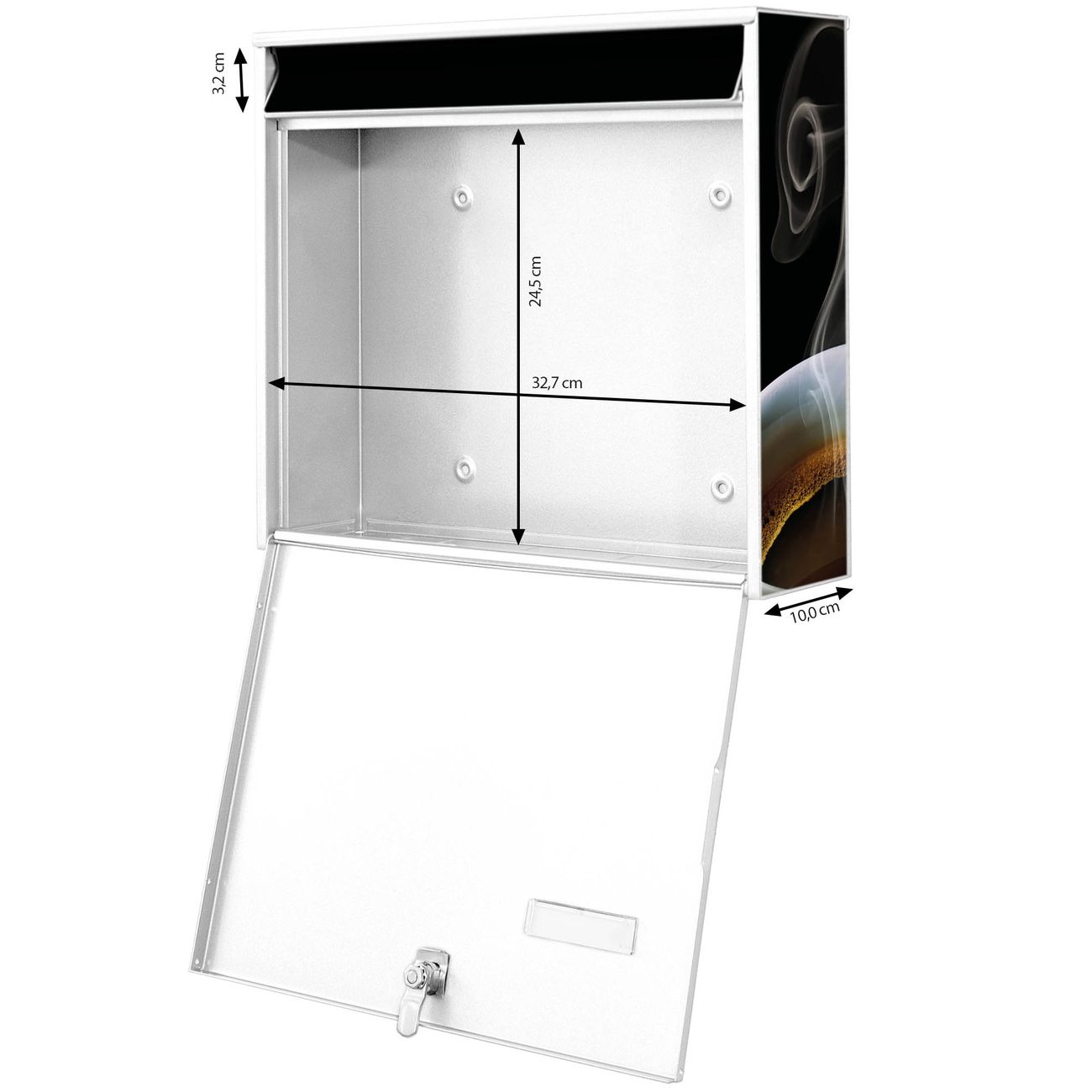 FUNKTION: Die Burg-Wächter Briefkastenanlage mit Motiv Hot Coffee bietet Ihnen ausreichend Fassungsvermögen um auch A4 und C4 Sendungen zu empfangen. Das integrierte Namensschild lässt sich individuell beschriften. Wählen Sie aus den Grundfarben weiß, silber und schwarz. DESIGN: Die 2 Briefkästen haben ein ansprechendes und zeitloses Design, ohne dabei auf Funktionalität zu verzichten. Das Material ist sehr stabil, wetterfest und rostfrei. Durch das Motiv Hot Coffee werden die Postkästen zu einem Blickfang. DETAILS: Die Postkästen bestehen aus verzinktem Stahl der zusätzlich mit Klarlack versiegelt wurde. Die Kästen sind gesamt 64,5cm hoch, 36,2cm breit und 10cm tief. Das Motiv besteht aus einer wetter- und UV-festen Folie, die Ihren Briefkasten zusätzlich vor Kratzern schützt. Die Postkästen werden mit Montagematerial, je einem Namensschild und je zwei Schlüsseln geliefert. NUTZEN: Das Briefkastenset eignet sich für die Wandmontage, die Größe bietet genügend Platz für Sendungen aller Art. Das zeitlose Design sowie die stabile Bauart bieten Ihnen einen treuen Begleiter für Ihre Post. BANJADO: