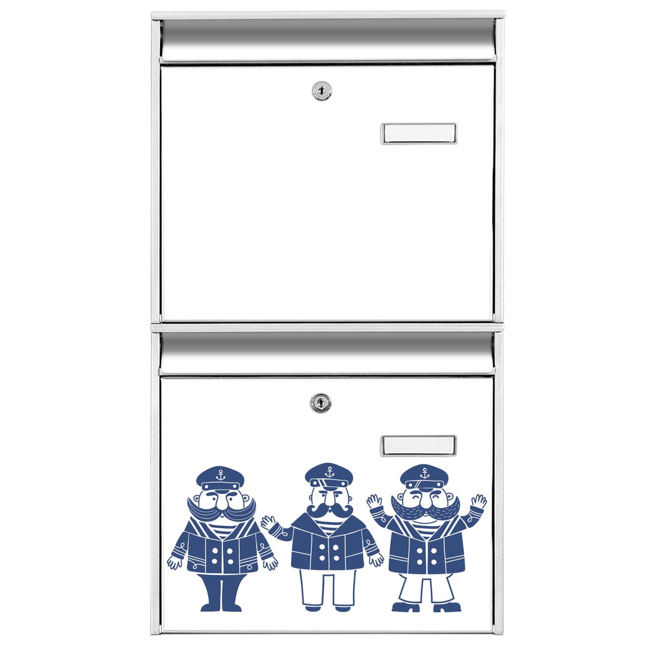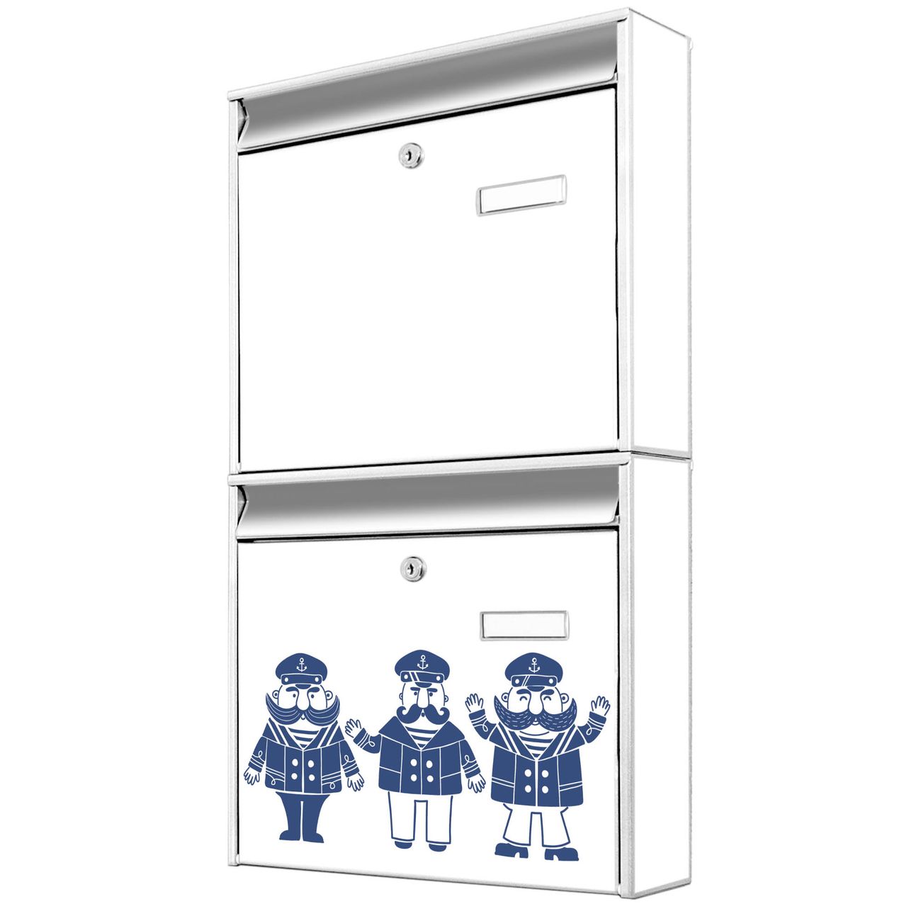 FUNKTION: Die Burg-Wächter Briefkastenanlage mit Motiv I Love Sea bietet Ihnen ausreichend Fassungsvermögen um auch A4 und C4 Sendungen zu empfangen. Das integrierte Namensschild lässt sich individuell beschriften. Wählen Sie aus den Grundfarben weiß, silber und schwarz. DESIGN: Die 2 Briefkästen haben ein ansprechendes und zeitloses Design, ohne dabei auf Funktionalität zu verzichten. Das Material ist sehr stabil, wetterfest und rostfrei. Durch das Motiv I Love Sea werden die Postkästen zu einem Blickfang. DETAILS: Die Postkästen bestehen aus verzinktem Stahl der zusätzlich mit Klarlack versiegelt wurde. Die Kästen sind gesamt 64,5cm hoch, 36,2cm breit und 10cm tief. Das Motiv besteht aus einer wetter- und UV-festen Folie, die Ihren Briefkasten zusätzlich vor Kratzern schützt. Die Postkästen werden mit Montagematerial, je einem Namensschild und je zwei Schlüsseln geliefert. NUTZEN: Das Briefkastenset eignet sich für die Wandmontage, die Größe bietet genügend Platz für Sendungen aller Art. Das zeitlose Design sowie die stabile Bauart bieten Ihnen einen treuen Begleiter für Ihre Post. BANJADO: