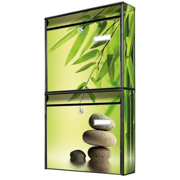 FUNKTION: Die Burg-Wächter Briefkastenanlage mit Motiv Innere Ruhe bietet Ihnen ausreichend Fassungsvermögen um auch A4 und C4 Sendungen zu empfangen. Das integrierte Namensschild lässt sich individuell beschriften. Wählen Sie aus den Grundfarben weiß, silber und schwarz. DESIGN: Die 2 Briefkästen haben ein ansprechendes und zeitloses Design, ohne dabei auf Funktionalität zu verzichten. Das Material ist sehr stabil, wetterfest und rostfrei. Durch das Motiv Innere Ruhe werden die Postkästen zu einem Blickfang. DETAILS: Die Postkästen bestehen aus verzinktem Stahl der zusätzlich mit Klarlack versiegelt wurde. Die Kästen sind gesamt 64,5cm hoch, 36,2cm breit und 10cm tief. Das Motiv besteht aus einer wetter- und UV-festen Folie, die Ihren Briefkasten zusätzlich vor Kratzern schützt. Die Postkästen werden mit Montagematerial, je einem Namensschild und je zwei Schlüsseln geliefert. NUTZEN: Das Briefkastenset eignet sich für die Wandmontage, die Größe bietet genügend Platz für Sendungen aller Art. Das zeitlose Design sowie die stabile Bauart bieten Ihnen einen treuen Begleiter für Ihre Post. BANJADO: