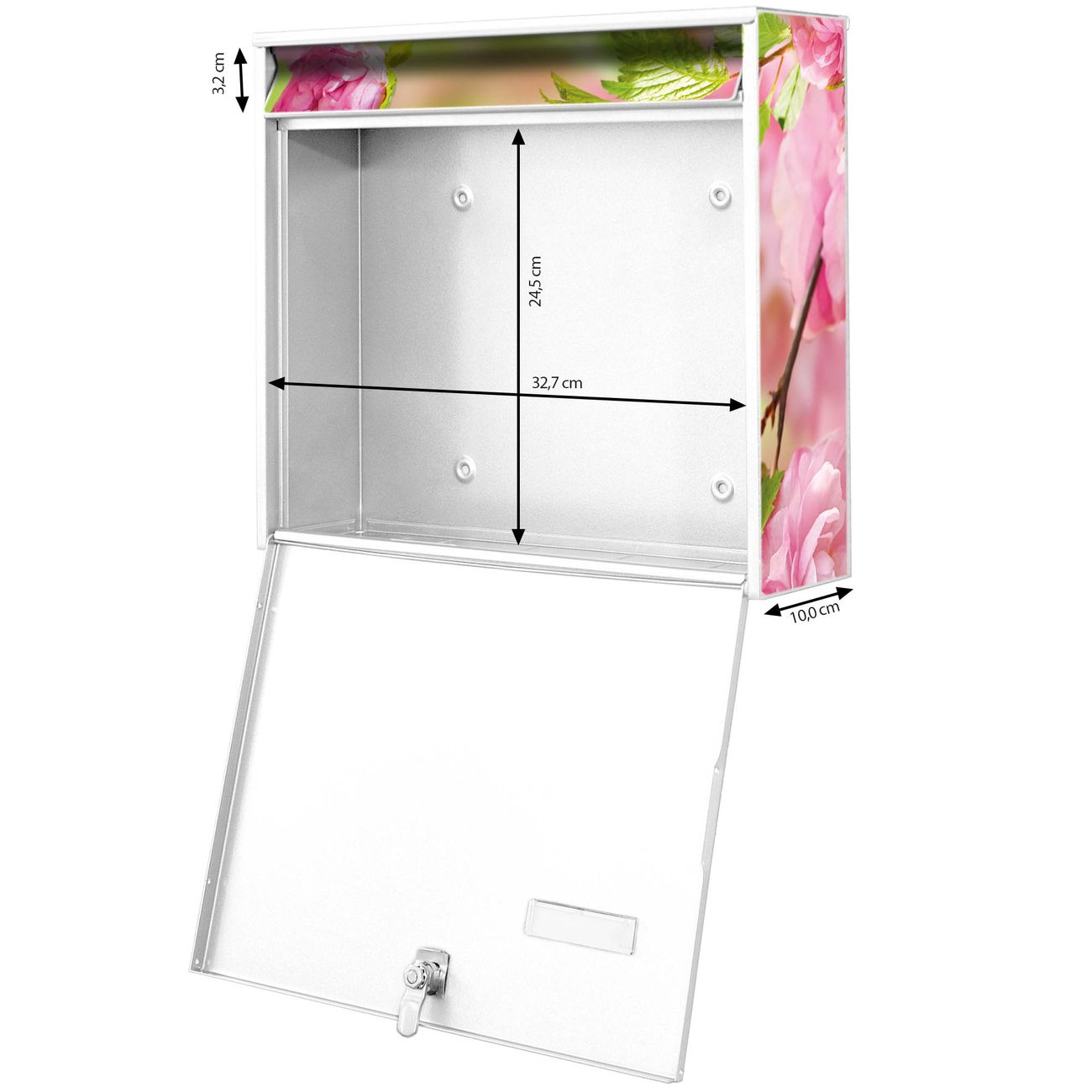 FUNKTION: Die Burg-Wächter Briefkastenanlage mit Motiv Japanische Kirschblüte bietet Ihnen ausreichend Fassungsvermögen um auch A4 und C4 Sendungen zu empfangen. Das integrierte Namensschild lässt sich individuell beschriften. Wählen Sie aus den Grundfarben weiß, silber und schwarz. DESIGN: Die 2 Briefkästen haben ein ansprechendes und zeitloses Design, ohne dabei auf Funktionalität zu verzichten. Das Material ist sehr stabil, wetterfest und rostfrei. Durch das Motiv Japanische Kirschblüte werden die Postkästen zu einem Blickfang. DETAILS: Die Postkästen bestehen aus verzinktem Stahl der zusätzlich mit Klarlack versiegelt wurde. Die Kästen sind gesamt 64,5cm hoch, 36,2cm breit und 10cm tief. Das Motiv besteht aus einer wetter- und UV-festen Folie, die Ihren Briefkasten zusätzlich vor Kratzern schützt. Die Postkästen werden mit Montagematerial, je einem Namensschild und je zwei Schlüsseln geliefert. NUTZEN: Das Briefkastenset eignet sich für die Wandmontage, die Größe bietet genügend Platz für Sendungen aller Art. Das zeitlose Design sowie die stabile Bauart bieten Ihnen einen treuen Begleiter für Ihre Post. BANJADO: