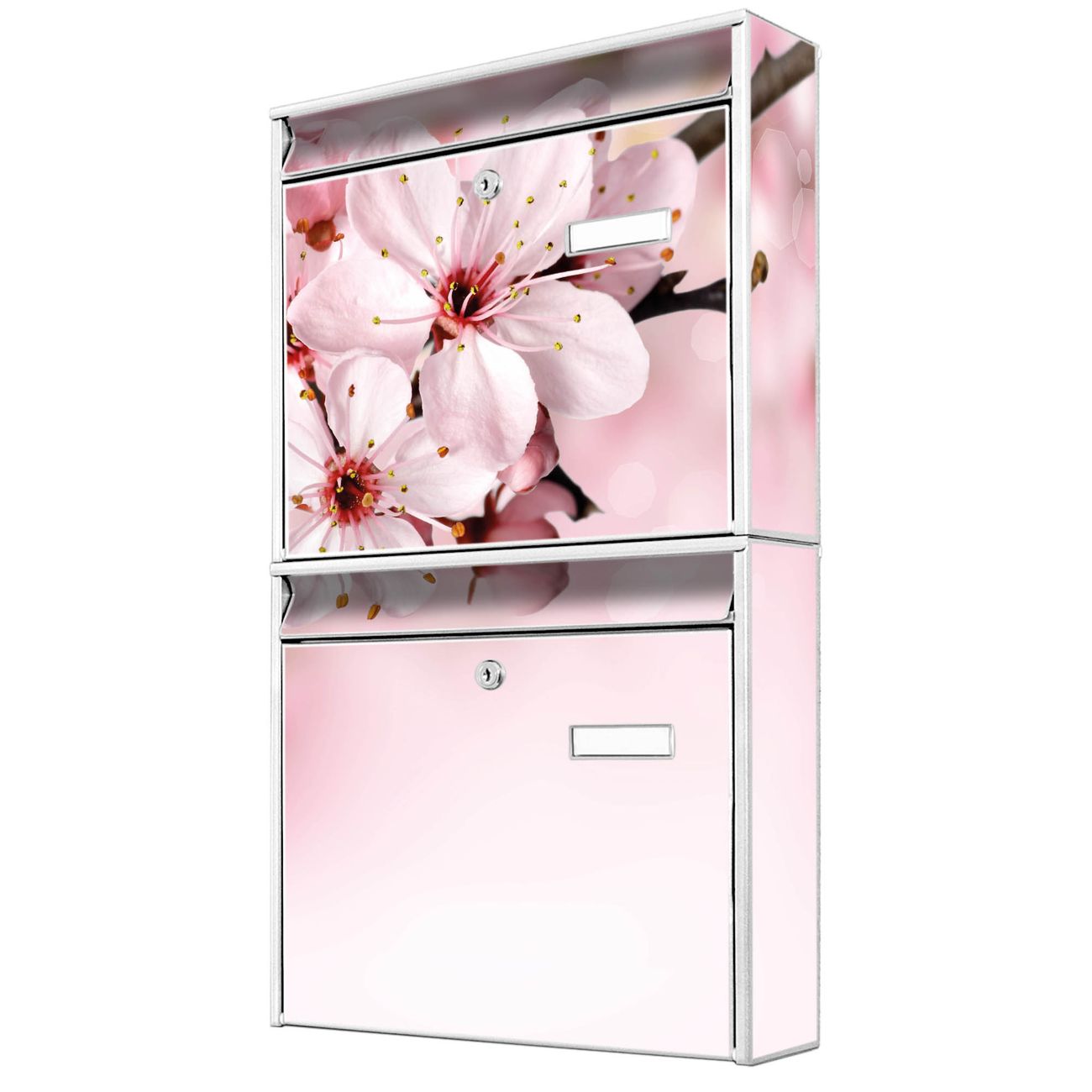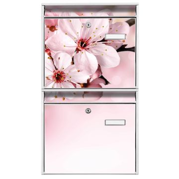 FUNKTION: Die Burg-Wächter Briefkastenanlage mit Motiv Japanische Kirsche bietet Ihnen ausreichend Fassungsvermögen um auch A4 und C4 Sendungen zu empfangen. Das integrierte Namensschild lässt sich individuell beschriften. Wählen Sie aus den Grundfarben weiß, silber und schwarz. DESIGN: Die 2 Briefkästen haben ein ansprechendes und zeitloses Design, ohne dabei auf Funktionalität zu verzichten. Das Material ist sehr stabil, wetterfest und rostfrei. Durch das Motiv Japanische Kirsche werden die Postkästen zu einem Blickfang. DETAILS: Die Postkästen bestehen aus verzinktem Stahl der zusätzlich mit Klarlack versiegelt wurde. Die Kästen sind gesamt 64,5cm hoch, 36,2cm breit und 10cm tief. Das Motiv besteht aus einer wetter- und UV-festen Folie, die Ihren Briefkasten zusätzlich vor Kratzern schützt. Die Postkästen werden mit Montagematerial, je einem Namensschild und je zwei Schlüsseln geliefert. NUTZEN: Das Briefkastenset eignet sich für die Wandmontage, die Größe bietet genügend Platz für Sendungen aller Art. Das zeitlose Design sowie die stabile Bauart bieten Ihnen einen treuen Begleiter für Ihre Post. BANJADO: