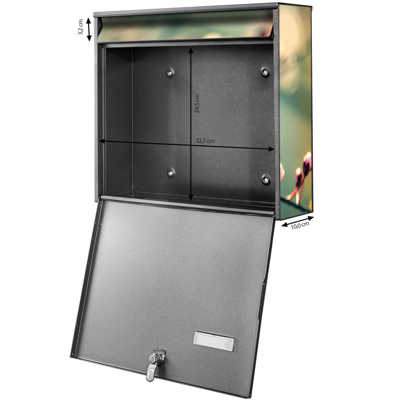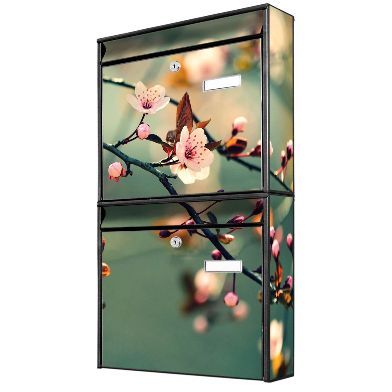 FUNKTION: Die Burg-Wächter Briefkastenanlage mit Motiv Japankirsche bietet Ihnen ausreichend Fassungsvermögen um auch A4 und C4 Sendungen zu empfangen. Das integrierte Namensschild lässt sich individuell beschriften. Wählen Sie aus den Grundfarben weiß, silber und schwarz. DESIGN: Die 2 Briefkästen haben ein ansprechendes und zeitloses Design, ohne dabei auf Funktionalität zu verzichten. Das Material ist sehr stabil, wetterfest und rostfrei. Durch das Motiv Japankirsche werden die Postkästen zu einem Blickfang. DETAILS: Die Postkästen bestehen aus verzinktem Stahl der zusätzlich mit Klarlack versiegelt wurde. Die Kästen sind gesamt 64,5cm hoch, 36,2cm breit und 10cm tief. Das Motiv besteht aus einer wetter- und UV-festen Folie, die Ihren Briefkasten zusätzlich vor Kratzern schützt. Die Postkästen werden mit Montagematerial, je einem Namensschild und je zwei Schlüsseln geliefert. NUTZEN: Das Briefkastenset eignet sich für die Wandmontage, die Größe bietet genügend Platz für Sendungen aller Art. Das zeitlose Design sowie die stabile Bauart bieten Ihnen einen treuen Begleiter für Ihre Post. BANJADO: