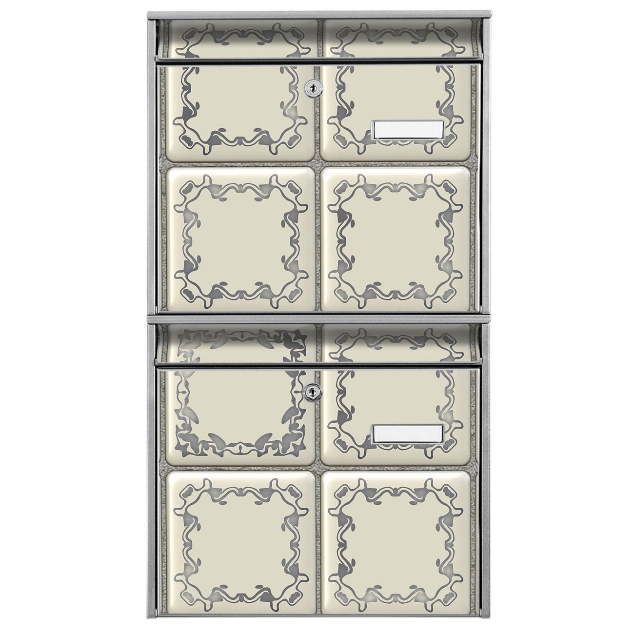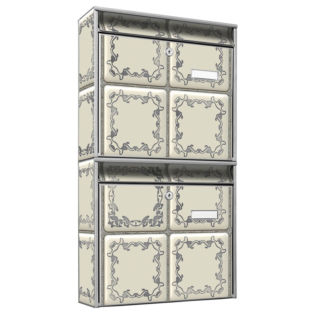 FUNKTION: Die Burg-Wächter Briefkastenanlage mit Motiv Kacheln bietet Ihnen ausreichend Fassungsvermögen um auch A4 und C4 Sendungen zu empfangen. Das integrierte Namensschild lässt sich individuell beschriften. Wählen Sie aus den Grundfarben weiß, silber und schwarz. DESIGN: Die 2 Briefkästen haben ein ansprechendes und zeitloses Design, ohne dabei auf Funktionalität zu verzichten. Das Material ist sehr stabil, wetterfest und rostfrei. Durch das Motiv Kacheln werden die Postkästen zu einem Blickfang. DETAILS: Die Postkästen bestehen aus verzinktem Stahl der zusätzlich mit Klarlack versiegelt wurde. Die Kästen sind gesamt 64,5cm hoch, 36,2cm breit und 10cm tief. Das Motiv besteht aus einer wetter- und UV-festen Folie, die Ihren Briefkasten zusätzlich vor Kratzern schützt. Die Postkästen werden mit Montagematerial, je einem Namensschild und je zwei Schlüsseln geliefert. NUTZEN: Das Briefkastenset eignet sich für die Wandmontage, die Größe bietet genügend Platz für Sendungen aller Art. Das zeitlose Design sowie die stabile Bauart bieten Ihnen einen treuen Begleiter für Ihre Post. BANJADO: