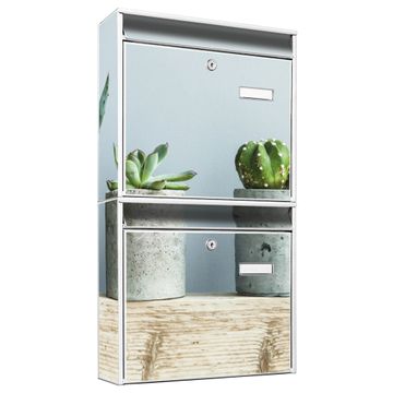 FUNKTION: Die Burg-Wächter Briefkastenanlage mit Motiv Kakteen in Beton bietet Ihnen ausreichend Fassungsvermögen um auch A4 und C4 Sendungen zu empfangen. Das integrierte Namensschild lässt sich individuell beschriften. Wählen Sie aus den Grundfarben weiß, silber und schwarz. DESIGN: Die 2 Briefkästen haben ein ansprechendes und zeitloses Design, ohne dabei auf Funktionalität zu verzichten. Das Material ist sehr stabil, wetterfest und rostfrei. Durch das Motiv Kakteen in Beton werden die Postkästen zu einem Blickfang. DETAILS: Die Postkästen bestehen aus verzinktem Stahl der zusätzlich mit Klarlack versiegelt wurde. Die Kästen sind gesamt 64,5cm hoch, 36,2cm breit und 10cm tief. Das Motiv besteht aus einer wetter- und UV-festen Folie, die Ihren Briefkasten zusätzlich vor Kratzern schützt. Die Postkästen werden mit Montagematerial, je einem Namensschild und je zwei Schlüsseln geliefert. NUTZEN: Das Briefkastenset eignet sich für die Wandmontage, die Größe bietet genügend Platz für Sendungen aller Art. Das zeitlose Design sowie die stabile Bauart bieten Ihnen einen treuen Begleiter für Ihre Post. BANJADO: