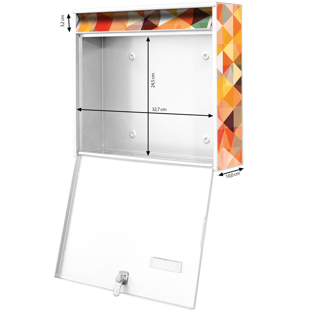 FUNKTION: Die Burg-Wächter Briefkastenanlage mit Motiv Kaleidoskop bietet Ihnen ausreichend Fassungsvermögen um auch A4 und C4 Sendungen zu empfangen. Das integrierte Namensschild lässt sich individuell beschriften. Wählen Sie aus den Grundfarben weiß, silber und schwarz. DESIGN: Die 2 Briefkästen haben ein ansprechendes und zeitloses Design, ohne dabei auf Funktionalität zu verzichten. Das Material ist sehr stabil, wetterfest und rostfrei. Durch das Motiv Kaleidoskop werden die Postkästen zu einem Blickfang. DETAILS: Die Postkästen bestehen aus verzinktem Stahl der zusätzlich mit Klarlack versiegelt wurde. Die Kästen sind gesamt 64,5cm hoch, 36,2cm breit und 10cm tief. Das Motiv besteht aus einer wetter- und UV-festen Folie, die Ihren Briefkasten zusätzlich vor Kratzern schützt. Die Postkästen werden mit Montagematerial, je einem Namensschild und je zwei Schlüsseln geliefert. NUTZEN: Das Briefkastenset eignet sich für die Wandmontage, die Größe bietet genügend Platz für Sendungen aller Art. Das zeitlose Design sowie die stabile Bauart bieten Ihnen einen treuen Begleiter für Ihre Post. BANJADO: