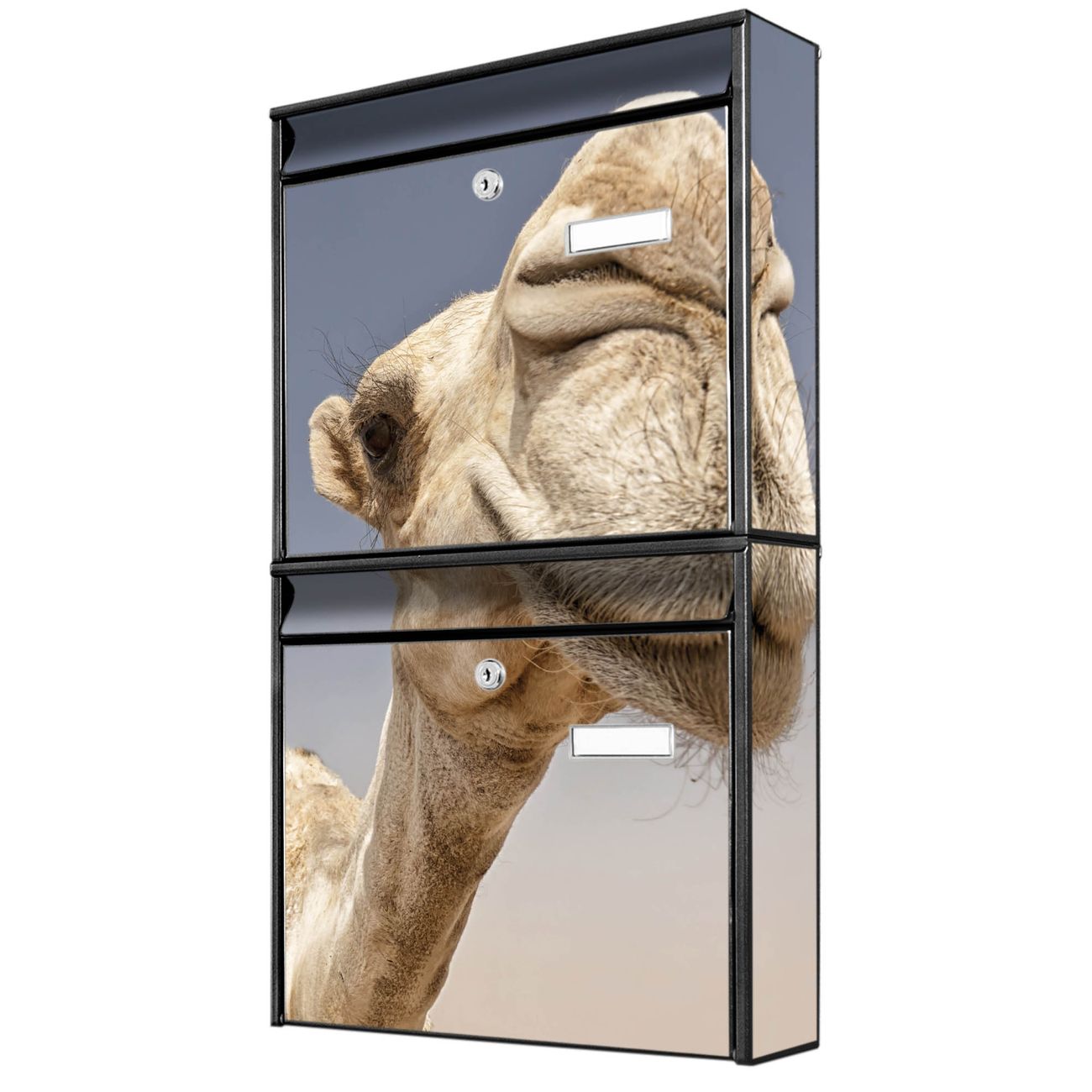 FUNKTION: Die Burg-Wächter Briefkastenanlage mit Motiv Kamele bietet Ihnen ausreichend Fassungsvermögen um auch A4 und C4 Sendungen zu empfangen. Das integrierte Namensschild lässt sich individuell beschriften. Wählen Sie aus den Grundfarben weiß, silber und schwarz. DESIGN: Die 2 Briefkästen haben ein ansprechendes und zeitloses Design, ohne dabei auf Funktionalität zu verzichten. Das Material ist sehr stabil, wetterfest und rostfrei. Durch das Motiv Kamele werden die Postkästen zu einem Blickfang. DETAILS: Die Postkästen bestehen aus verzinktem Stahl der zusätzlich mit Klarlack versiegelt wurde. Die Kästen sind gesamt 64,5cm hoch, 36,2cm breit und 10cm tief. Das Motiv besteht aus einer wetter- und UV-festen Folie, die Ihren Briefkasten zusätzlich vor Kratzern schützt. Die Postkästen werden mit Montagematerial, je einem Namensschild und je zwei Schlüsseln geliefert. NUTZEN: Das Briefkastenset eignet sich für die Wandmontage, die Größe bietet genügend Platz für Sendungen aller Art. Das zeitlose Design sowie die stabile Bauart bieten Ihnen einen treuen Begleiter für Ihre Post. BANJADO: