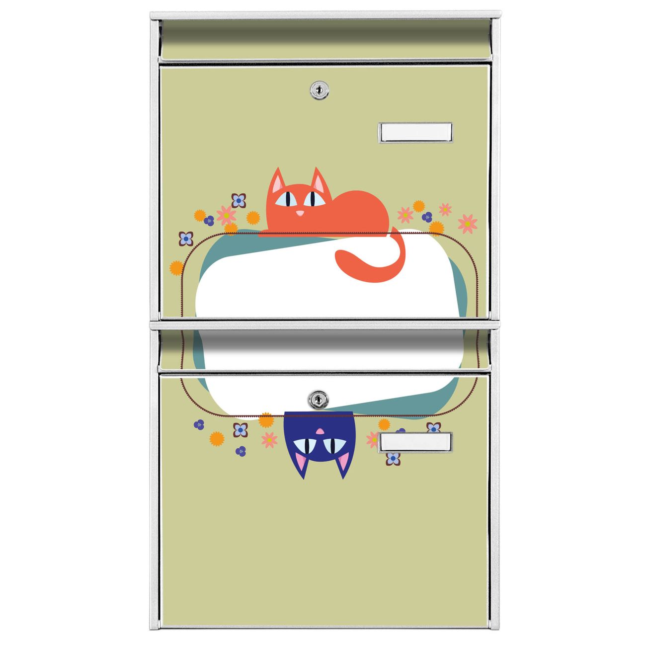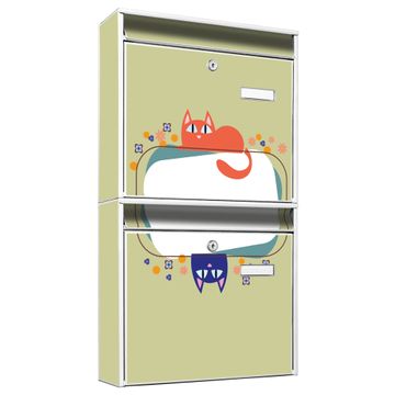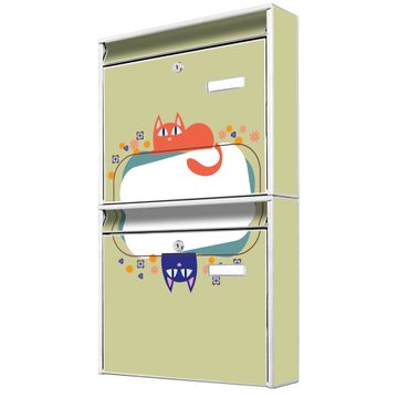 FUNKTION: Die Burg-Wächter Briefkastenanlage mit Motiv Karikatur Katzen bietet Ihnen ausreichend Fassungsvermögen um auch A4 und C4 Sendungen zu empfangen. Das integrierte Namensschild lässt sich individuell beschriften. Wählen Sie aus den Grundfarben weiß, silber und schwarz. DESIGN: Die 2 Briefkästen haben ein ansprechendes und zeitloses Design, ohne dabei auf Funktionalität zu verzichten. Das Material ist sehr stabil, wetterfest und rostfrei. Durch das Motiv Karikatur Katzen werden die Postkästen zu einem Blickfang. DETAILS: Die Postkästen bestehen aus verzinktem Stahl der zusätzlich mit Klarlack versiegelt wurde. Die Kästen sind gesamt 64,5cm hoch, 36,2cm breit und 10cm tief. Das Motiv besteht aus einer wetter- und UV-festen Folie, die Ihren Briefkasten zusätzlich vor Kratzern schützt. Die Postkästen werden mit Montagematerial, je einem Namensschild und je zwei Schlüsseln geliefert. NUTZEN: Das Briefkastenset eignet sich für die Wandmontage, die Größe bietet genügend Platz für Sendungen aller Art. Das zeitlose Design sowie die stabile Bauart bieten Ihnen einen treuen Begleiter für Ihre Post. BANJADO: