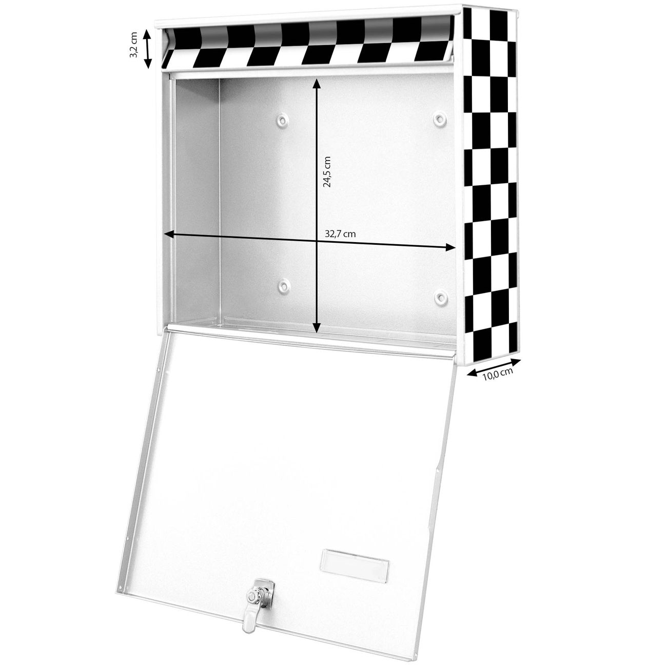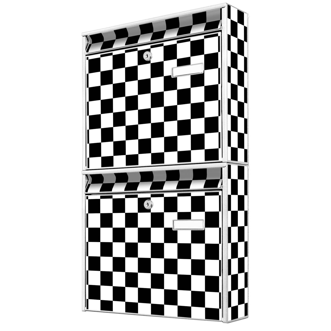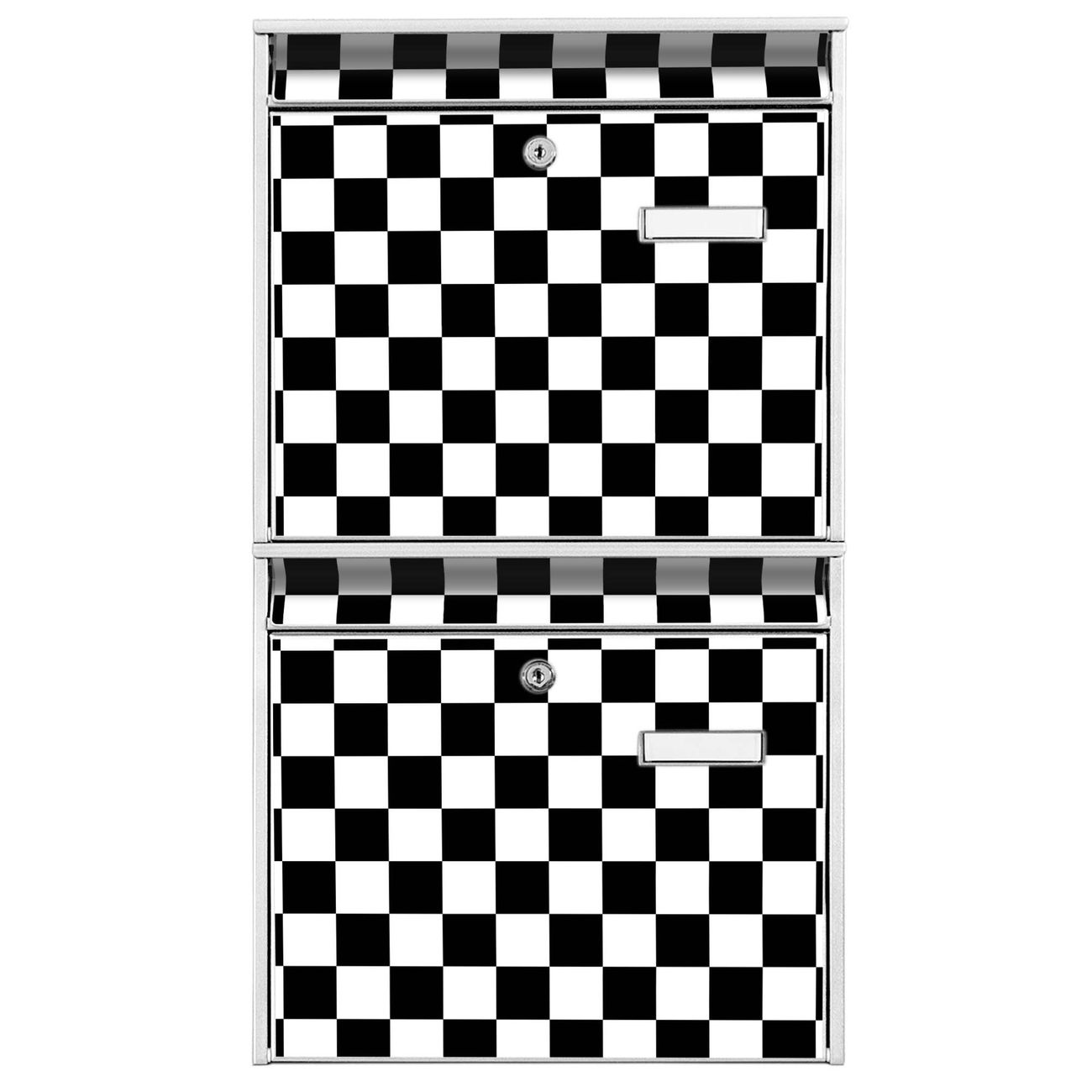FUNKTION: Die Burg-Wächter Briefkastenanlage mit Motiv Karo Schwarz bietet Ihnen ausreichend Fassungsvermögen um auch A4 und C4 Sendungen zu empfangen. Das integrierte Namensschild lässt sich individuell beschriften. Wählen Sie aus den Grundfarben weiß, silber und schwarz. DESIGN: Die 2 Briefkästen haben ein ansprechendes und zeitloses Design, ohne dabei auf Funktionalität zu verzichten. Das Material ist sehr stabil, wetterfest und rostfrei. Durch das Motiv Karo Schwarz werden die Postkästen zu einem Blickfang. DETAILS: Die Postkästen bestehen aus verzinktem Stahl der zusätzlich mit Klarlack versiegelt wurde. Die Kästen sind gesamt 64,5cm hoch, 36,2cm breit und 10cm tief. Das Motiv besteht aus einer wetter- und UV-festen Folie, die Ihren Briefkasten zusätzlich vor Kratzern schützt. Die Postkästen werden mit Montagematerial, je einem Namensschild und je zwei Schlüsseln geliefert. NUTZEN: Das Briefkastenset eignet sich für die Wandmontage, die Größe bietet genügend Platz für Sendungen aller Art. Das zeitlose Design sowie die stabile Bauart bieten Ihnen einen treuen Begleiter für Ihre Post. BANJADO: