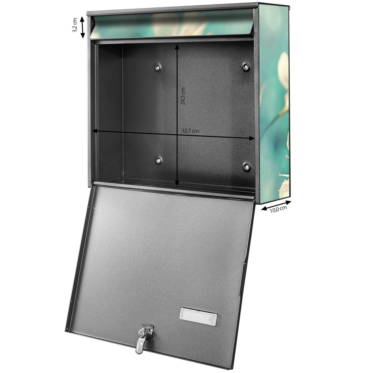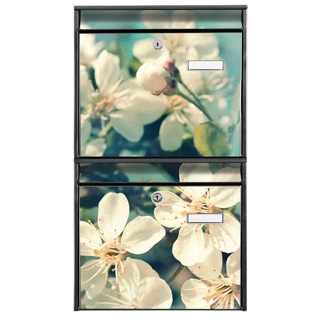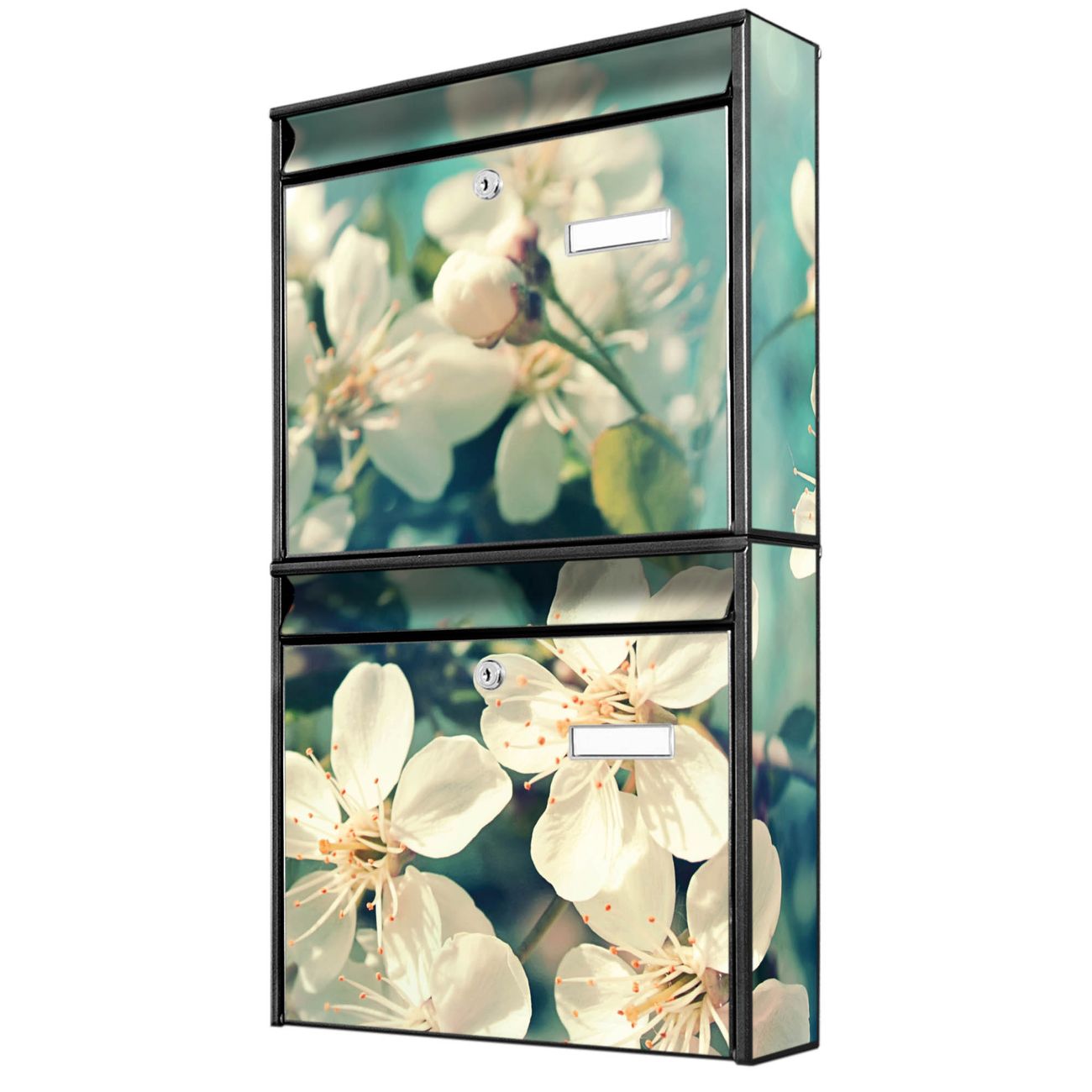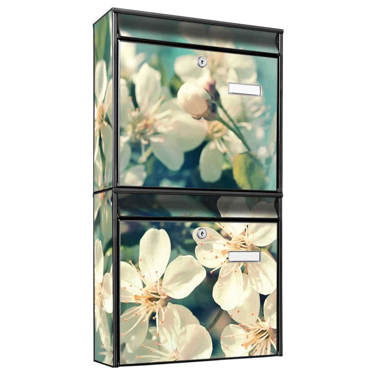 FUNKTION: Die Burg-Wächter Briefkastenanlage mit Motiv Kirschblüten 2 bietet Ihnen ausreichend Fassungsvermögen um auch A4 und C4 Sendungen zu empfangen. Das integrierte Namensschild lässt sich individuell beschriften. Wählen Sie aus den Grundfarben weiß, silber und schwarz. DESIGN: Die 2 Briefkästen haben ein ansprechendes und zeitloses Design, ohne dabei auf Funktionalität zu verzichten. Das Material ist sehr stabil, wetterfest und rostfrei. Durch das Motiv Kirschblüten 2 werden die Postkästen zu einem Blickfang. DETAILS: Die Postkästen bestehen aus verzinktem Stahl der zusätzlich mit Klarlack versiegelt wurde. Die Kästen sind gesamt 64,5cm hoch, 36,2cm breit und 10cm tief. Das Motiv besteht aus einer wetter- und UV-festen Folie, die Ihren Briefkasten zusätzlich vor Kratzern schützt. Die Postkästen werden mit Montagematerial, je einem Namensschild und je zwei Schlüsseln geliefert. NUTZEN: Das Briefkastenset eignet sich für die Wandmontage, die Größe bietet genügend Platz für Sendungen aller Art. Das zeitlose Design sowie die stabile Bauart bieten Ihnen einen treuen Begleiter für Ihre Post. BANJADO: