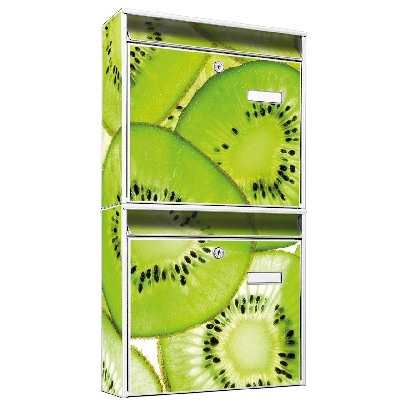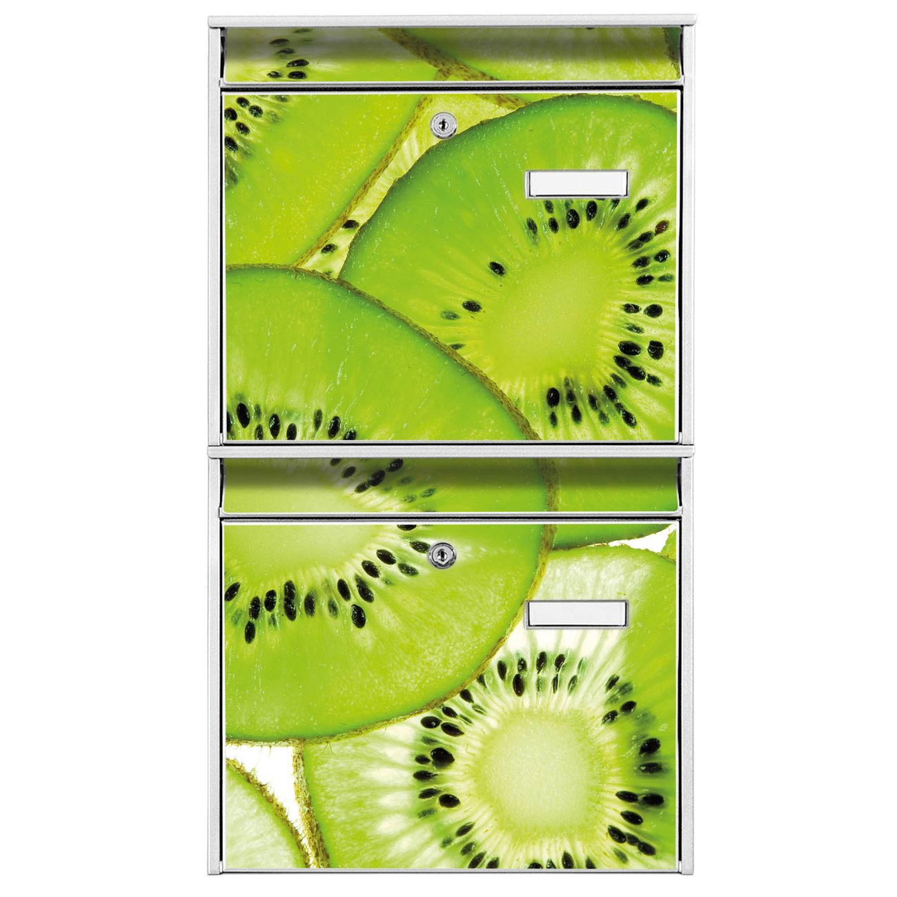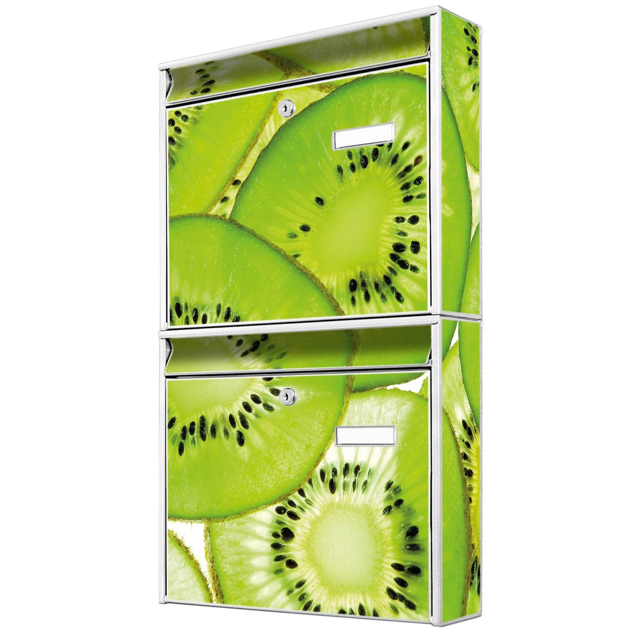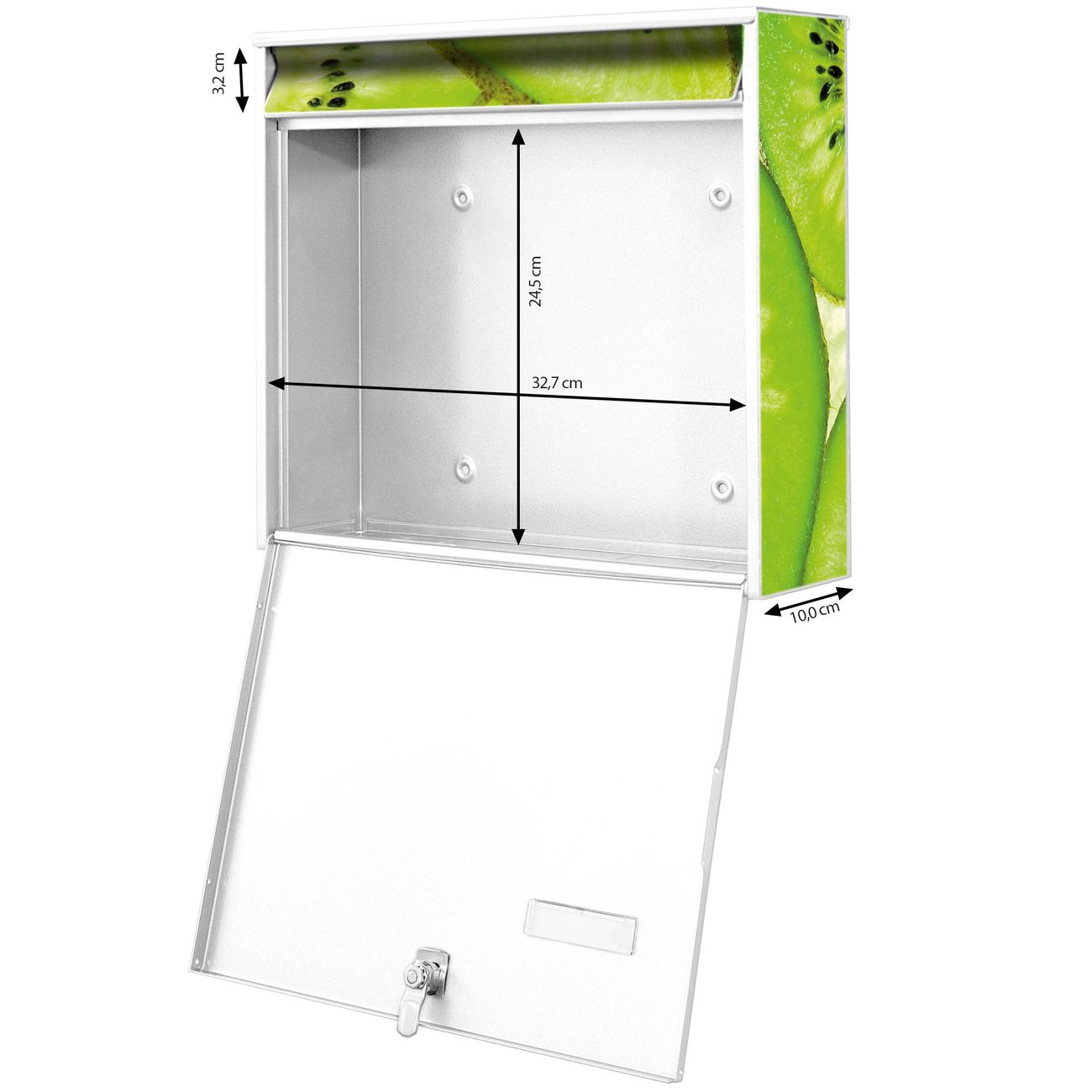 FUNKTION: Die Burg-Wächter Briefkastenanlage mit Motiv Kiwi bietet Ihnen ausreichend Fassungsvermögen um auch A4 und C4 Sendungen zu empfangen. Das integrierte Namensschild lässt sich individuell beschriften. Wählen Sie aus den Grundfarben weiß, silber und schwarz. DESIGN: Die 2 Briefkästen haben ein ansprechendes und zeitloses Design, ohne dabei auf Funktionalität zu verzichten. Das Material ist sehr stabil, wetterfest und rostfrei. Durch das Motiv Kiwi werden die Postkästen zu einem Blickfang. DETAILS: Die Postkästen bestehen aus verzinktem Stahl der zusätzlich mit Klarlack versiegelt wurde. Die Kästen sind gesamt 64,5cm hoch, 36,2cm breit und 10cm tief. Das Motiv besteht aus einer wetter- und UV-festen Folie, die Ihren Briefkasten zusätzlich vor Kratzern schützt. Die Postkästen werden mit Montagematerial, je einem Namensschild und je zwei Schlüsseln geliefert. NUTZEN: Das Briefkastenset eignet sich für die Wandmontage, die Größe bietet genügend Platz für Sendungen aller Art. Das zeitlose Design sowie die stabile Bauart bieten Ihnen einen treuen Begleiter für Ihre Post. BANJADO: