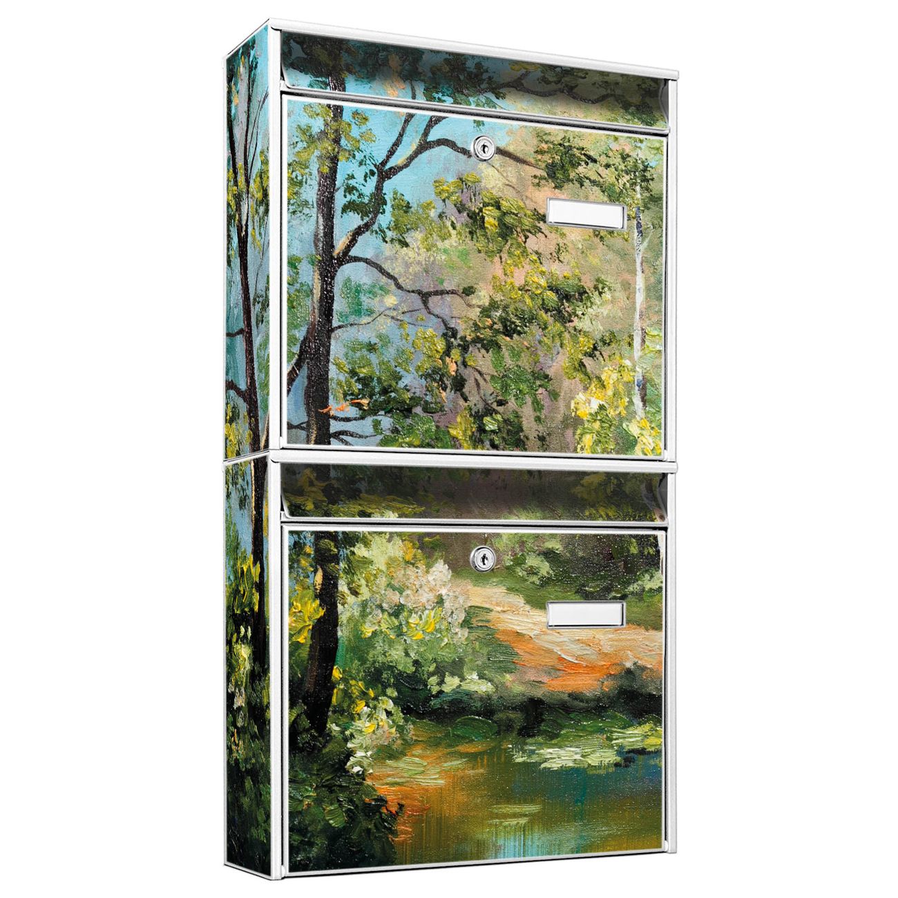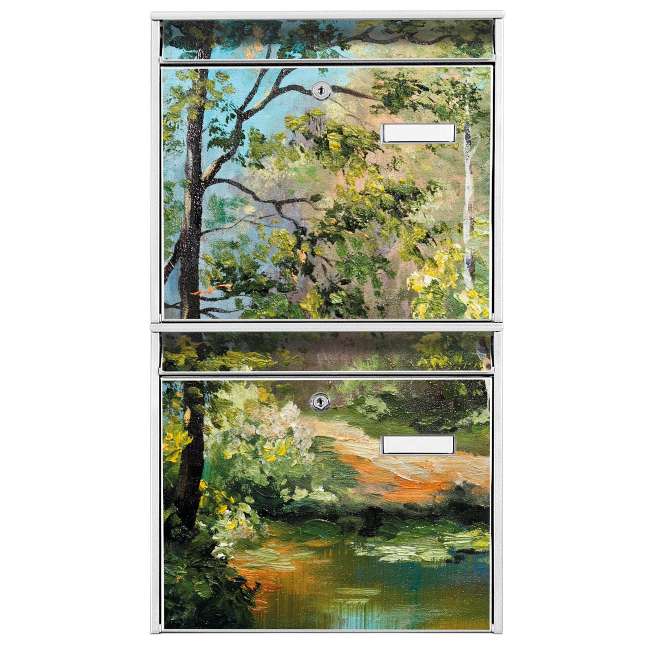 FUNKTION: Die Burg-Wächter Briefkastenanlage mit Motiv Kleine Brücke bietet Ihnen ausreichend Fassungsvermögen um auch A4 und C4 Sendungen zu empfangen. Das integrierte Namensschild lässt sich individuell beschriften. Wählen Sie aus den Grundfarben weiß, silber und schwarz. DESIGN: Die 2 Briefkästen haben ein ansprechendes und zeitloses Design, ohne dabei auf Funktionalität zu verzichten. Das Material ist sehr stabil, wetterfest und rostfrei. Durch das Motiv Kleine Brücke werden die Postkästen zu einem Blickfang. DETAILS: Die Postkästen bestehen aus verzinktem Stahl der zusätzlich mit Klarlack versiegelt wurde. Die Kästen sind gesamt 64,5cm hoch, 36,2cm breit und 10cm tief. Das Motiv besteht aus einer wetter- und UV-festen Folie, die Ihren Briefkasten zusätzlich vor Kratzern schützt. Die Postkästen werden mit Montagematerial, je einem Namensschild und je zwei Schlüsseln geliefert. NUTZEN: Das Briefkastenset eignet sich für die Wandmontage, die Größe bietet genügend Platz für Sendungen aller Art. Das zeitlose Design sowie die stabile Bauart bieten Ihnen einen treuen Begleiter für Ihre Post. BANJADO: