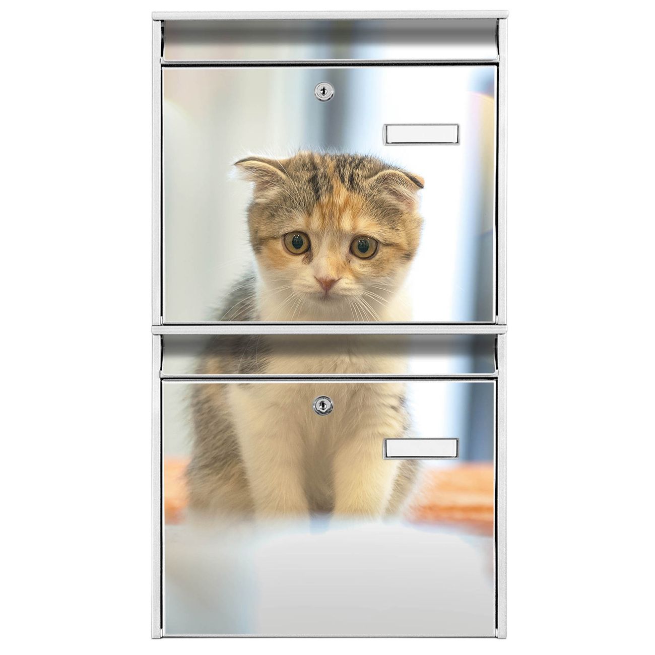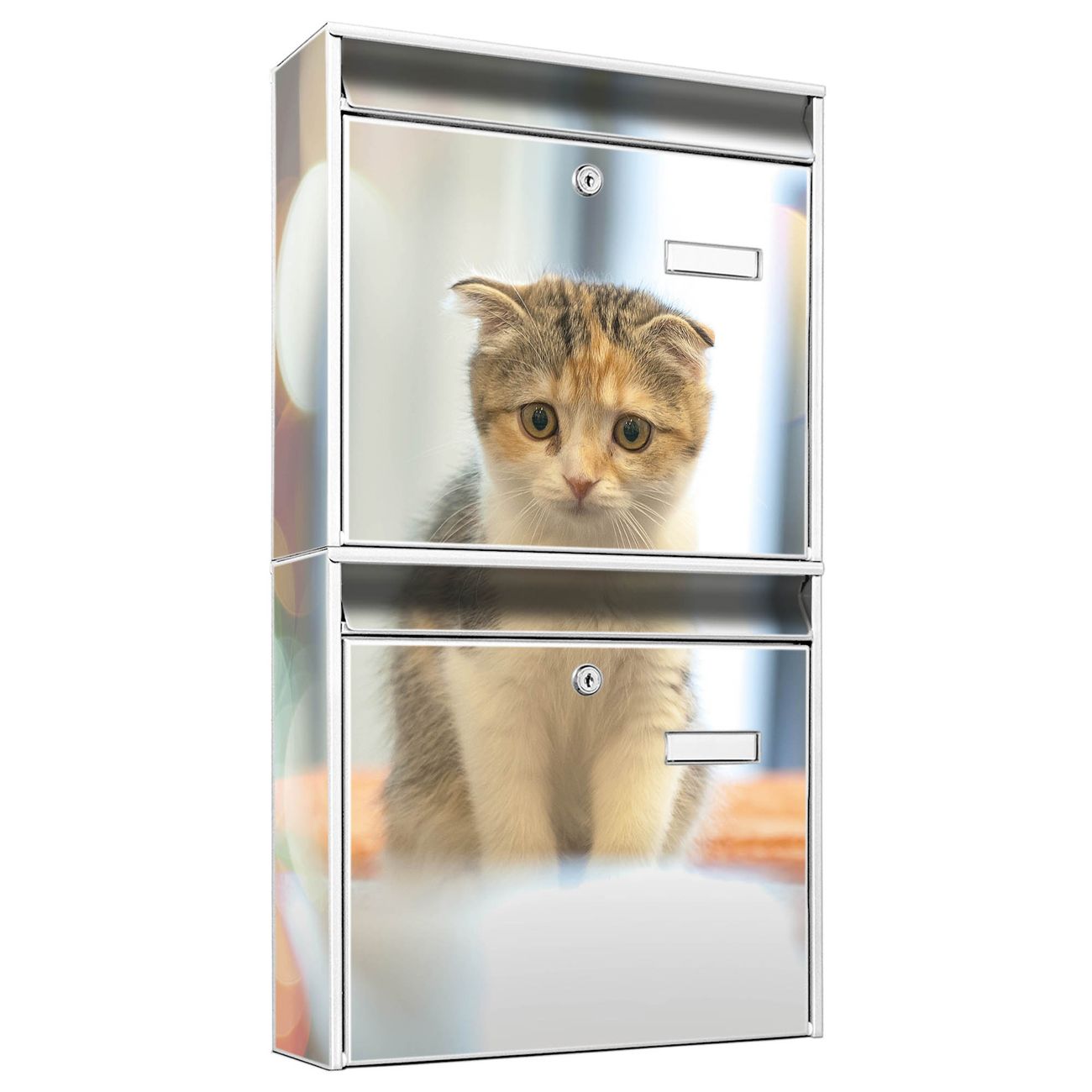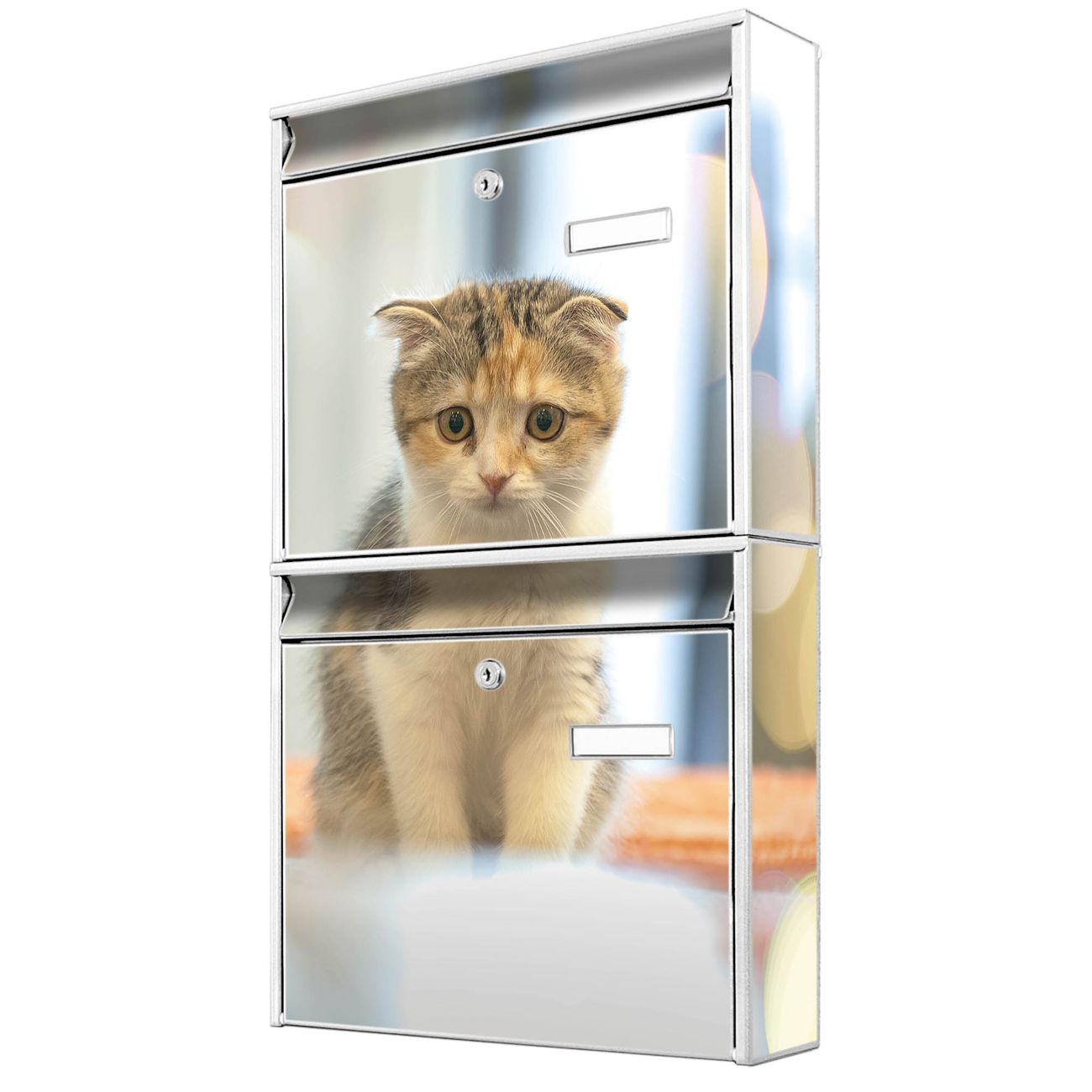 FUNKTION: Die Burg-Wächter Briefkastenanlage mit Motiv Kleine Katze bietet Ihnen ausreichend Fassungsvermögen um auch A4 und C4 Sendungen zu empfangen. Das integrierte Namensschild lässt sich individuell beschriften. Wählen Sie aus den Grundfarben weiß, silber und schwarz. DESIGN: Die 2 Briefkästen haben ein ansprechendes und zeitloses Design, ohne dabei auf Funktionalität zu verzichten. Das Material ist sehr stabil, wetterfest und rostfrei. Durch das Motiv Kleine Katze werden die Postkästen zu einem Blickfang. DETAILS: Die Postkästen bestehen aus verzinktem Stahl der zusätzlich mit Klarlack versiegelt wurde. Die Kästen sind gesamt 64,5cm hoch, 36,2cm breit und 10cm tief. Das Motiv besteht aus einer wetter- und UV-festen Folie, die Ihren Briefkasten zusätzlich vor Kratzern schützt. Die Postkästen werden mit Montagematerial, je einem Namensschild und je zwei Schlüsseln geliefert. NUTZEN: Das Briefkastenset eignet sich für die Wandmontage, die Größe bietet genügend Platz für Sendungen aller Art. Das zeitlose Design sowie die stabile Bauart bieten Ihnen einen treuen Begleiter für Ihre Post. BANJADO: