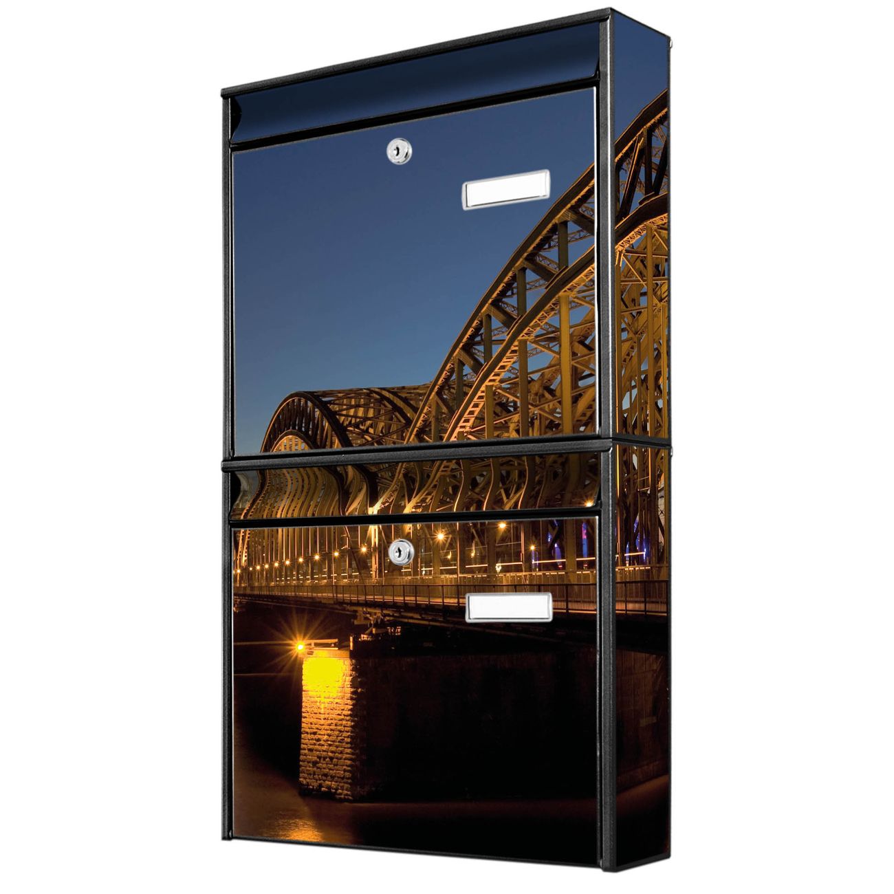FUNKTION: Die Burg-Wächter Briefkastenanlage mit Motiv Köln bietet Ihnen ausreichend Fassungsvermögen um auch A4 und C4 Sendungen zu empfangen. Das integrierte Namensschild lässt sich individuell beschriften. Wählen Sie aus den Grundfarben weiß, silber und schwarz. DESIGN: Die 2 Briefkästen haben ein ansprechendes und zeitloses Design, ohne dabei auf Funktionalität zu verzichten. Das Material ist sehr stabil, wetterfest und rostfrei. Durch das Motiv Köln werden die Postkästen zu einem Blickfang. DETAILS: Die Postkästen bestehen aus verzinktem Stahl der zusätzlich mit Klarlack versiegelt wurde. Die Kästen sind gesamt 64,5cm hoch, 36,2cm breit und 10cm tief. Das Motiv besteht aus einer wetter- und UV-festen Folie, die Ihren Briefkasten zusätzlich vor Kratzern schützt. Die Postkästen werden mit Montagematerial, je einem Namensschild und je zwei Schlüsseln geliefert. NUTZEN: Das Briefkastenset eignet sich für die Wandmontage, die Größe bietet genügend Platz für Sendungen aller Art. Das zeitlose Design sowie die stabile Bauart bieten Ihnen einen treuen Begleiter für Ihre Post. BANJADO: