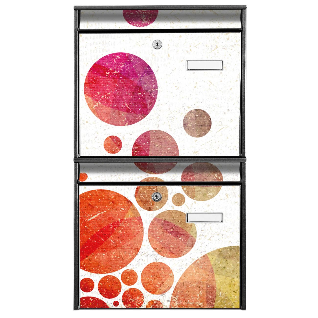 FUNKTION: Die Burg-Wächter Briefkastenanlage mit Motiv Kreise bietet Ihnen ausreichend Fassungsvermögen um auch A4 und C4 Sendungen zu empfangen. Das integrierte Namensschild lässt sich individuell beschriften. Wählen Sie aus den Grundfarben weiß, silber und schwarz. DESIGN: Die 2 Briefkästen haben ein ansprechendes und zeitloses Design, ohne dabei auf Funktionalität zu verzichten. Das Material ist sehr stabil, wetterfest und rostfrei. Durch das Motiv Kreise werden die Postkästen zu einem Blickfang. DETAILS: Die Postkästen bestehen aus verzinktem Stahl der zusätzlich mit Klarlack versiegelt wurde. Die Kästen sind gesamt 64,5cm hoch, 36,2cm breit und 10cm tief. Das Motiv besteht aus einer wetter- und UV-festen Folie, die Ihren Briefkasten zusätzlich vor Kratzern schützt. Die Postkästen werden mit Montagematerial, je einem Namensschild und je zwei Schlüsseln geliefert. NUTZEN: Das Briefkastenset eignet sich für die Wandmontage, die Größe bietet genügend Platz für Sendungen aller Art. Das zeitlose Design sowie die stabile Bauart bieten Ihnen einen treuen Begleiter für Ihre Post. BANJADO: