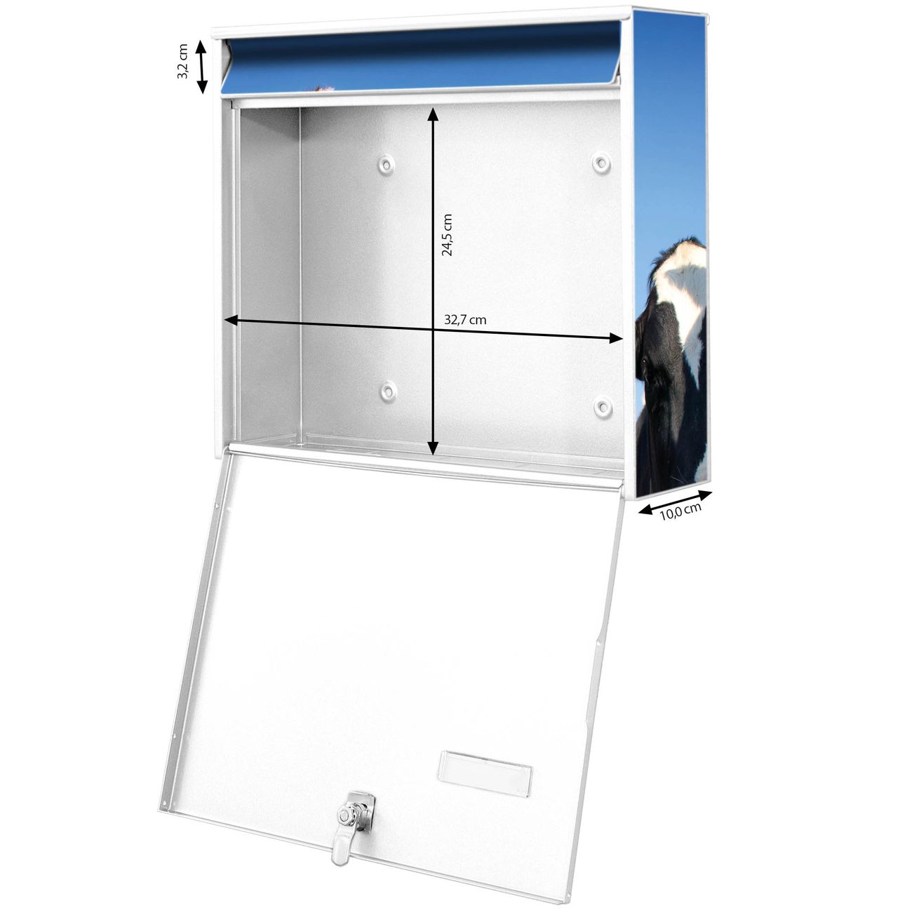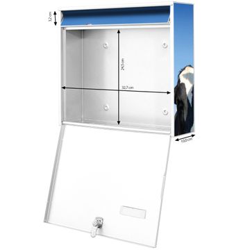 FUNKTION: Die Burg-Wächter Briefkastenanlage mit Motiv Kühe bietet Ihnen ausreichend Fassungsvermögen um auch A4 und C4 Sendungen zu empfangen. Das integrierte Namensschild lässt sich individuell beschriften. Wählen Sie aus den Grundfarben weiß, silber und schwarz. DESIGN: Die 2 Briefkästen haben ein ansprechendes und zeitloses Design, ohne dabei auf Funktionalität zu verzichten. Das Material ist sehr stabil, wetterfest und rostfrei. Durch das Motiv Kühe werden die Postkästen zu einem Blickfang. DETAILS: Die Postkästen bestehen aus verzinktem Stahl der zusätzlich mit Klarlack versiegelt wurde. Die Kästen sind gesamt 64,5cm hoch, 36,2cm breit und 10cm tief. Das Motiv besteht aus einer wetter- und UV-festen Folie, die Ihren Briefkasten zusätzlich vor Kratzern schützt. Die Postkästen werden mit Montagematerial, je einem Namensschild und je zwei Schlüsseln geliefert. NUTZEN: Das Briefkastenset eignet sich für die Wandmontage, die Größe bietet genügend Platz für Sendungen aller Art. Das zeitlose Design sowie die stabile Bauart bieten Ihnen einen treuen Begleiter für Ihre Post. BANJADO:
