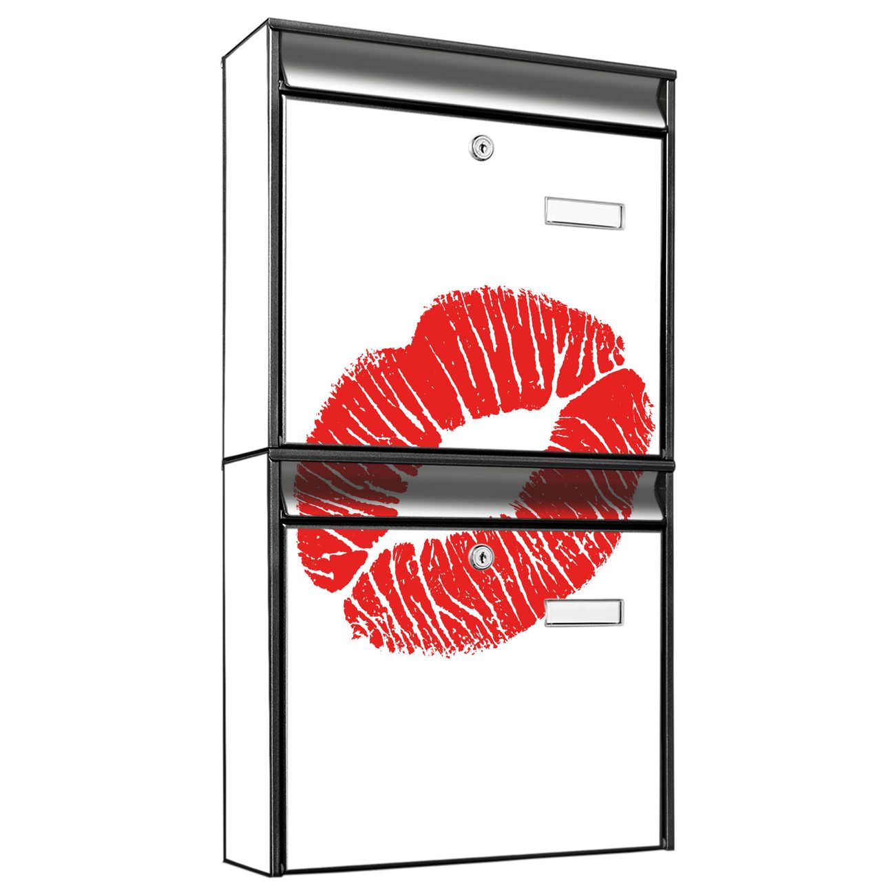 FUNKTION: Die Burg-Wächter Briefkastenanlage mit Motiv Kussmund bietet Ihnen ausreichend Fassungsvermögen um auch A4 und C4 Sendungen zu empfangen. Das integrierte Namensschild lässt sich individuell beschriften. Wählen Sie aus den Grundfarben weiß, silber und schwarz. DESIGN: Die 2 Briefkästen haben ein ansprechendes und zeitloses Design, ohne dabei auf Funktionalität zu verzichten. Das Material ist sehr stabil, wetterfest und rostfrei. Durch das Motiv Kussmund werden die Postkästen zu einem Blickfang. DETAILS: Die Postkästen bestehen aus verzinktem Stahl der zusätzlich mit Klarlack versiegelt wurde. Die Kästen sind gesamt 64,5cm hoch, 36,2cm breit und 10cm tief. Das Motiv besteht aus einer wetter- und UV-festen Folie, die Ihren Briefkasten zusätzlich vor Kratzern schützt. Die Postkästen werden mit Montagematerial, je einem Namensschild und je zwei Schlüsseln geliefert. NUTZEN: Das Briefkastenset eignet sich für die Wandmontage, die Größe bietet genügend Platz für Sendungen aller Art. Das zeitlose Design sowie die stabile Bauart bieten Ihnen einen treuen Begleiter für Ihre Post. BANJADO:
