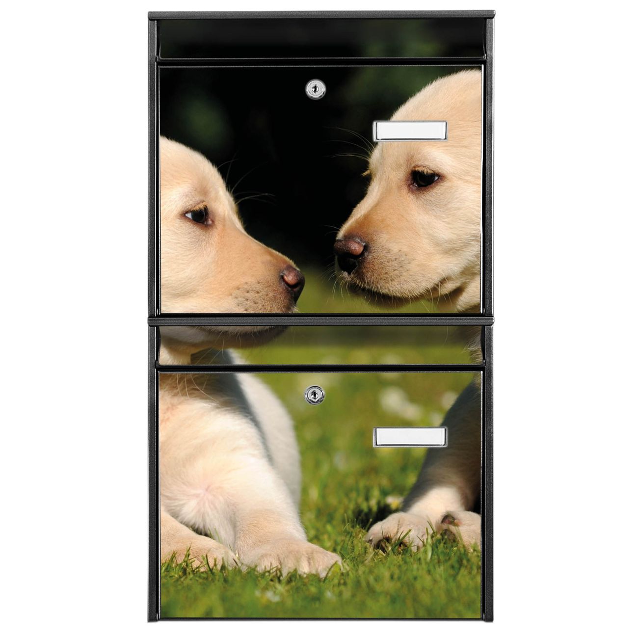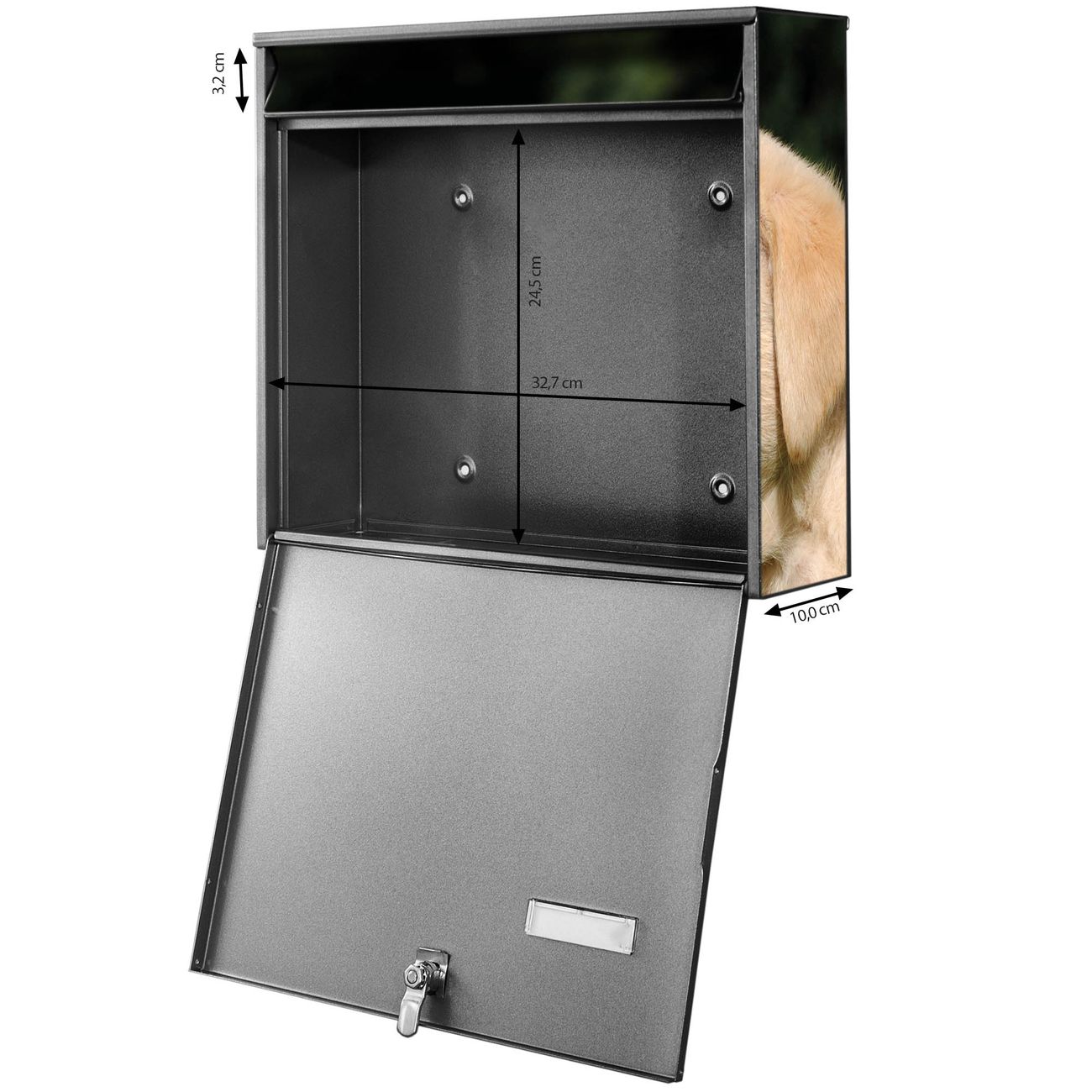 FUNKTION: Die Burg-Wächter Briefkastenanlage mit Motiv Labrador bietet Ihnen ausreichend Fassungsvermögen um auch A4 und C4 Sendungen zu empfangen. Das integrierte Namensschild lässt sich individuell beschriften. Wählen Sie aus den Grundfarben weiß, silber und schwarz. DESIGN: Die 2 Briefkästen haben ein ansprechendes und zeitloses Design, ohne dabei auf Funktionalität zu verzichten. Das Material ist sehr stabil, wetterfest und rostfrei. Durch das Motiv Labrador werden die Postkästen zu einem Blickfang. DETAILS: Die Postkästen bestehen aus verzinktem Stahl der zusätzlich mit Klarlack versiegelt wurde. Die Kästen sind gesamt 64,5cm hoch, 36,2cm breit und 10cm tief. Das Motiv besteht aus einer wetter- und UV-festen Folie, die Ihren Briefkasten zusätzlich vor Kratzern schützt. Die Postkästen werden mit Montagematerial, je einem Namensschild und je zwei Schlüsseln geliefert. NUTZEN: Das Briefkastenset eignet sich für die Wandmontage, die Größe bietet genügend Platz für Sendungen aller Art. Das zeitlose Design sowie die stabile Bauart bieten Ihnen einen treuen Begleiter für Ihre Post. BANJADO: