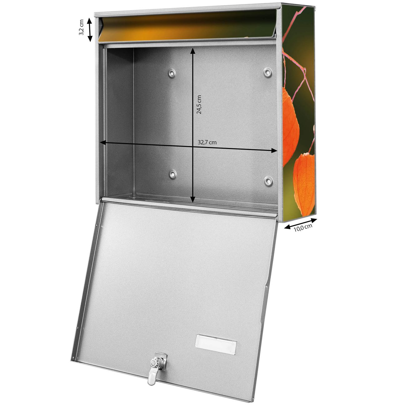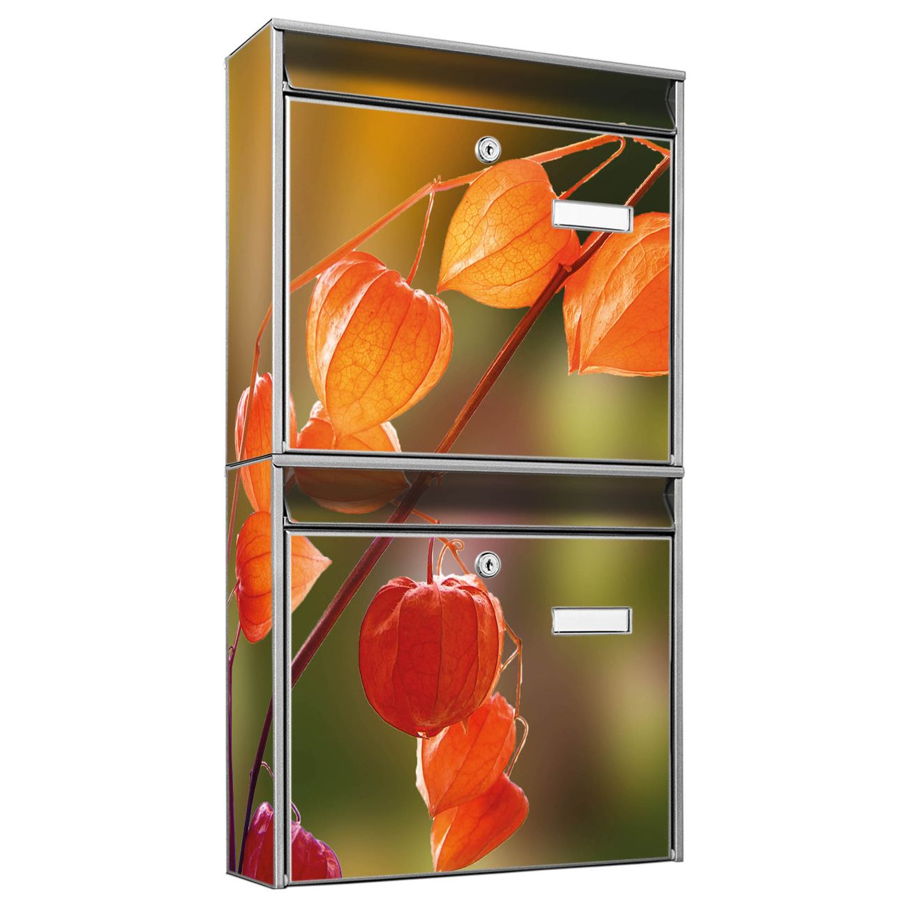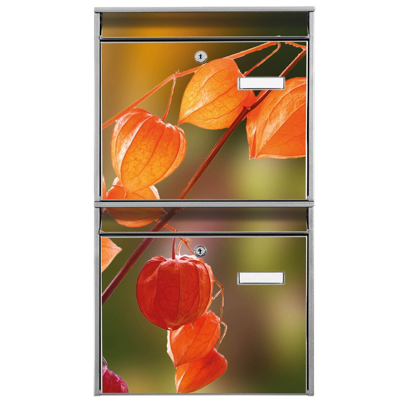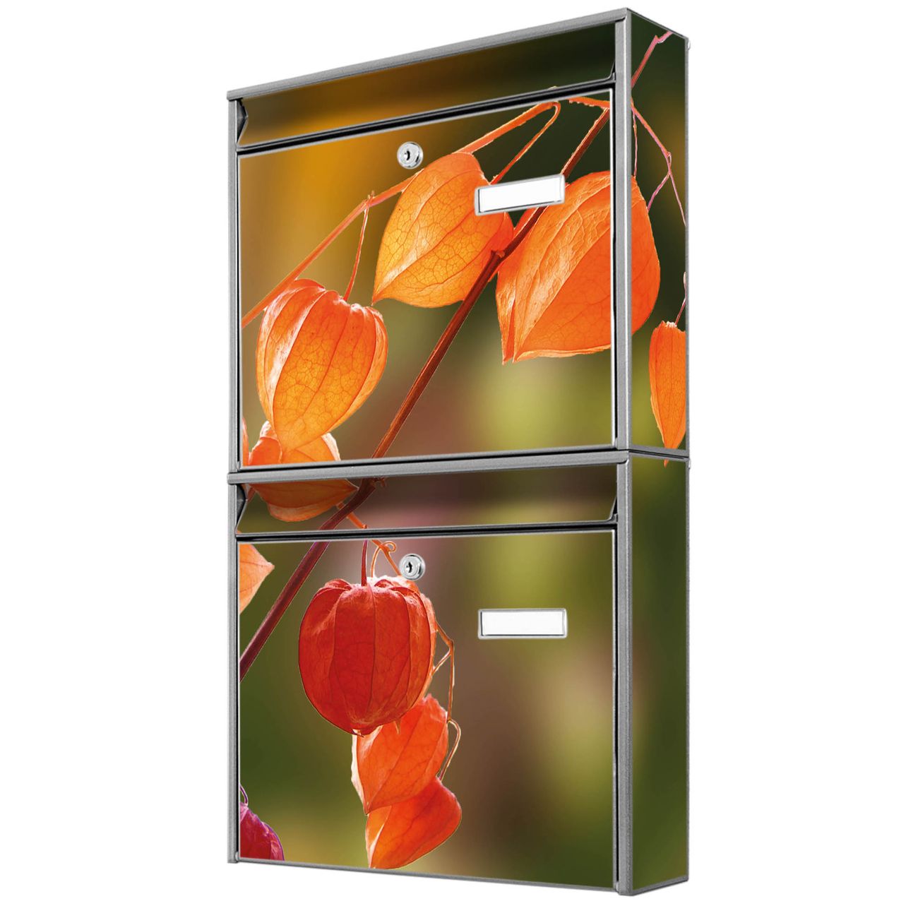 FUNKTION: Die Burg-Wächter Briefkastenanlage mit Motiv Lampionblume bietet Ihnen ausreichend Fassungsvermögen um auch A4 und C4 Sendungen zu empfangen. Das integrierte Namensschild lässt sich individuell beschriften. Wählen Sie aus den Grundfarben weiß, silber und schwarz. DESIGN: Die 2 Briefkästen haben ein ansprechendes und zeitloses Design, ohne dabei auf Funktionalität zu verzichten. Das Material ist sehr stabil, wetterfest und rostfrei. Durch das Motiv Lampionblume werden die Postkästen zu einem Blickfang. DETAILS: Die Postkästen bestehen aus verzinktem Stahl der zusätzlich mit Klarlack versiegelt wurde. Die Kästen sind gesamt 64,5cm hoch, 36,2cm breit und 10cm tief. Das Motiv besteht aus einer wetter- und UV-festen Folie, die Ihren Briefkasten zusätzlich vor Kratzern schützt. Die Postkästen werden mit Montagematerial, je einem Namensschild und je zwei Schlüsseln geliefert. NUTZEN: Das Briefkastenset eignet sich für die Wandmontage, die Größe bietet genügend Platz für Sendungen aller Art. Das zeitlose Design sowie die stabile Bauart bieten Ihnen einen treuen Begleiter für Ihre Post. BANJADO: